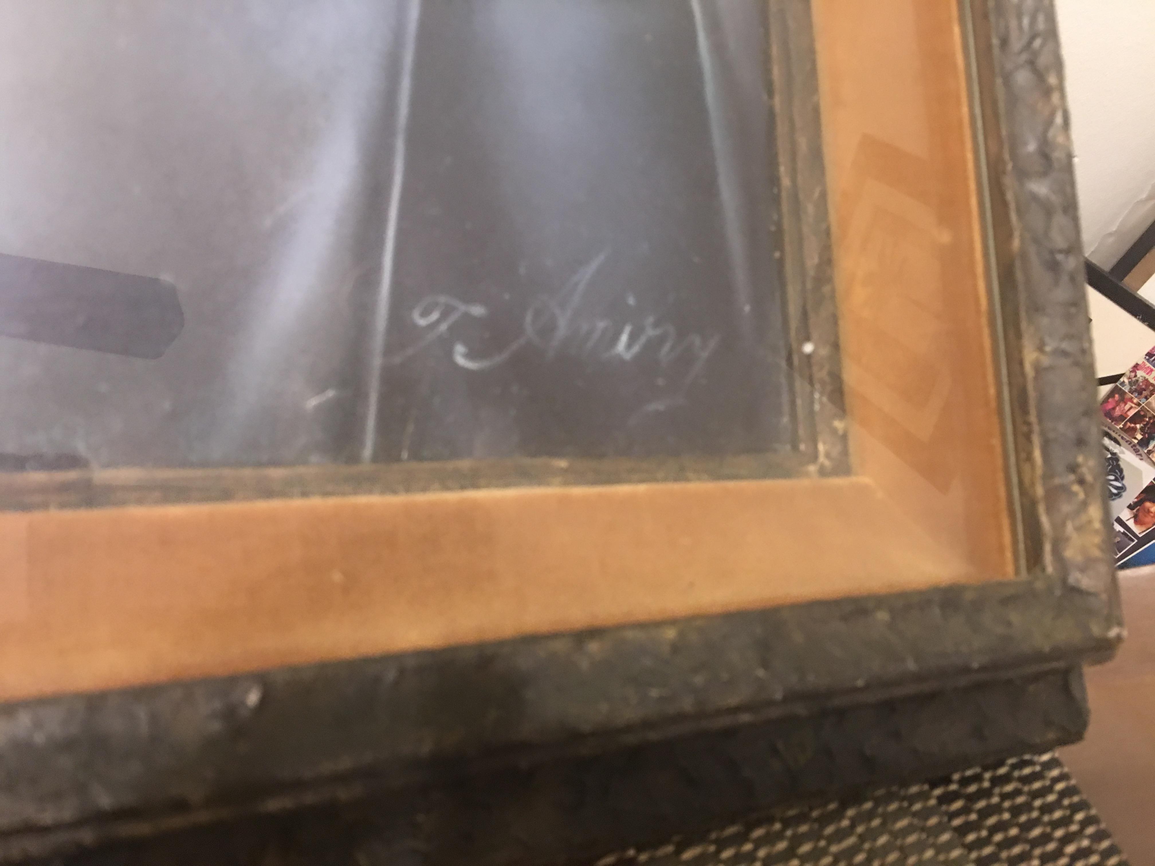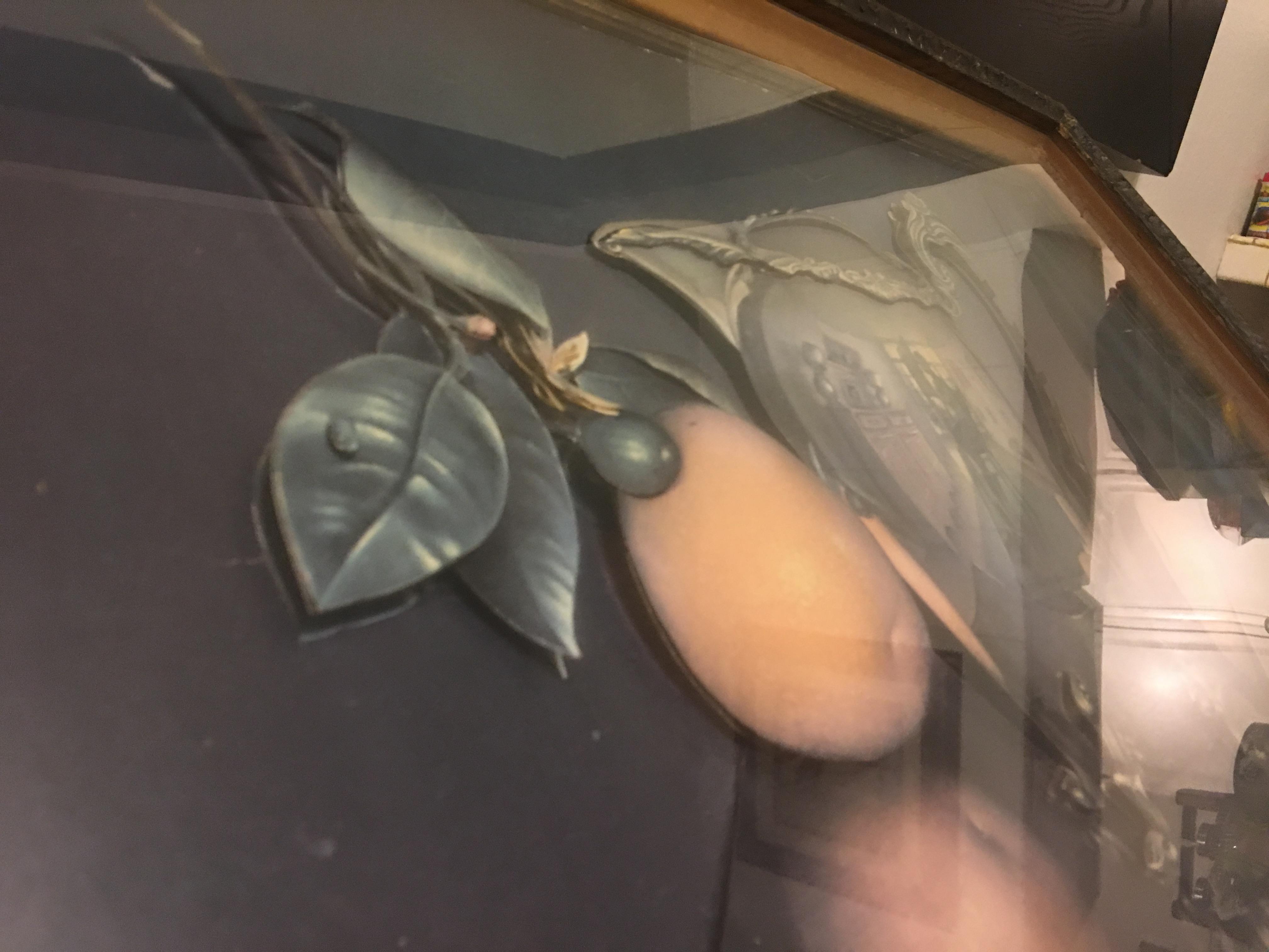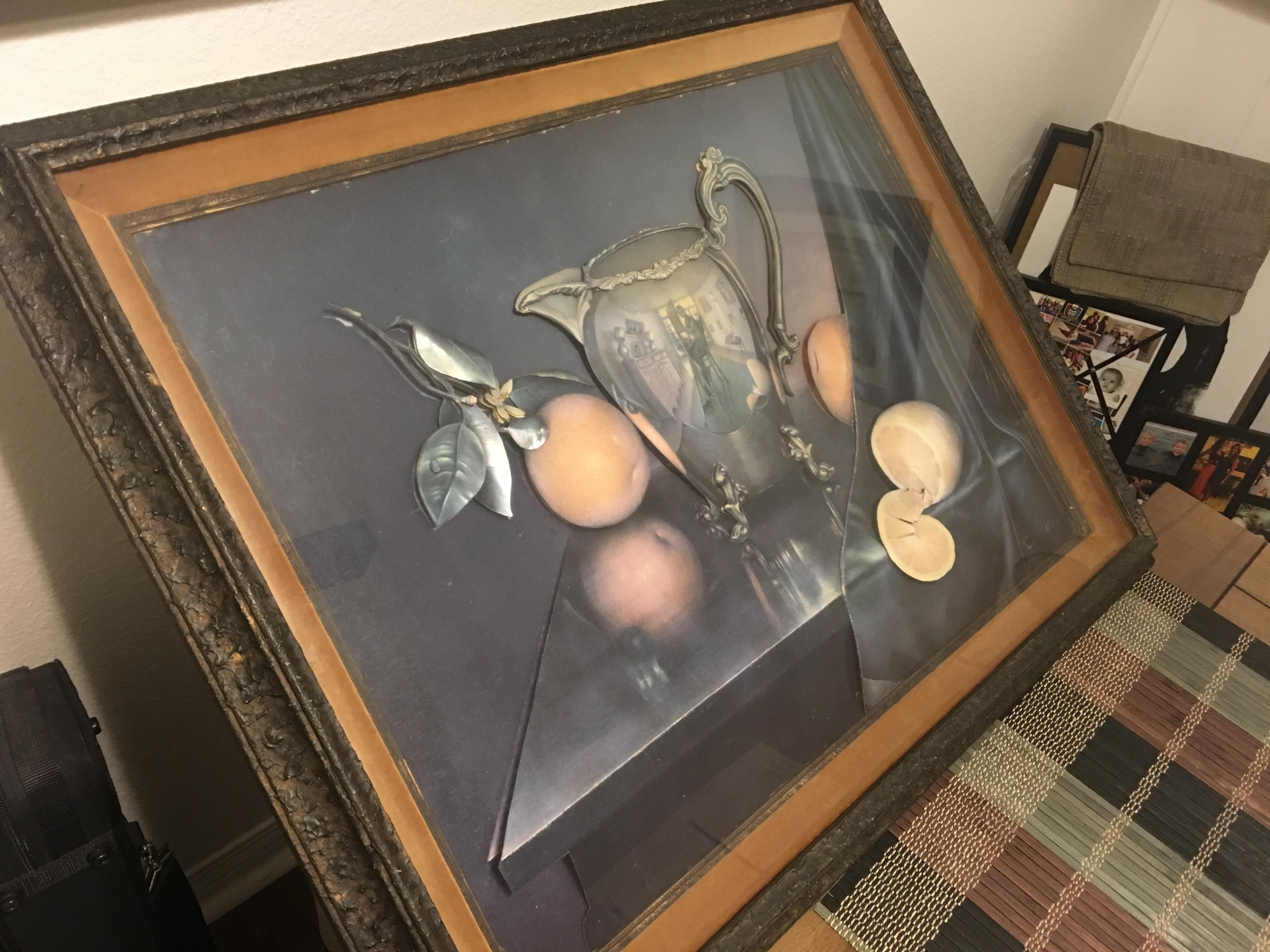 This mixed art media piece is typical Amiry, still art, fruits -orange and sliced lemon. Included in the piece is a silver pitcher with a reflection of an artist painting in a room, but unlike that of his “Reflection in a studio”, the room in this piece is not the studio. The frame appears to be vintage and with signs of aging.