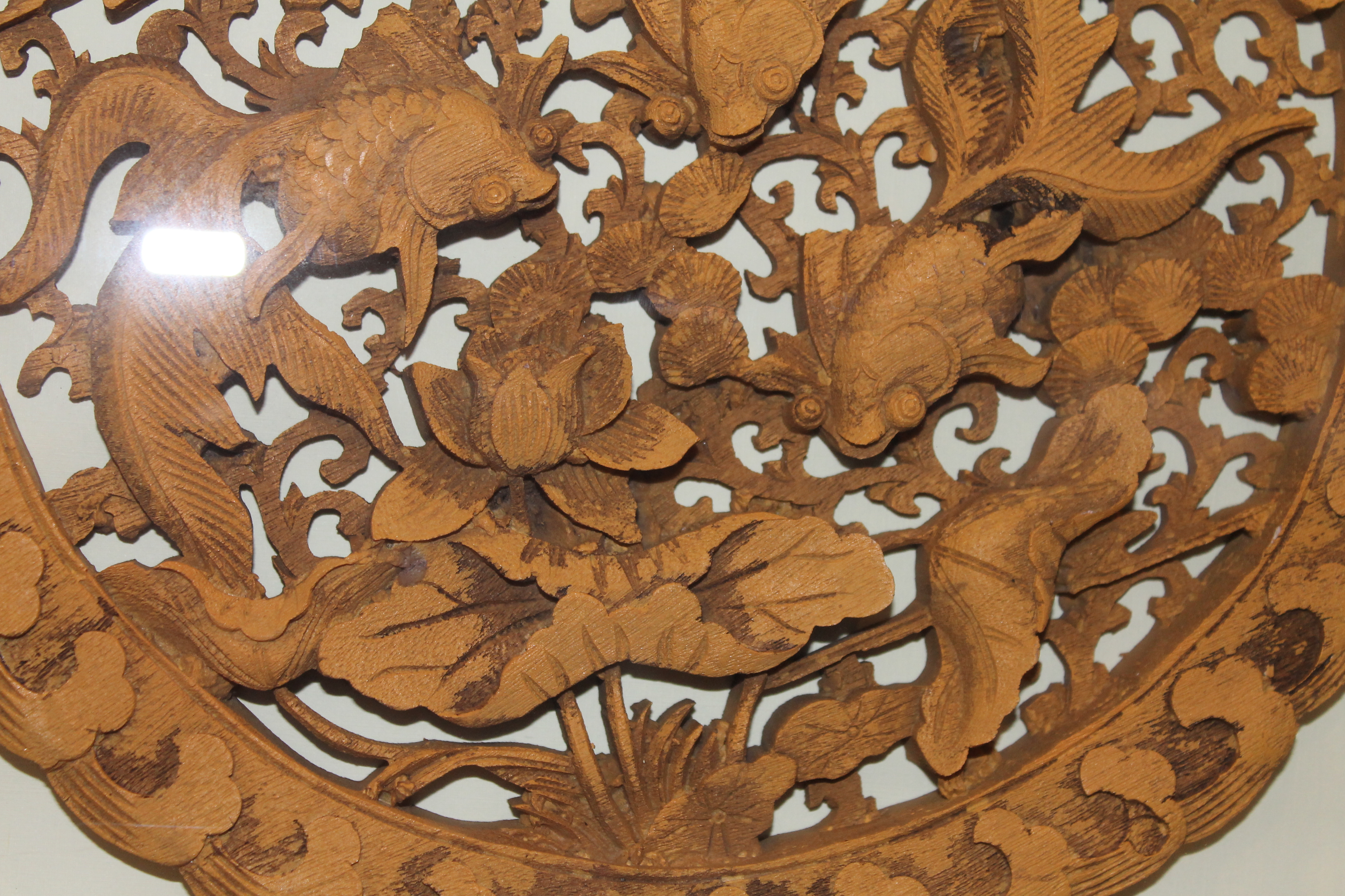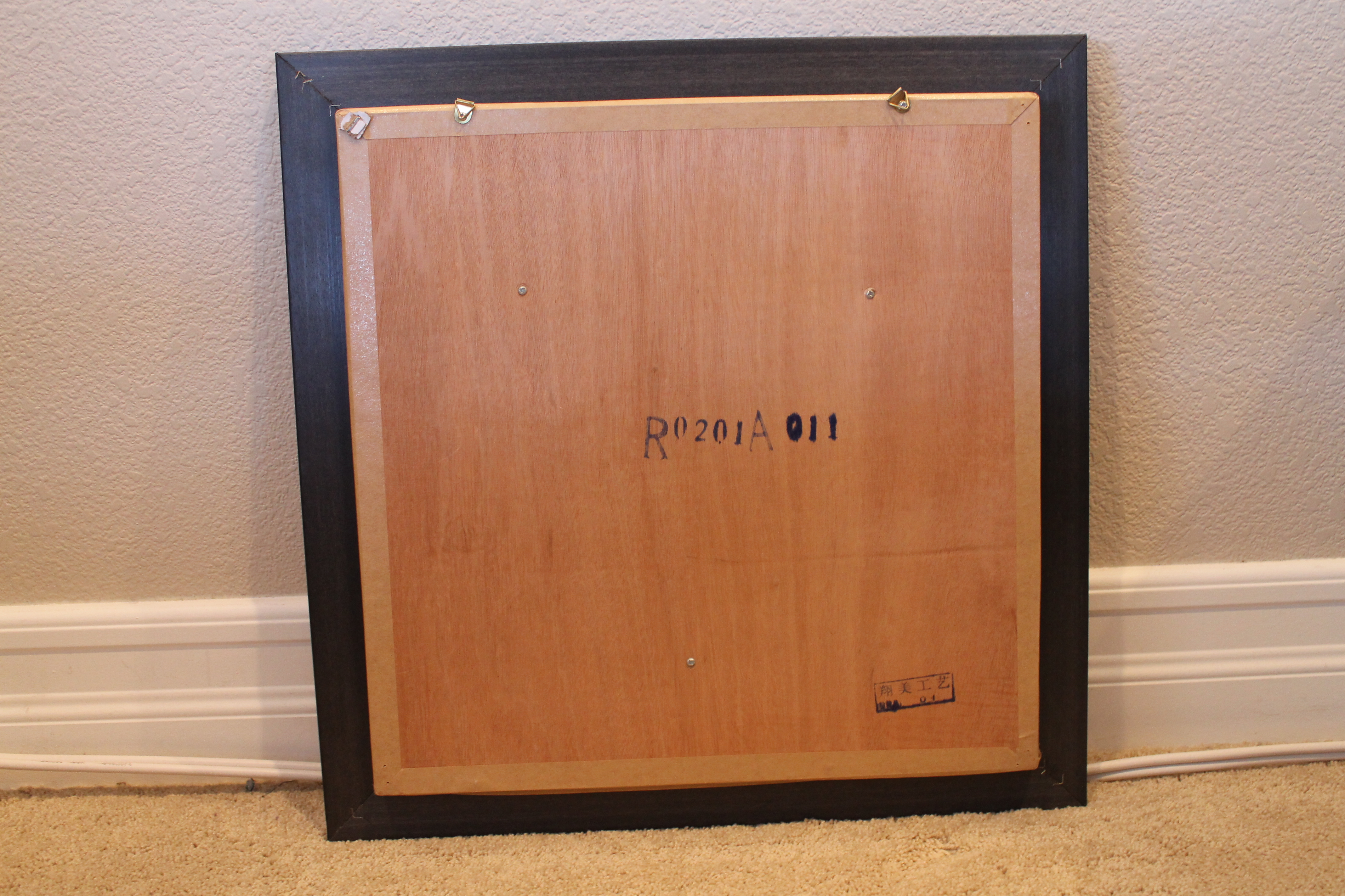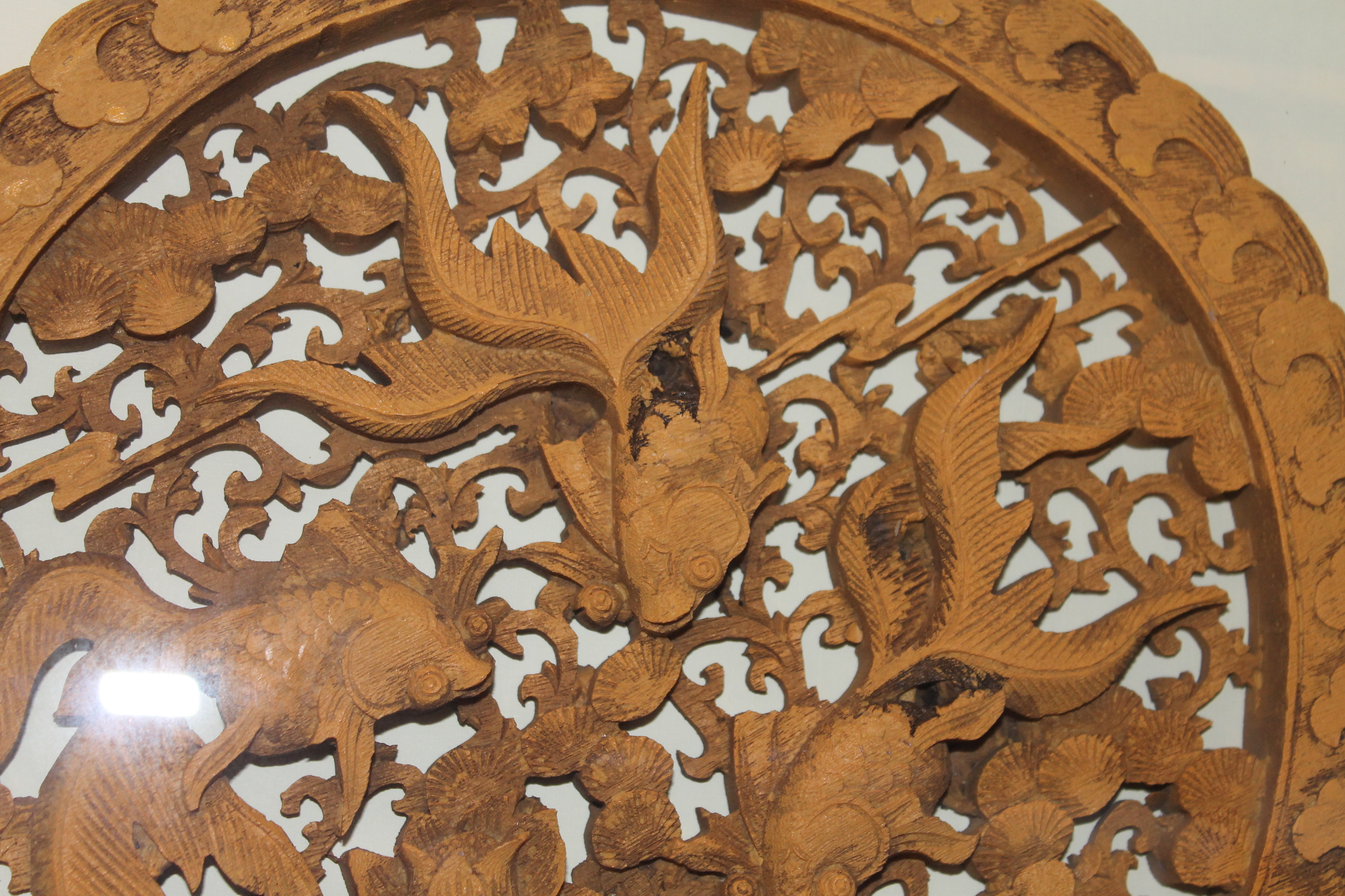Chinese wood carved framed art with glass covering 19 1/2 x 19 1/2 inches in size. The circular wood carving is approximately 11 inches. The frame seems to be a dark colored resin type, with a decorative matting inside. The back is wood and held with 3 small screws with two attached hangers. Weight is approximately 12 pounds.