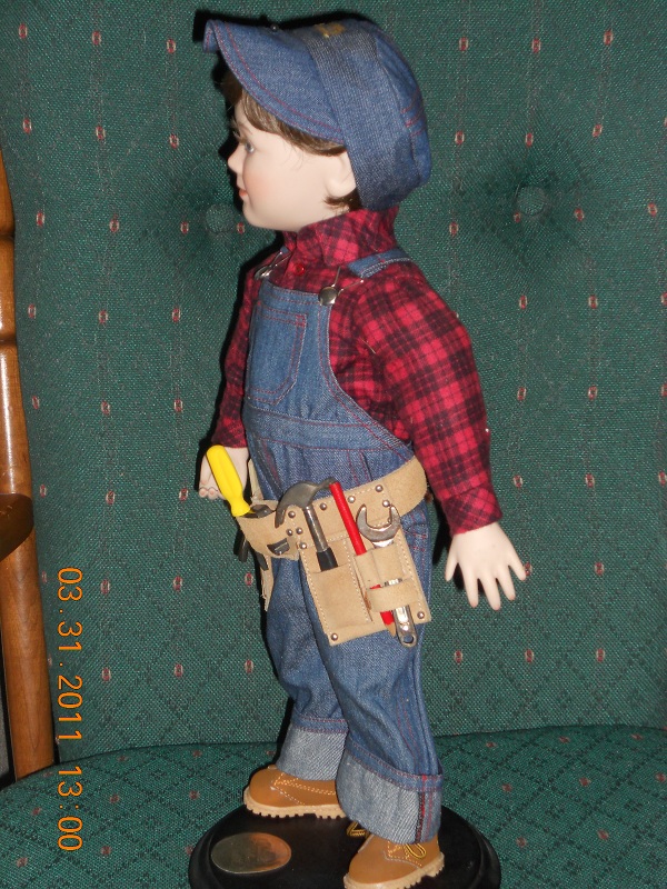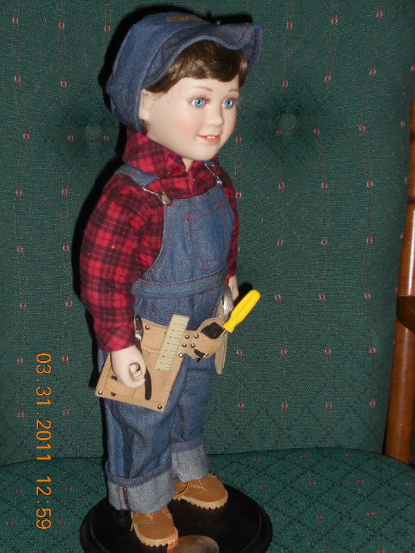 The doll is a figurine of a handyman, equipped with a cap, clothing including bib overalls, rad and black plaid shirt, tan work boots and a leather toolbelt affixed around the waist of the doll, tied in back with what appears to be a round brown shoelace tied in a bow knot. The toolbelt contains a wrench, pliers, hammer, screwdriver, tape measure, ruler and pencil.