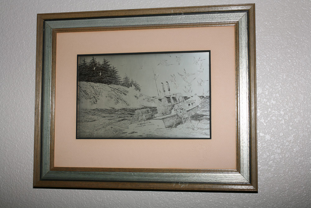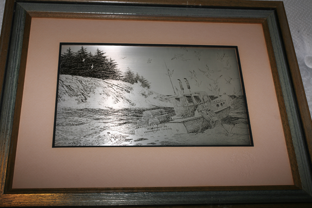 This is a Sterling Silver piece of Jamie Wyeth's art. It is titled "Coast of Maine" and has a Certificate of Authenticity pasted on the back. It is a very nice looking piece. I listed it as excellent because I really have nothing to compare it to. It could very well fall into the mint condition. It is matted and framed.
