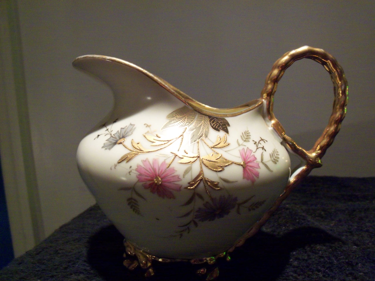 When my friend's were moving down south in 1995 they knew they couldn't take everything from their old house. Friends were invited over to take what they wanted. I spied this beautiful HUGE sugar and creamer set and couldn't resist.He said he thought it was part of a tea set his grandmother had but wasn't 100% sure. He figured it was from around 1910 or a little before. Pink and purple flowers (zinnias?) with gold and gold trim on handles, feet and rim or lip. No cracks or chips. A bit dusty because I'm afraid to really wash them. Franz Walter and Carlsbad under the name in reddish brown on the bottom of both. Number on it appears to be 904 but then the 9 could be a lower case g. Both have the same number so I'm assuming they were fired as part of a set.