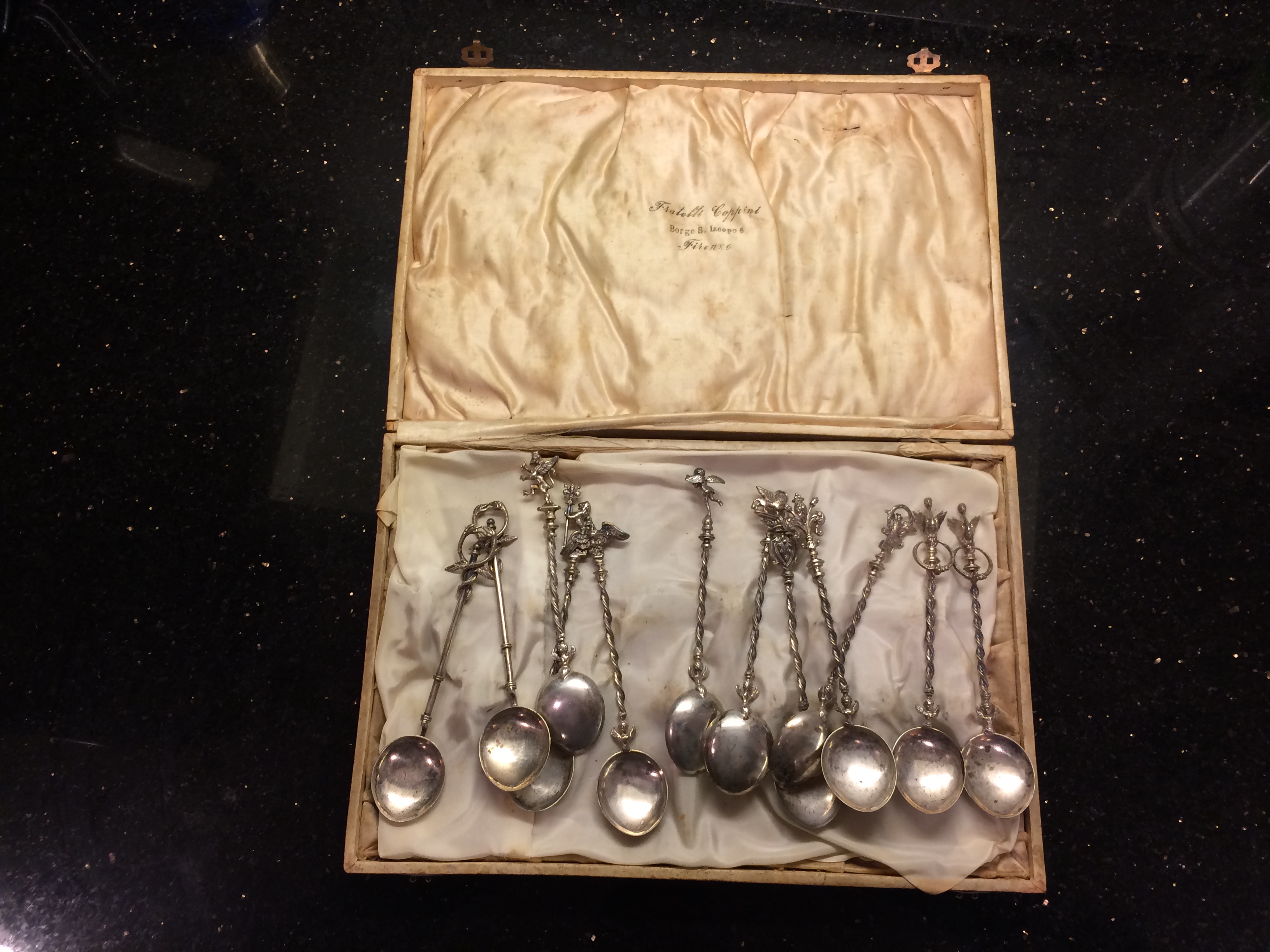 Spoon set from my wife's grandparents. We have had it in the closet for a while, since they passed almost ten years back. We are moving and are wondering what they are worth. They seem nice, from Fratelli Coppini (Florence). We assume they were purchased during the 40s or 50s when my wife's family was stationed in Europe.