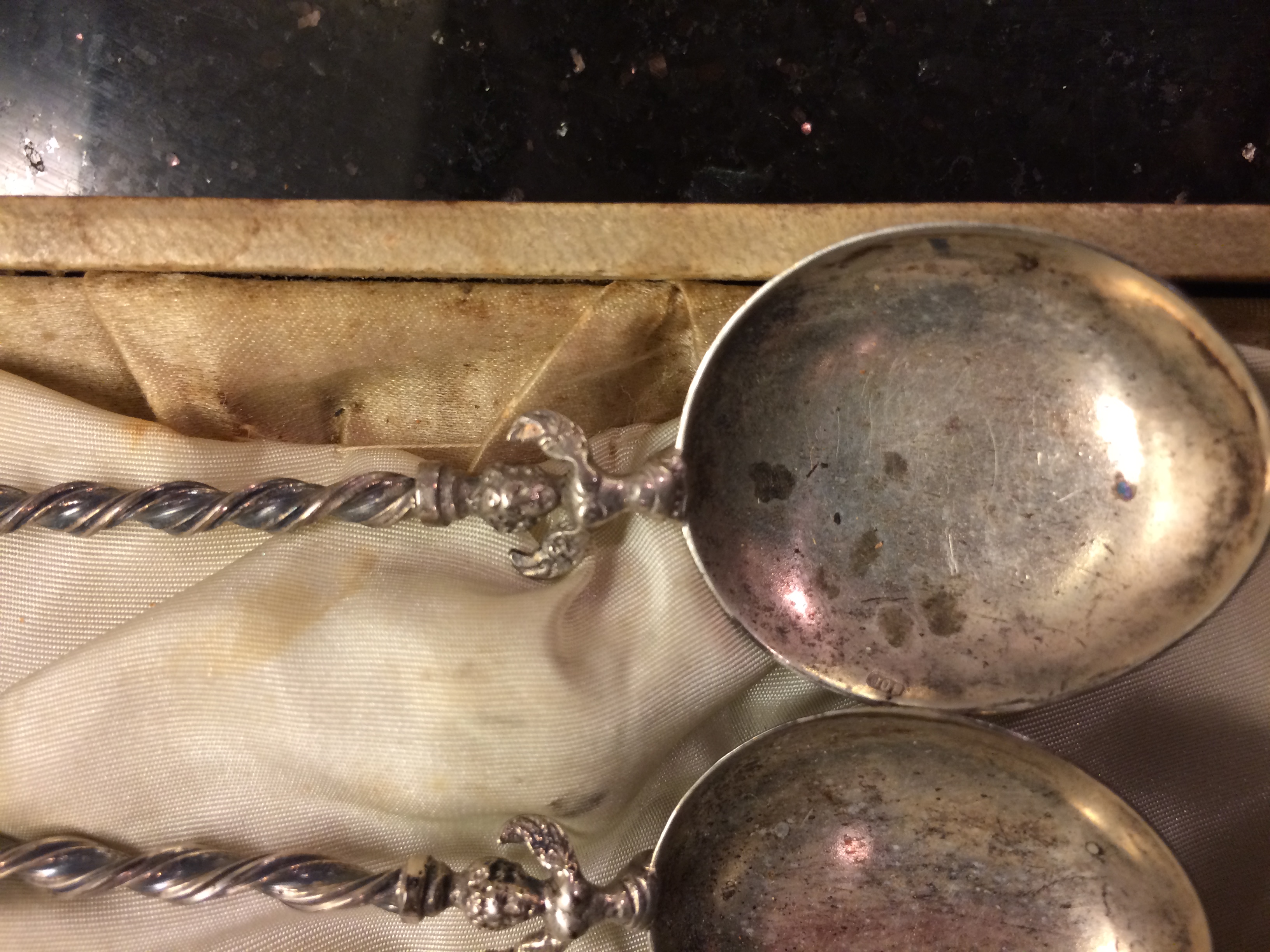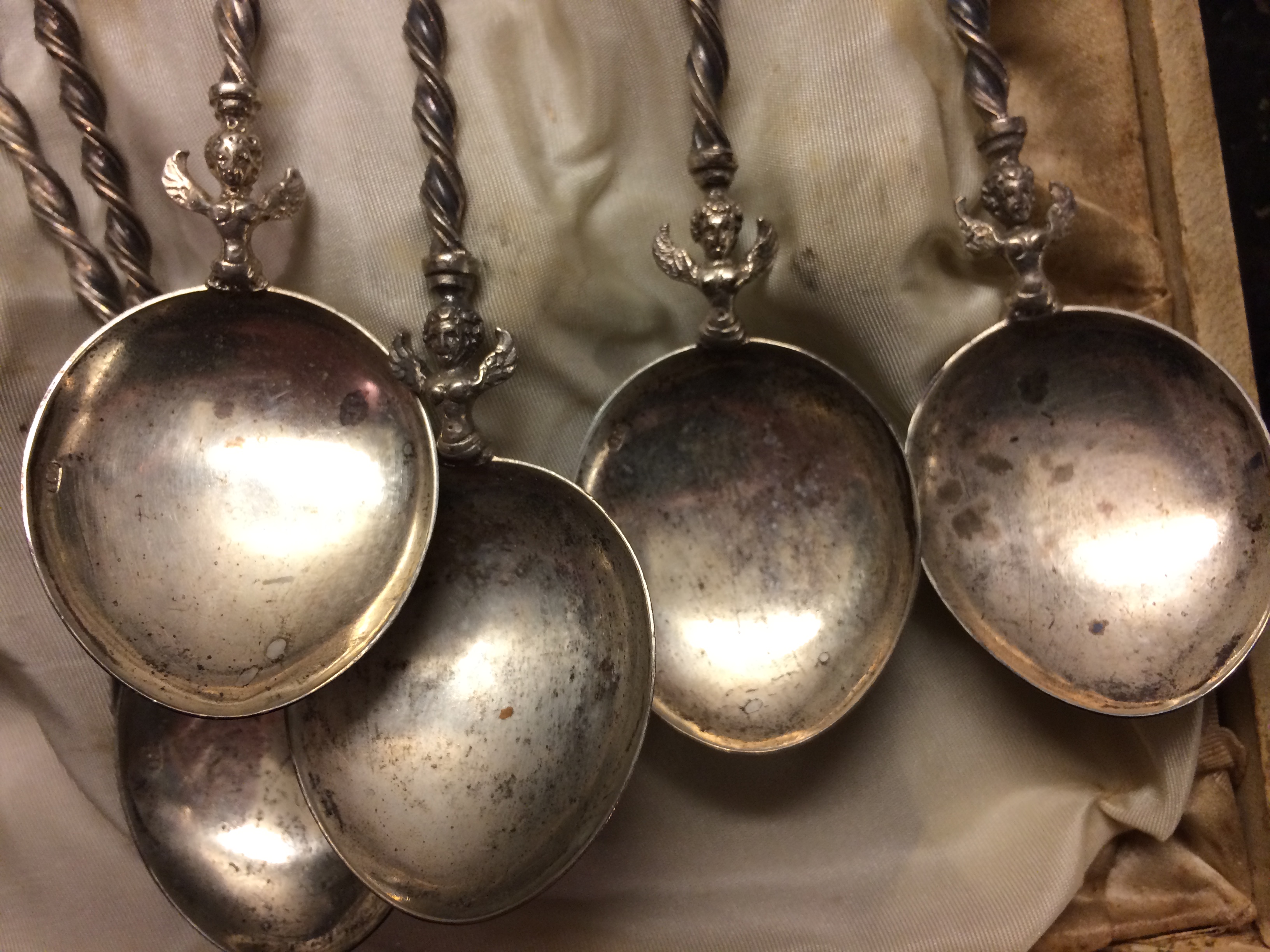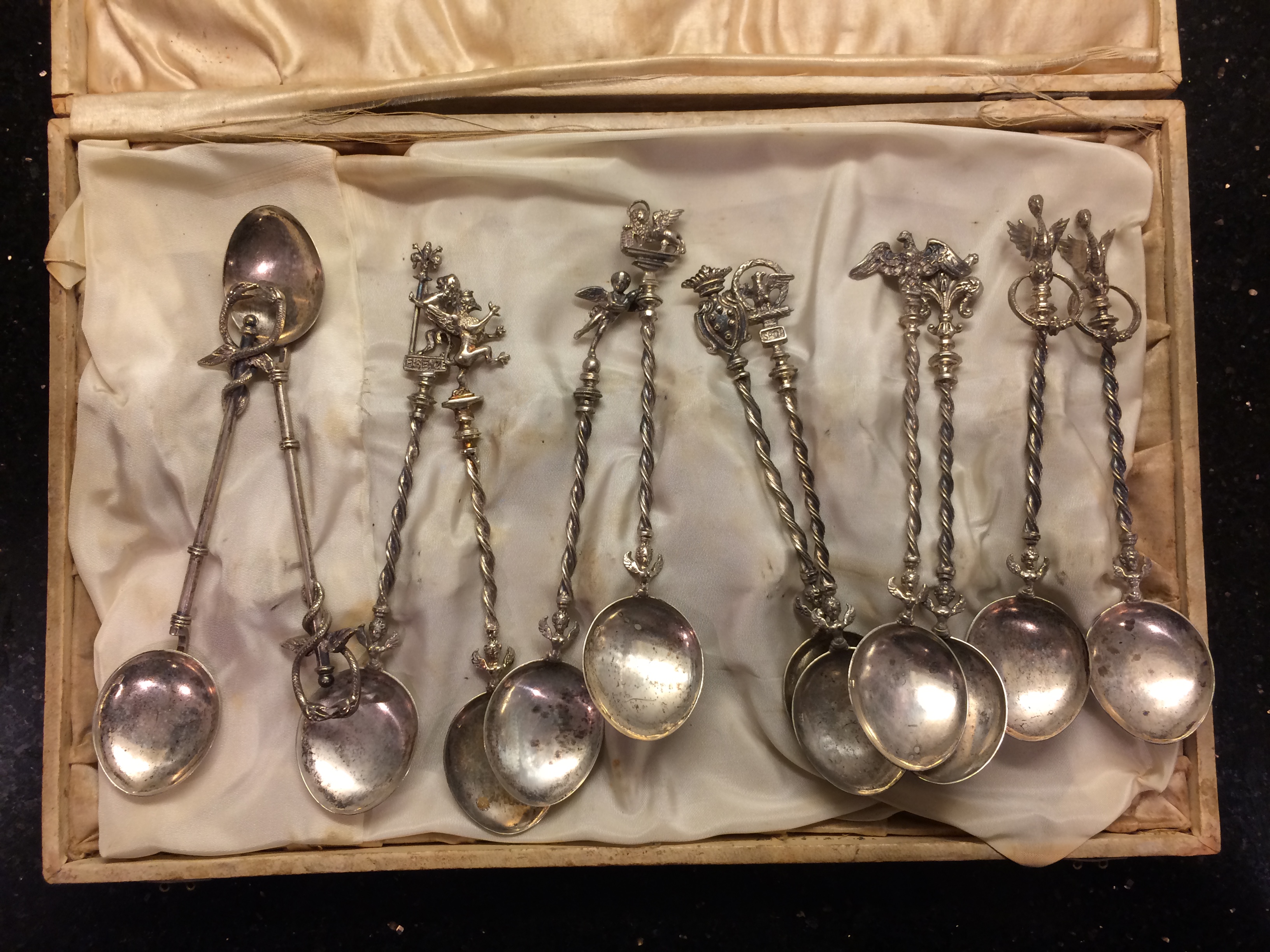 There are 12 total spoons in the set in what appears to be the original box (which has seen better days). The spoons themselves look to be in fine condition, no denting or any damage.