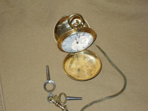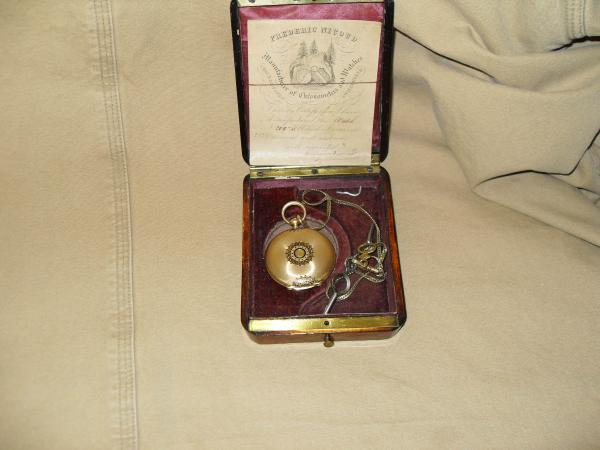 Frederick Nicoud, #20975, gold pocket watch with original case, certification, chain & keys. Statestamp of Neuchatel, Switzerland