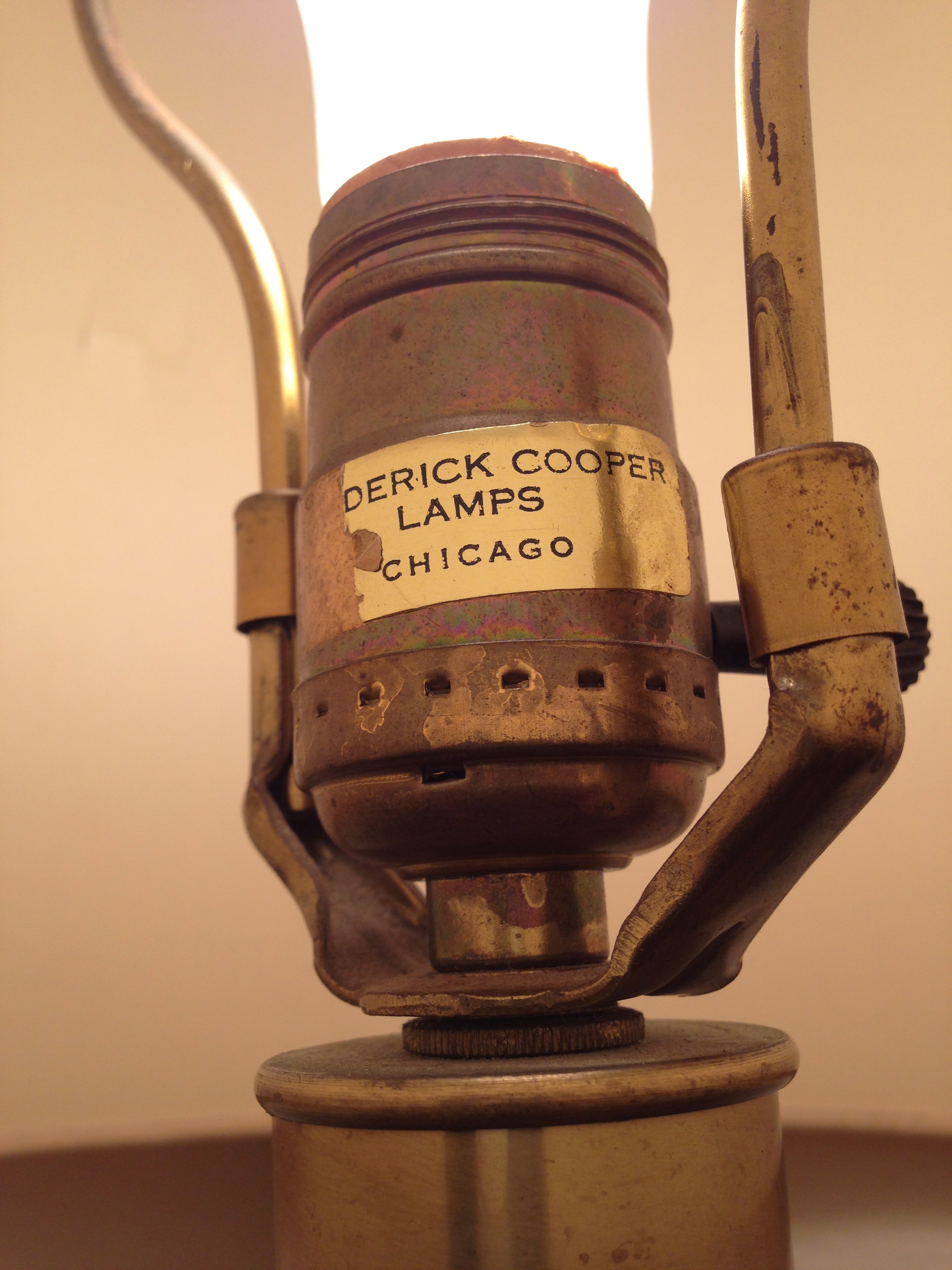 I recently came across this amazing Frederick Cooper Lamp. It's HUGE. The lamp itself, including bulb elements is over 2 feet tall and with the enormous shade, (which I think is original to the lamp), it's about a meter or higher. Looks like original cable and wiring as well. Only half of the "Frederick Cooper Lamps, Chicago" label remains. If anyone knows anything about this great lamp, please let me know. I can't seem to find anything like it on antique sites or eBay. Thanks!