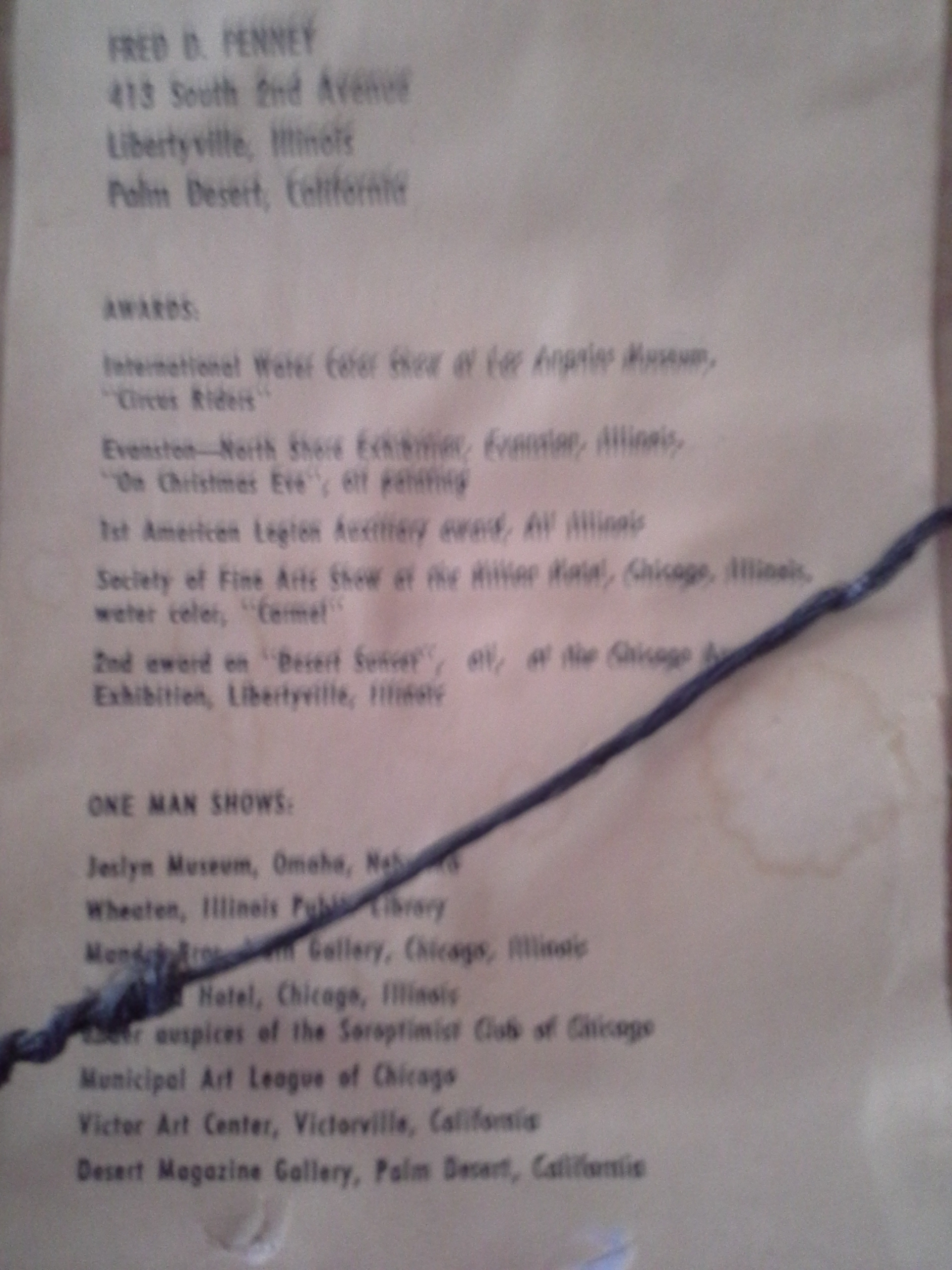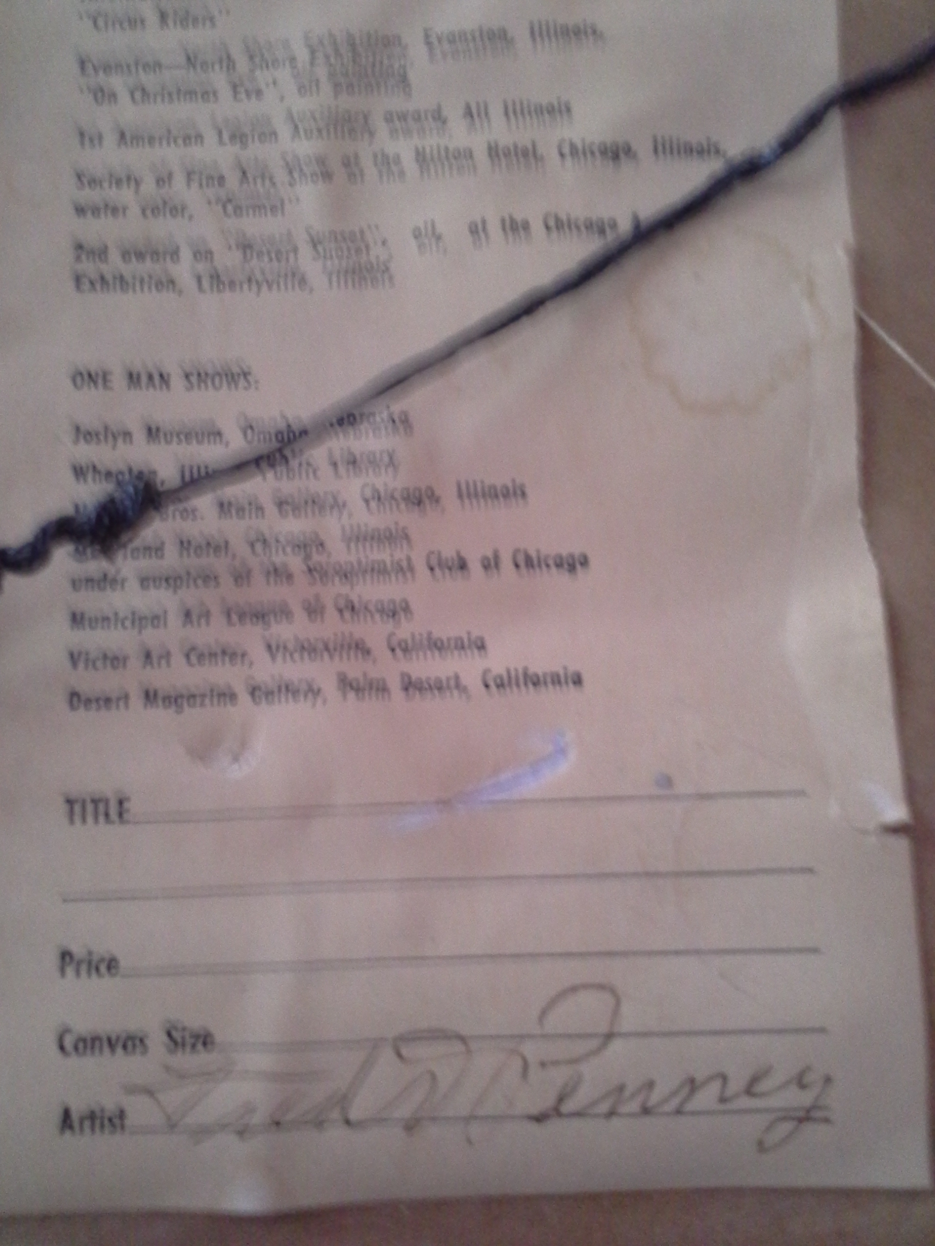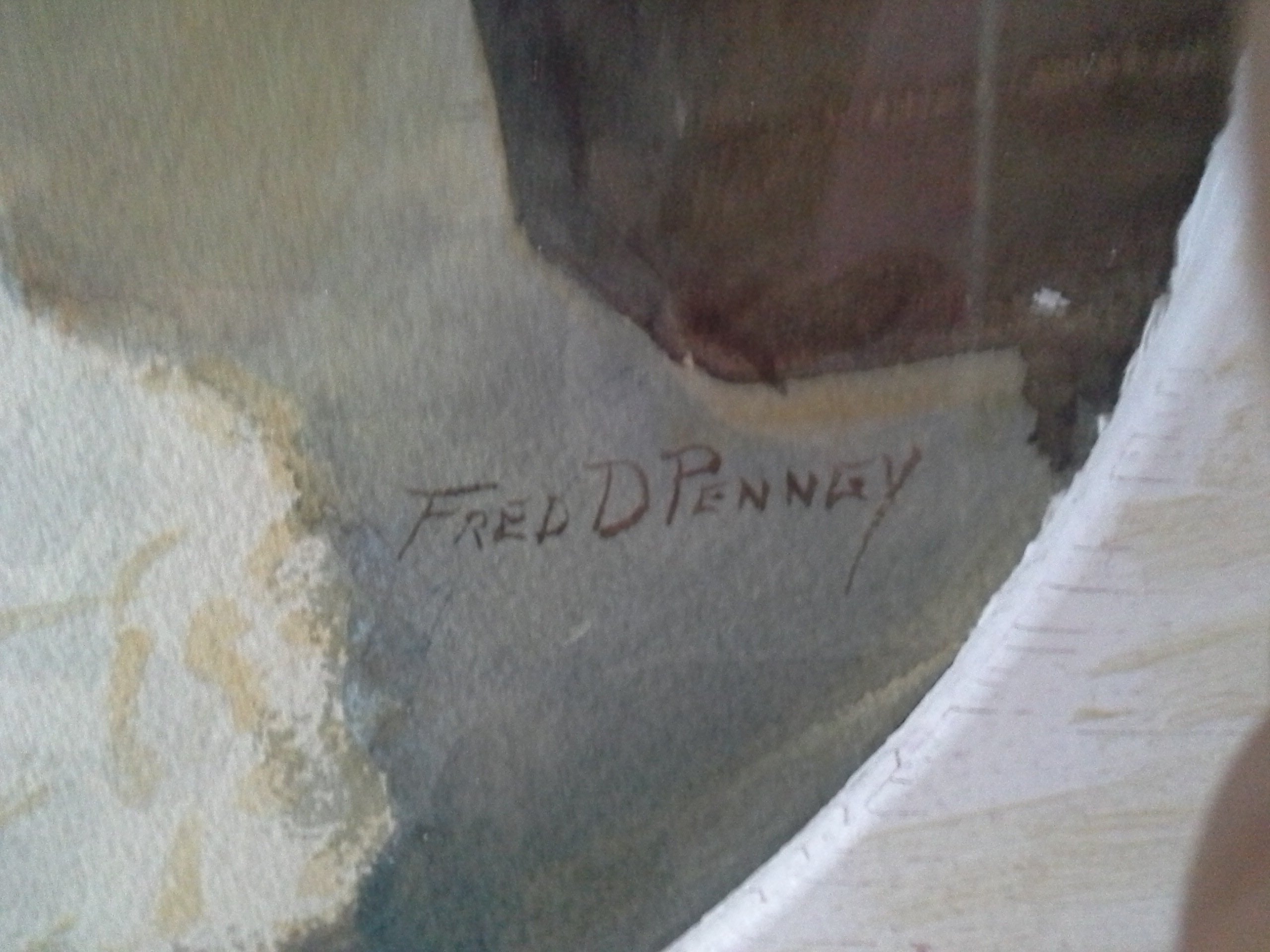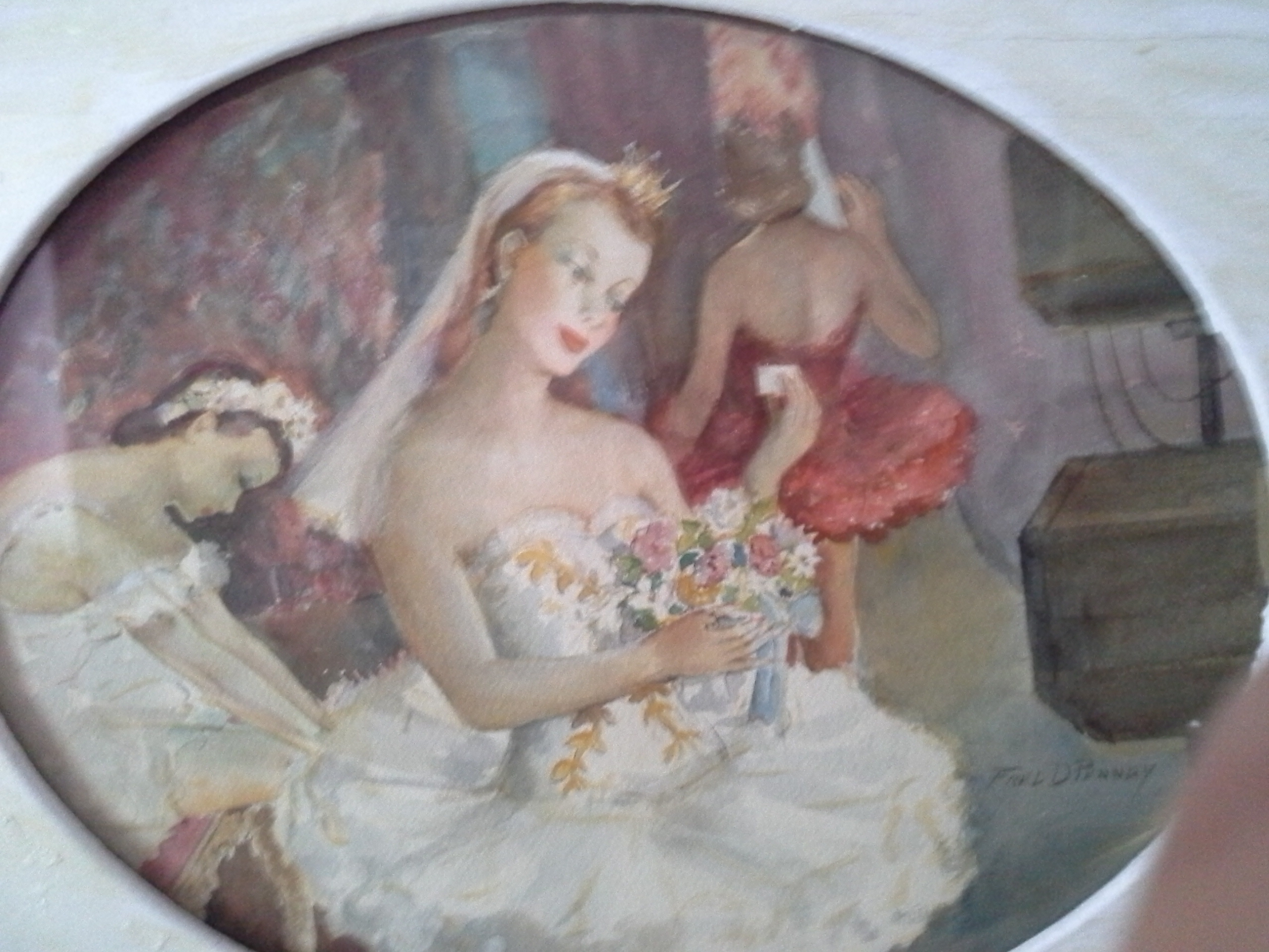 Oval watercolor of prima ballerina by Fred Penney in original frame. Frame has some carved corners missing and was painted white. The actual painting is oval shaped and the back contains a short biography of Penney and what appears to be a pencil artists signature...please see photos. Painting measures app. 20 inches at its widest. Frame measures 25" wide by 21" tall. Glass is intact, paper backing has been removed and taped. Please see photos of BACK of frame which has some issues but also depicts the original wood. I have done some research on the artist who passed away in 1988. I was raised in the Chicago suburbs and acquired this painting in the 1980's from a friend who received this from her grandfather, an apparent friend of the artist while he lived and worked in a northwest suburb of Chicago, Illinois. Any idea of the value?? Highly interested in any comments