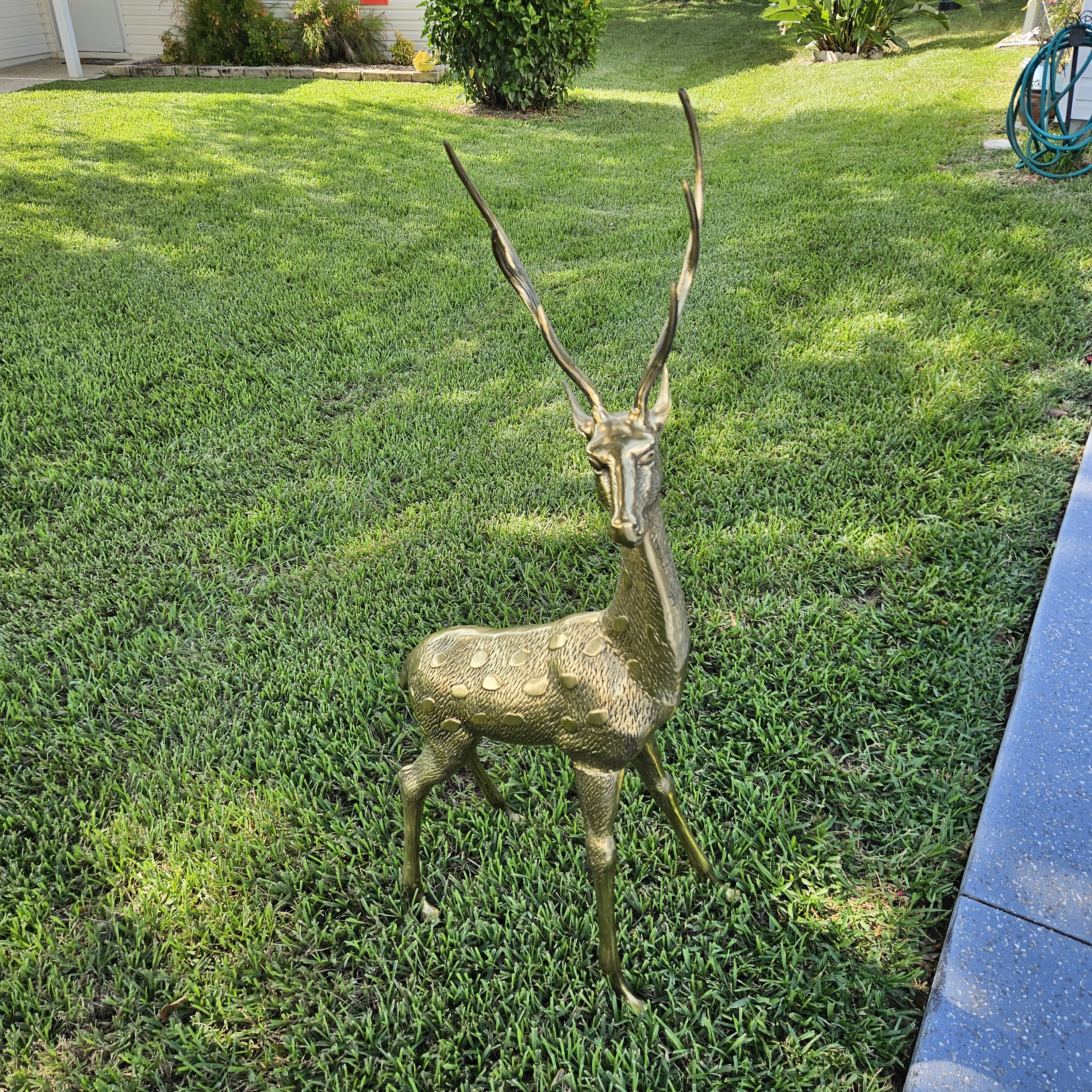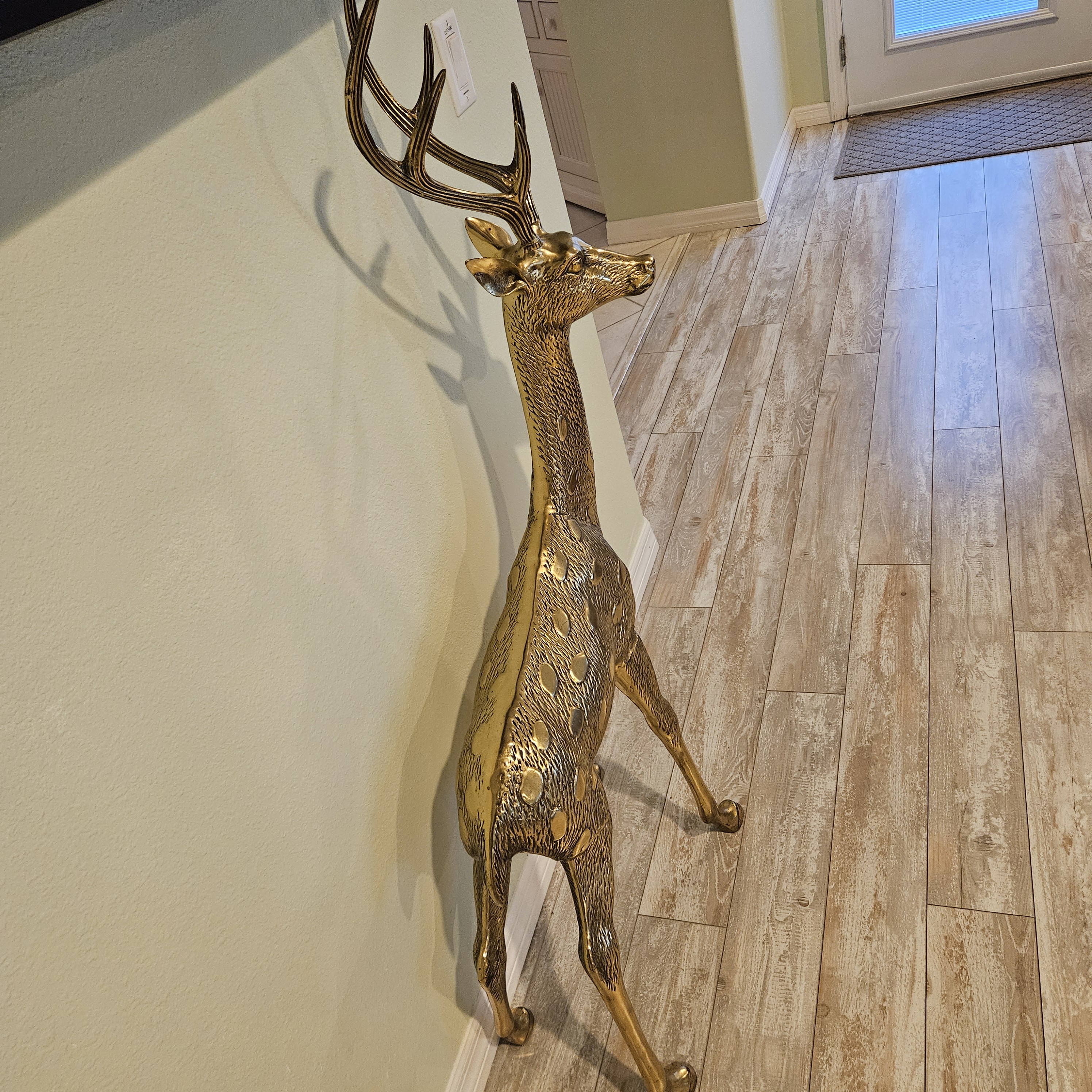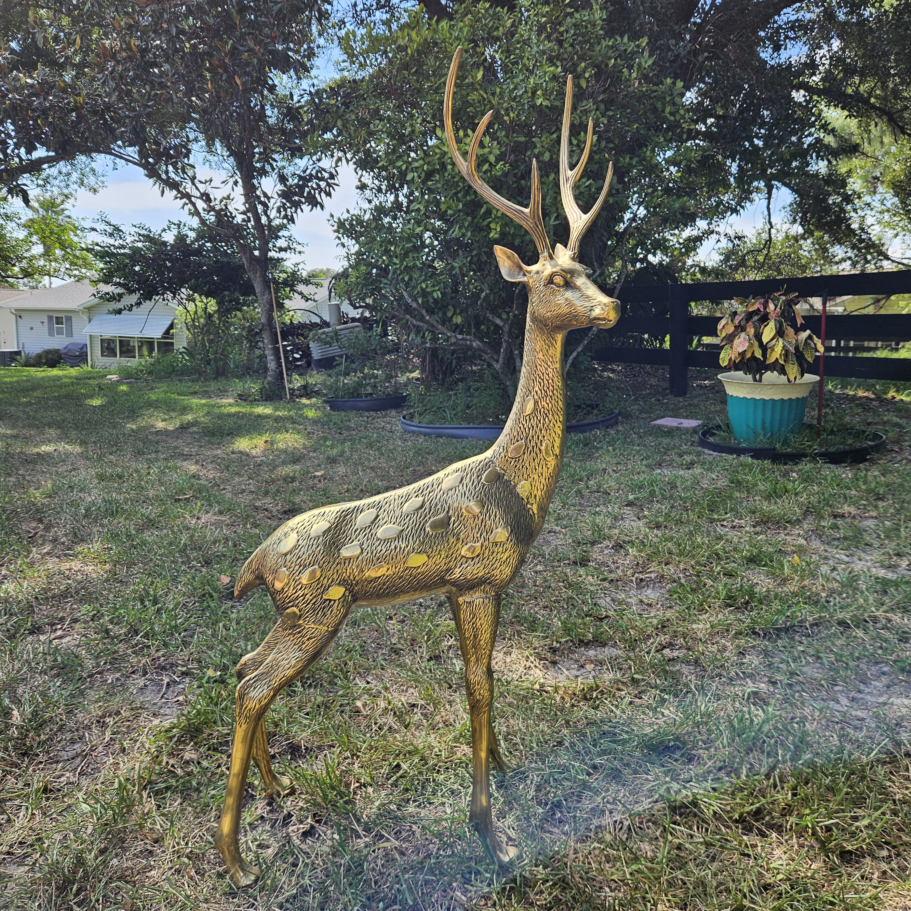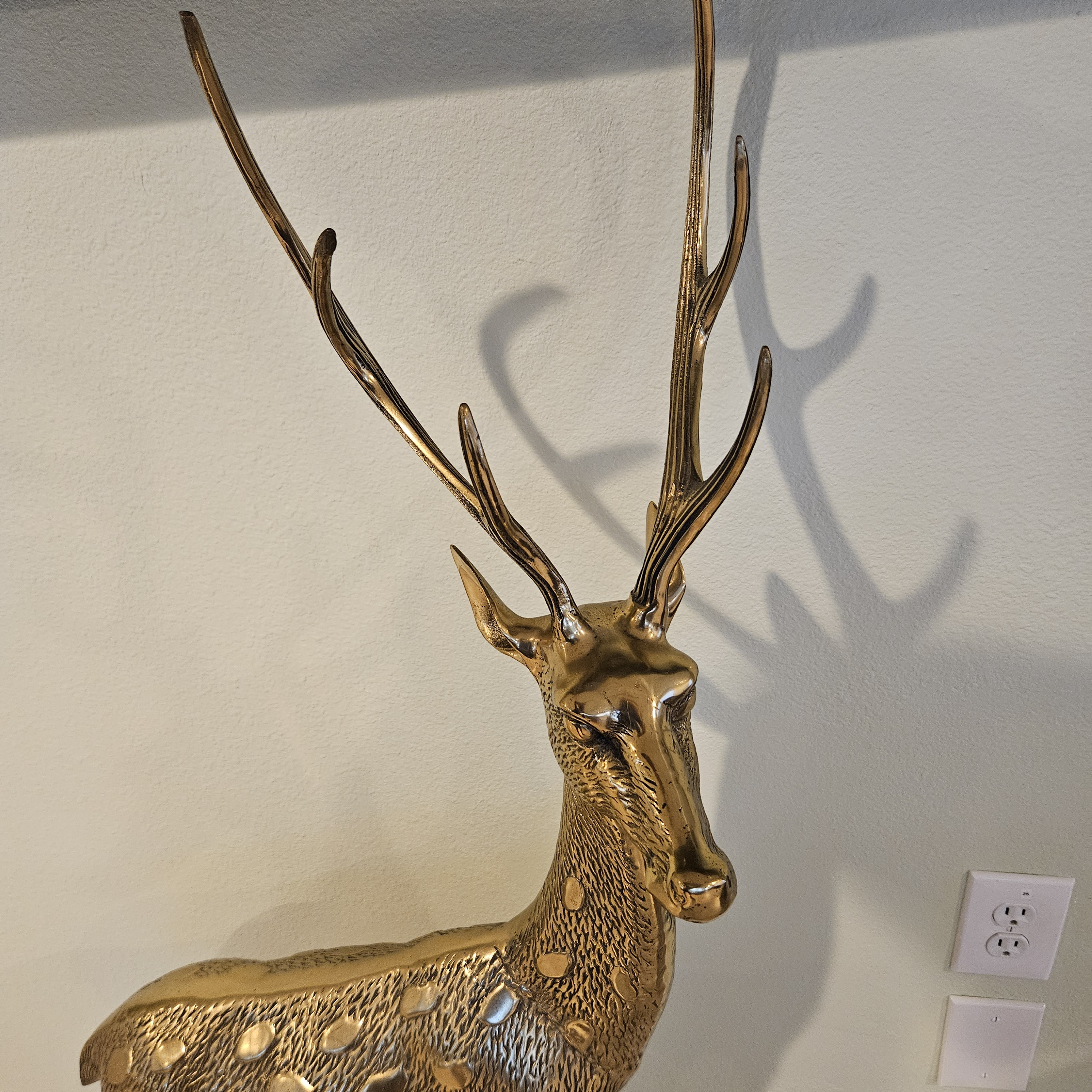 This is a large mid-20th-century solid brass deer sculpture, almost certainly crafted for decorative interior display. Sculptures like this were popular imports in the 1960s–1980s, often made in India or Hong Kong for high-end department stores and boutiques in the U.S., especially in design-conscious markets like New York City.