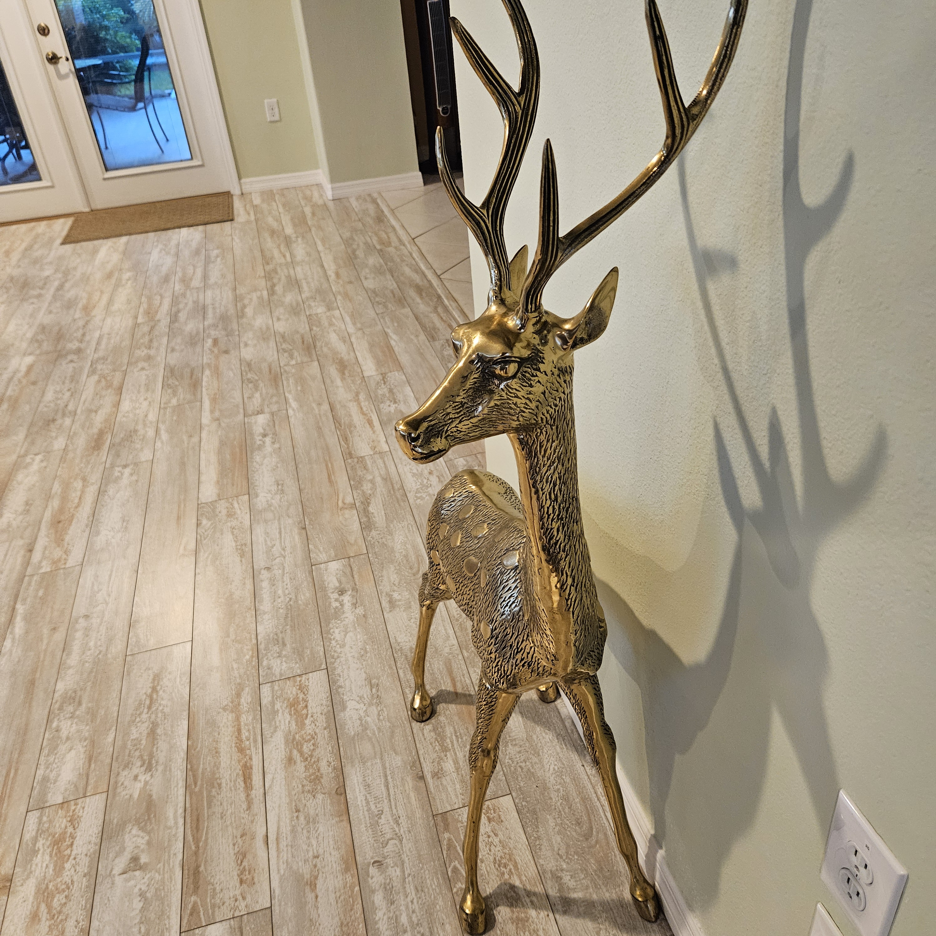 This is a very nice brass free standing deer. there are no scratches or dings on the finely textured and beautifull deer sculpture. There are no markings or indications of who produced this item that I can locate. I do know that it was purchased over forty years ago at a shop in New York City.