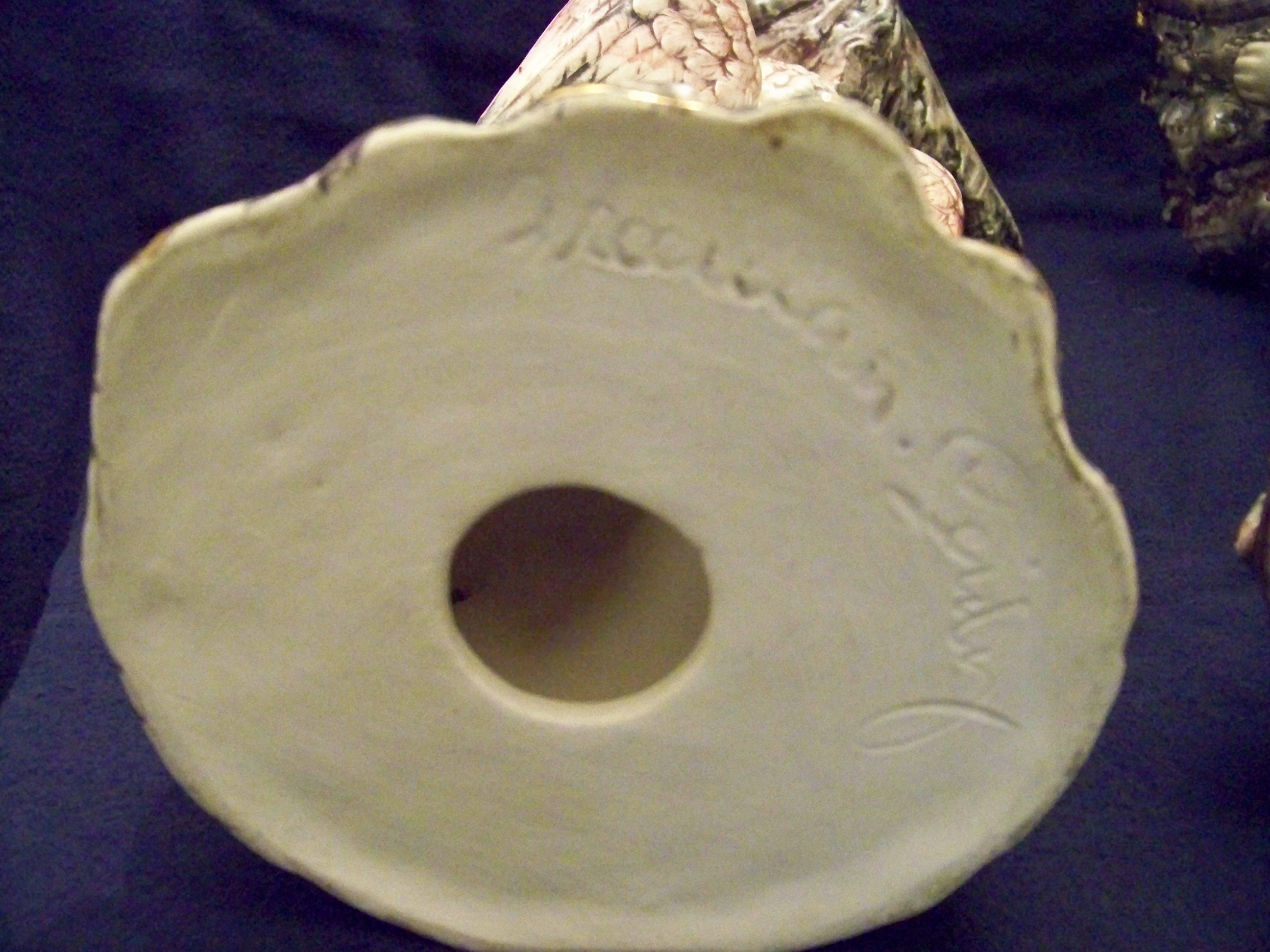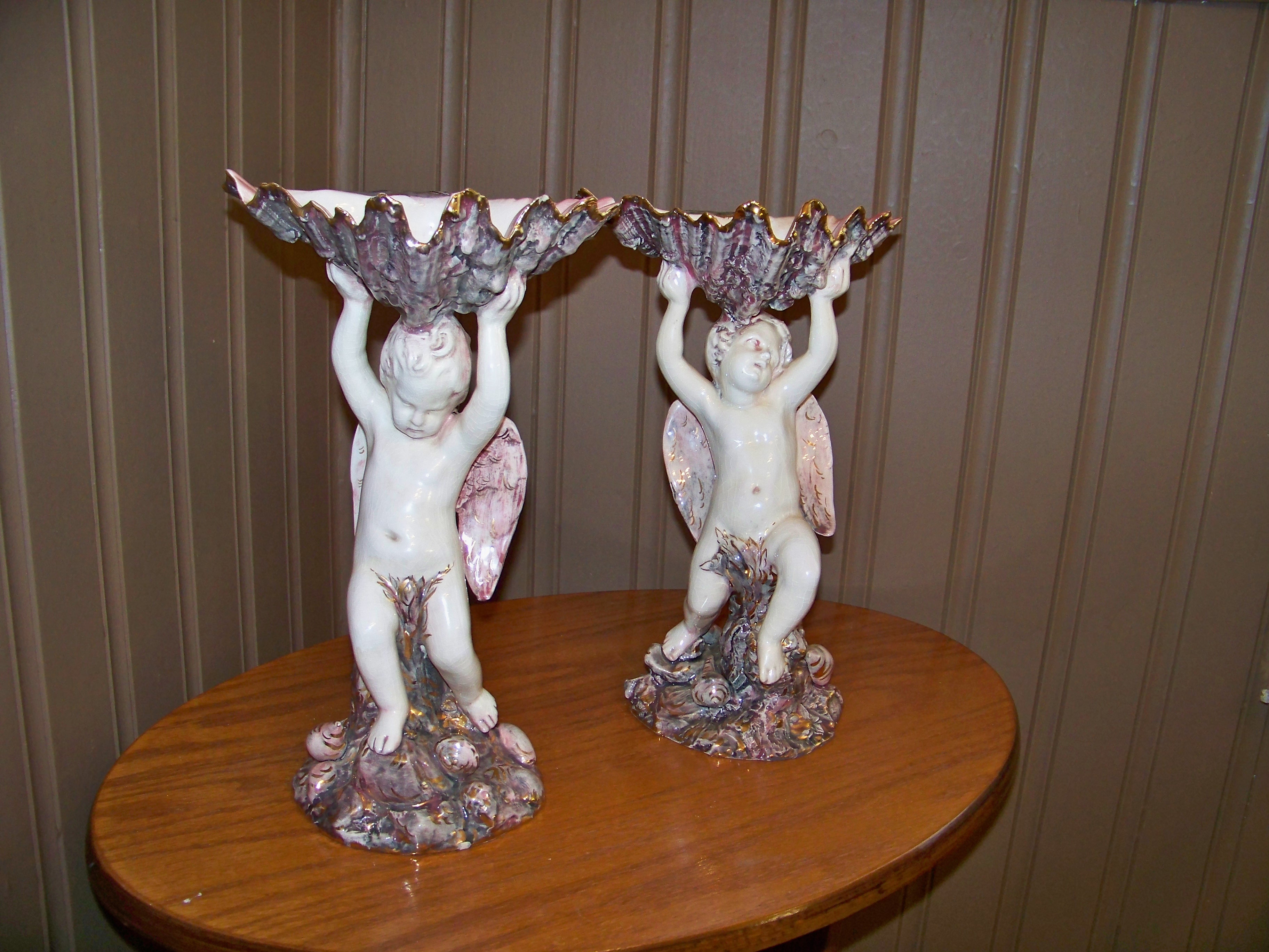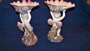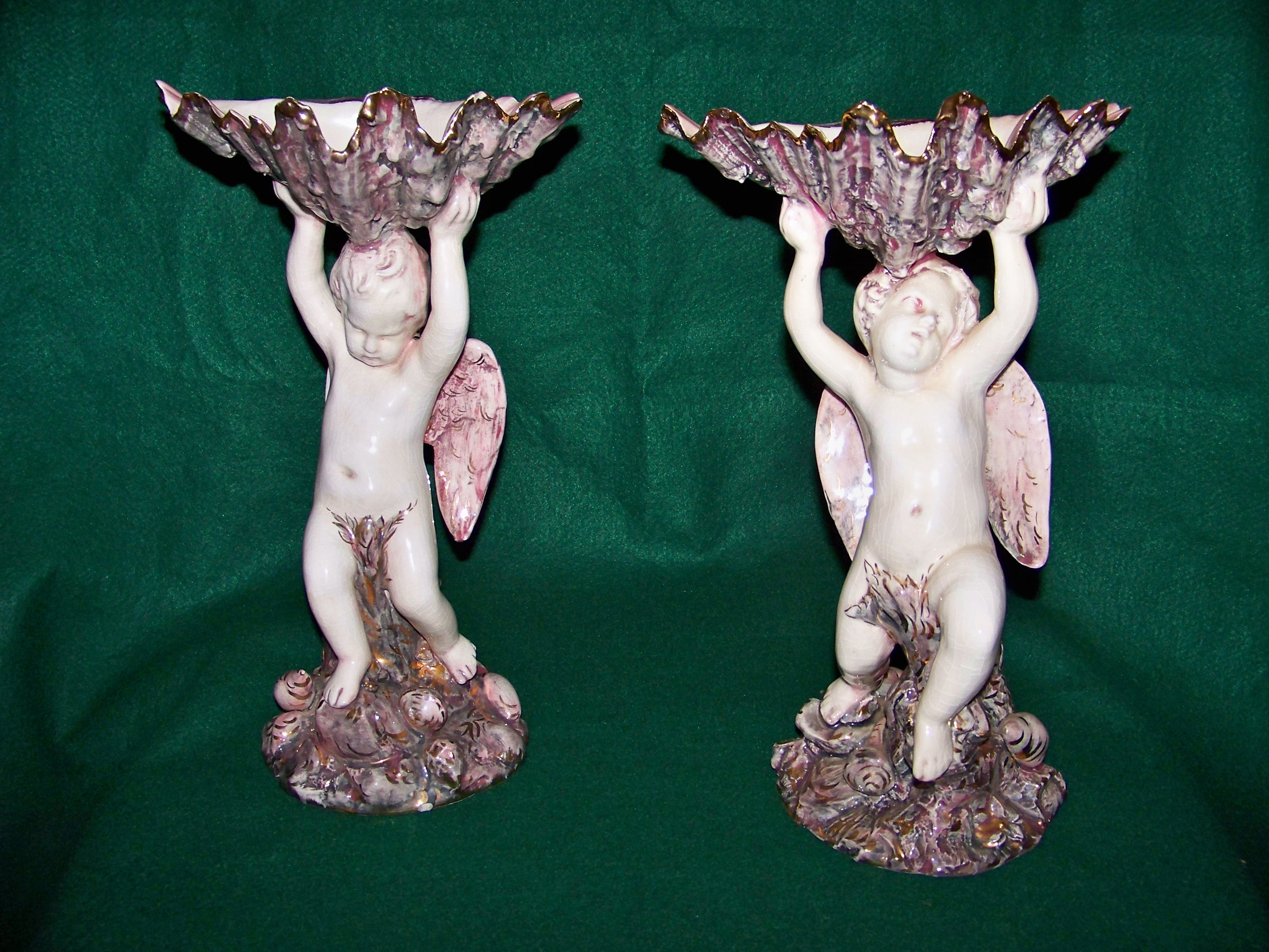 Beautiful cherubs holding up a sea shell. These appear to be of the majolica style.