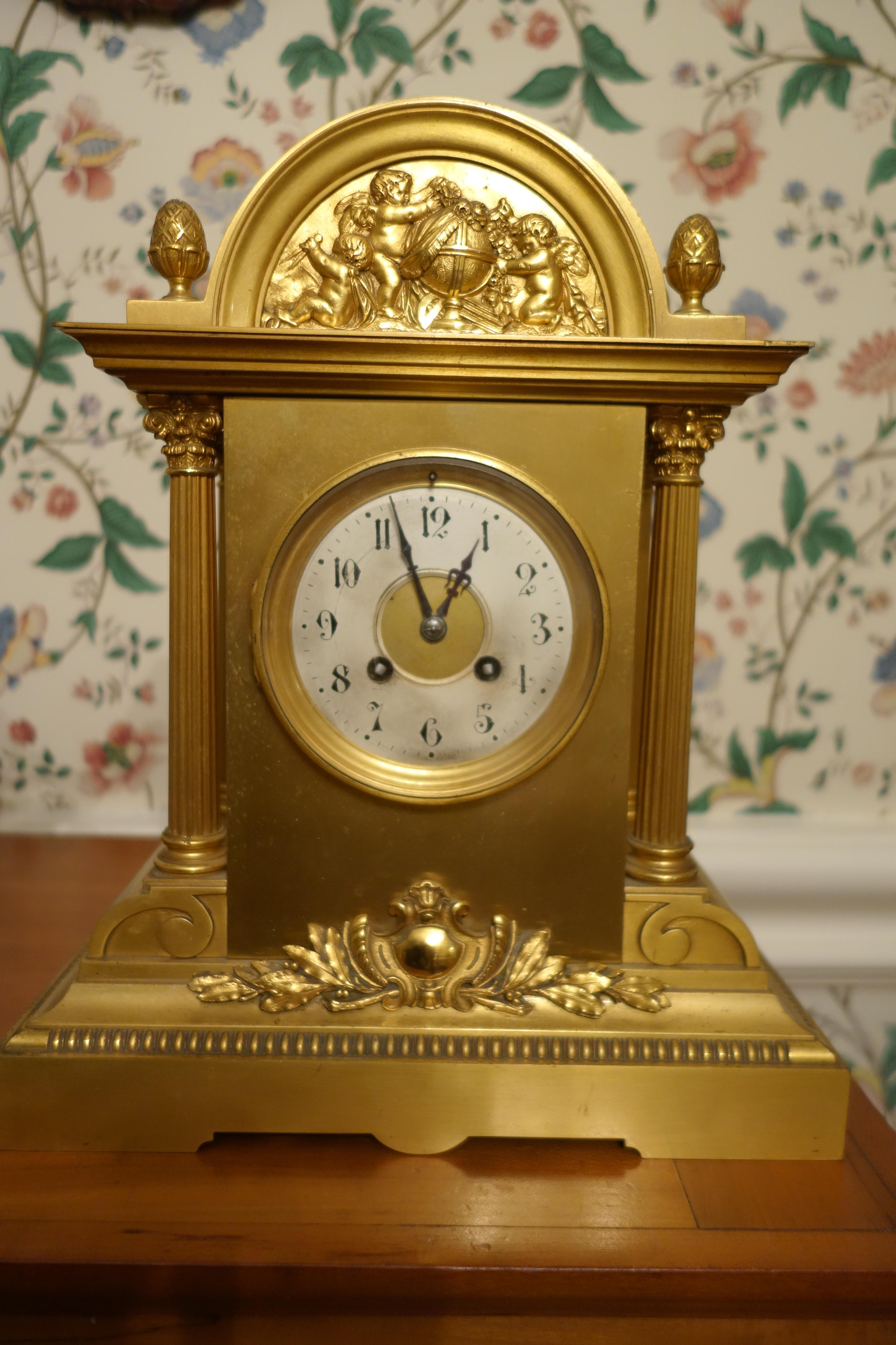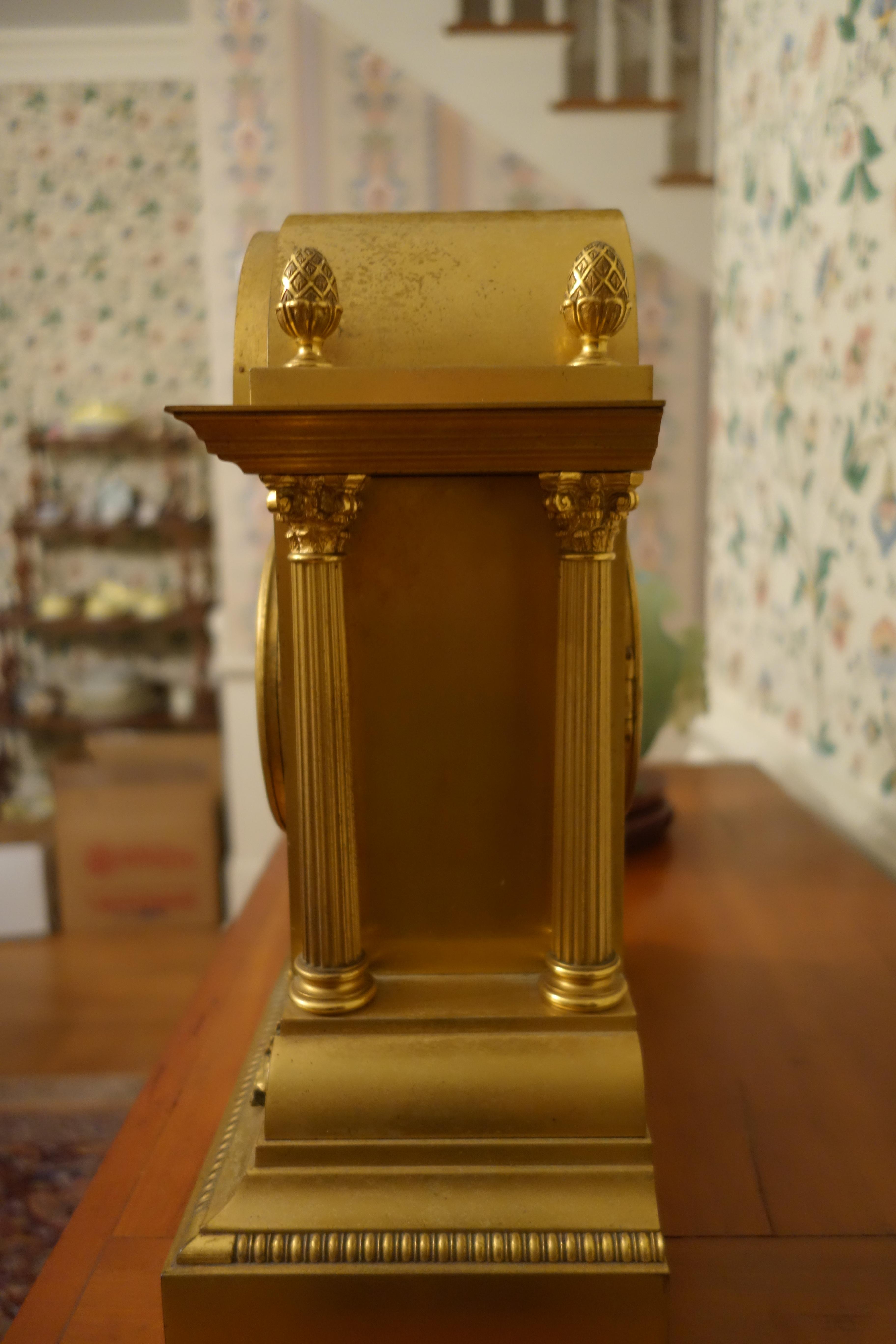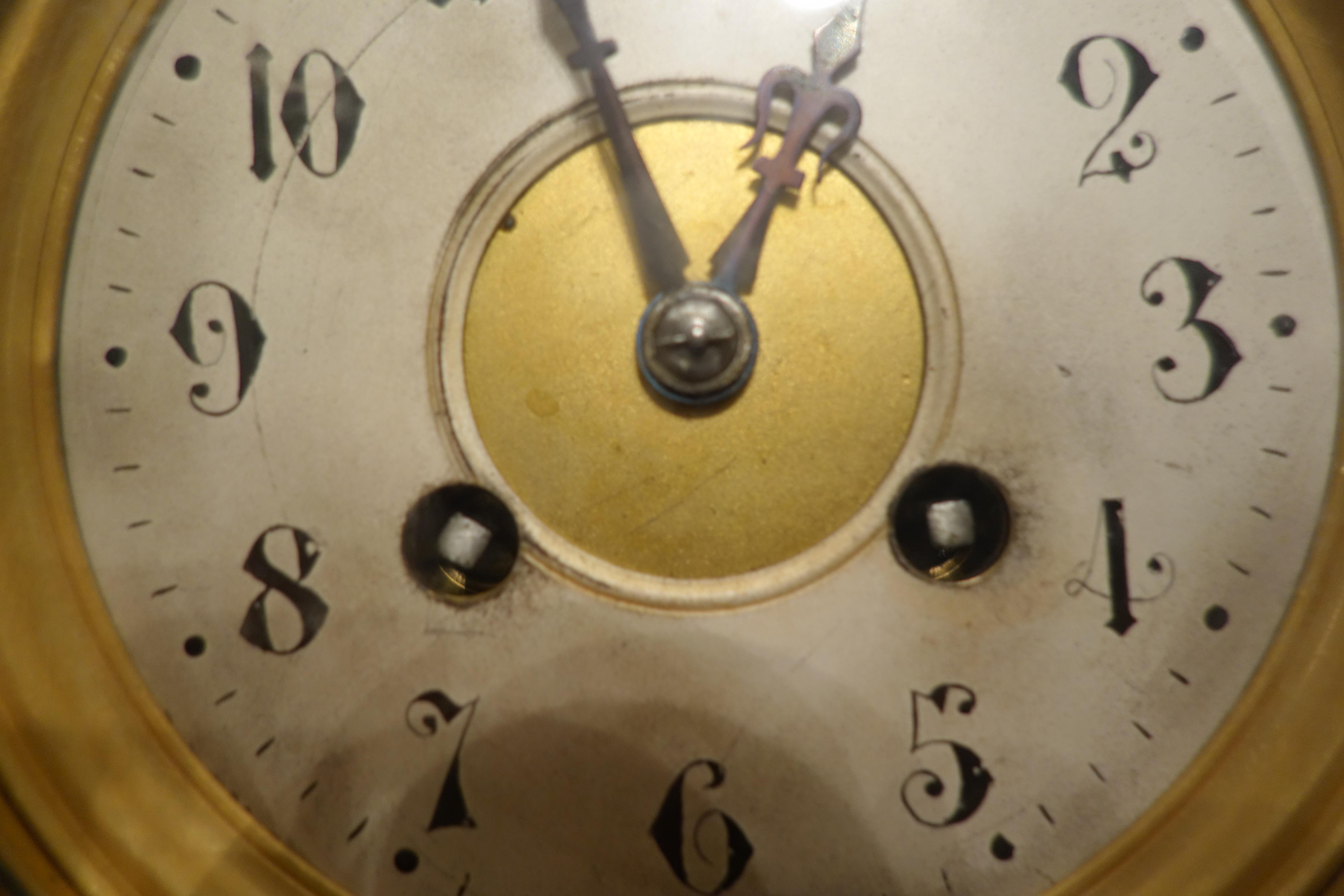 Gilt brass with hand-painted face. Works stamped "HP & Co 30648" with diamond shaped logo.