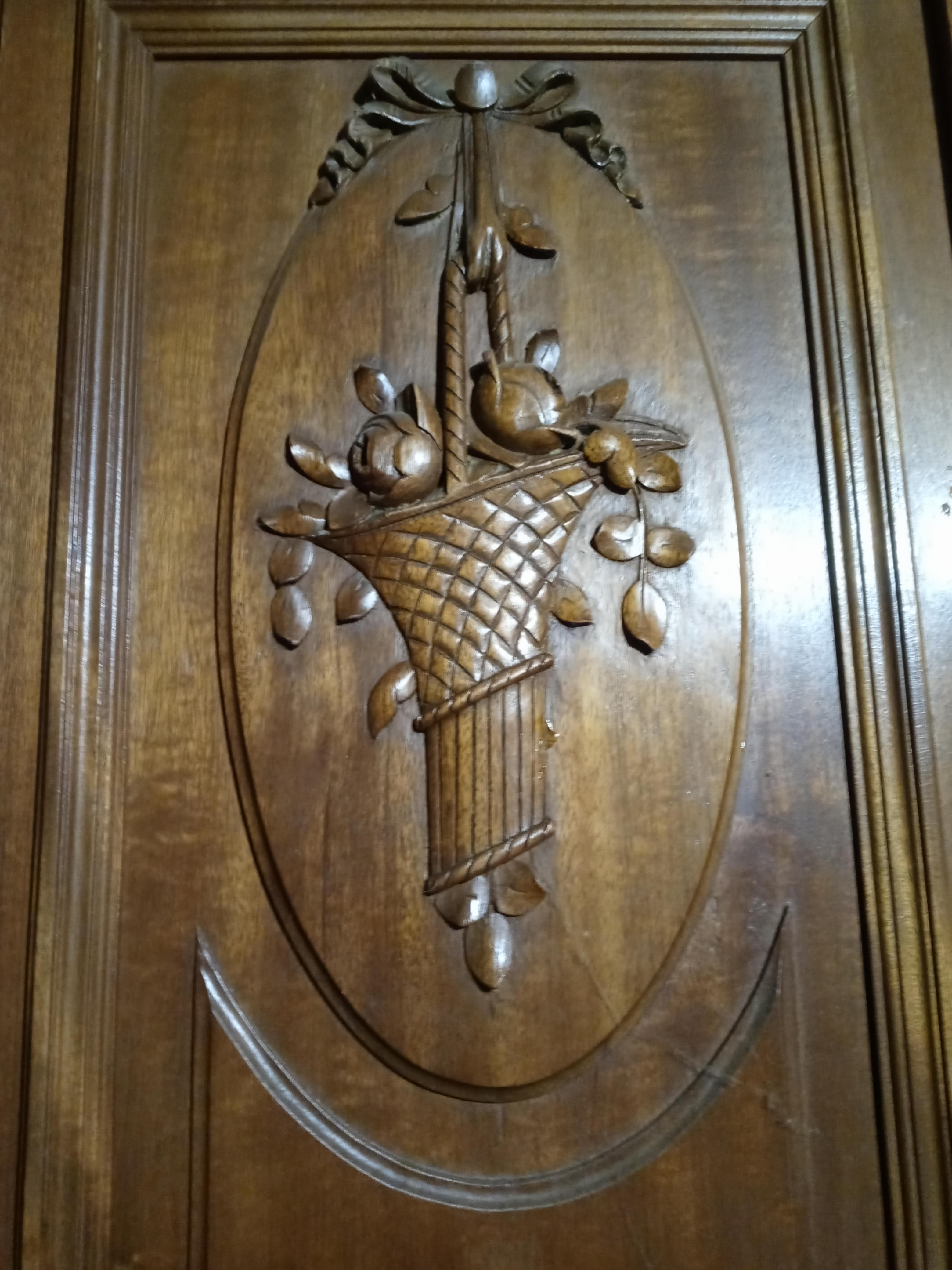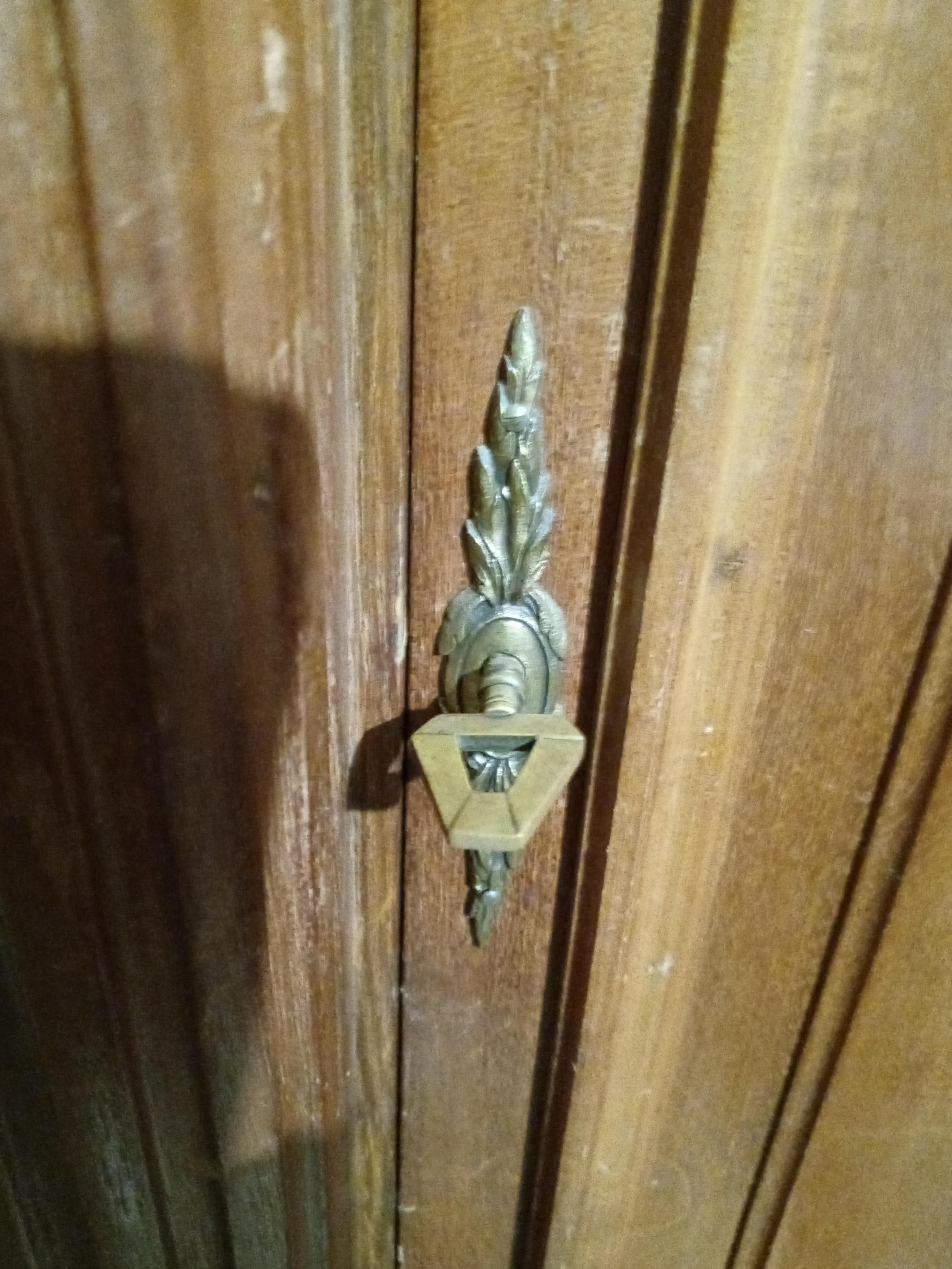 This armoire is a large piece but solid.   It is more modern I believe as it uses bolts to tighten once the pieces are interlocked during assembly.  It can be taken apart into several pieces.  It has been used for linens and blankets.   May also be used for hanging clothes.  Three shelves are included.  It needs a good home as it is collecting dust in the garage.  It was purchased in Paris France in 1998 for use in the home where we had taller ceilings.