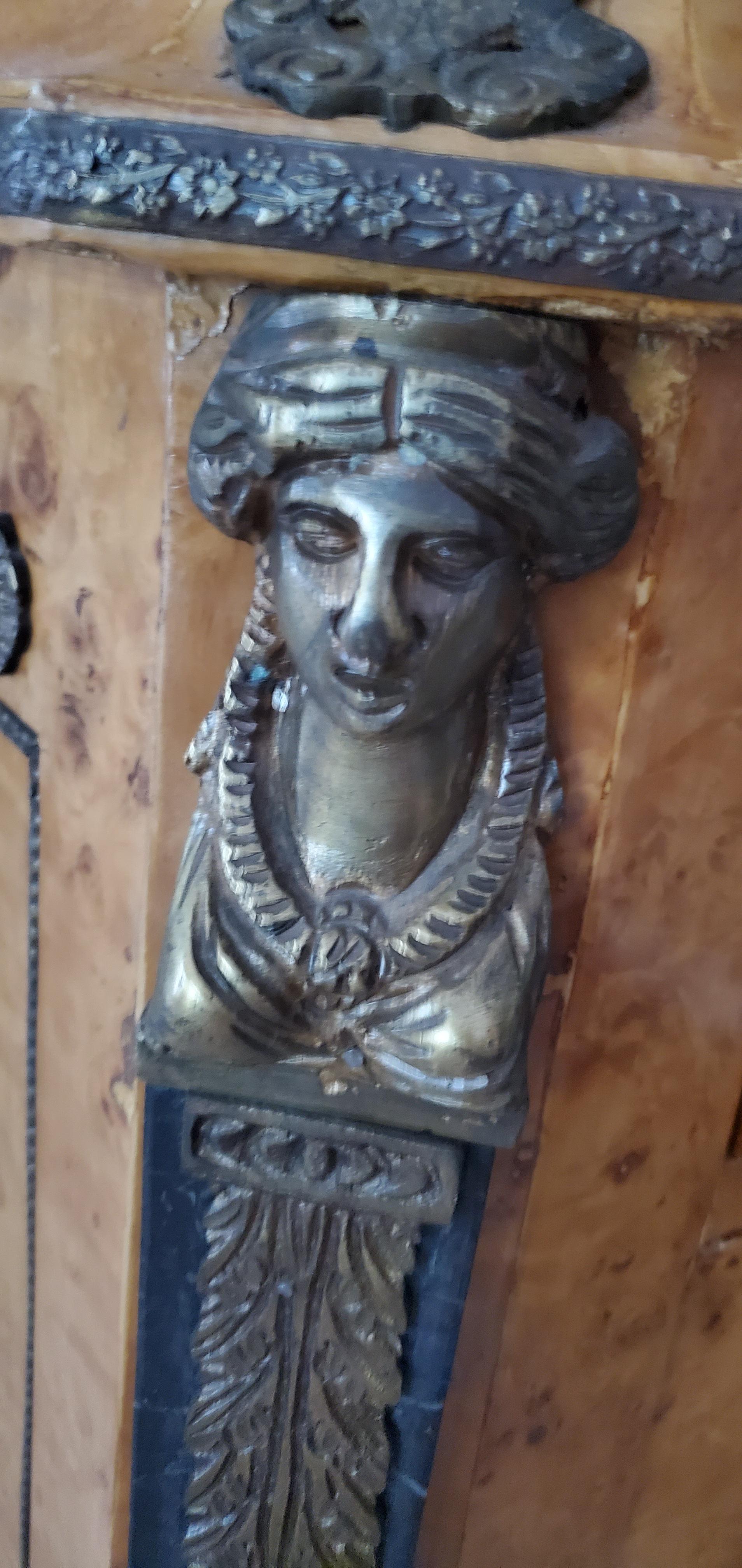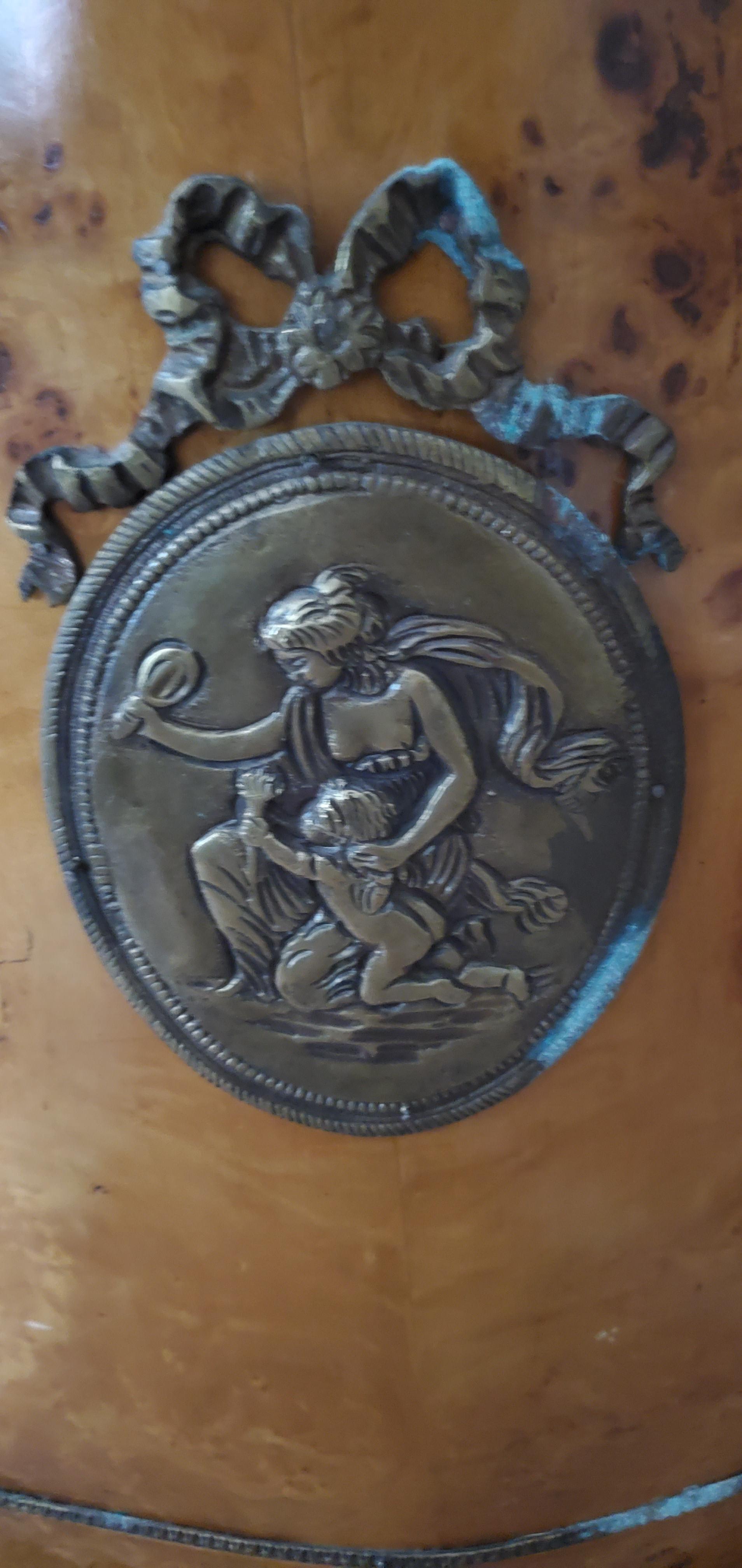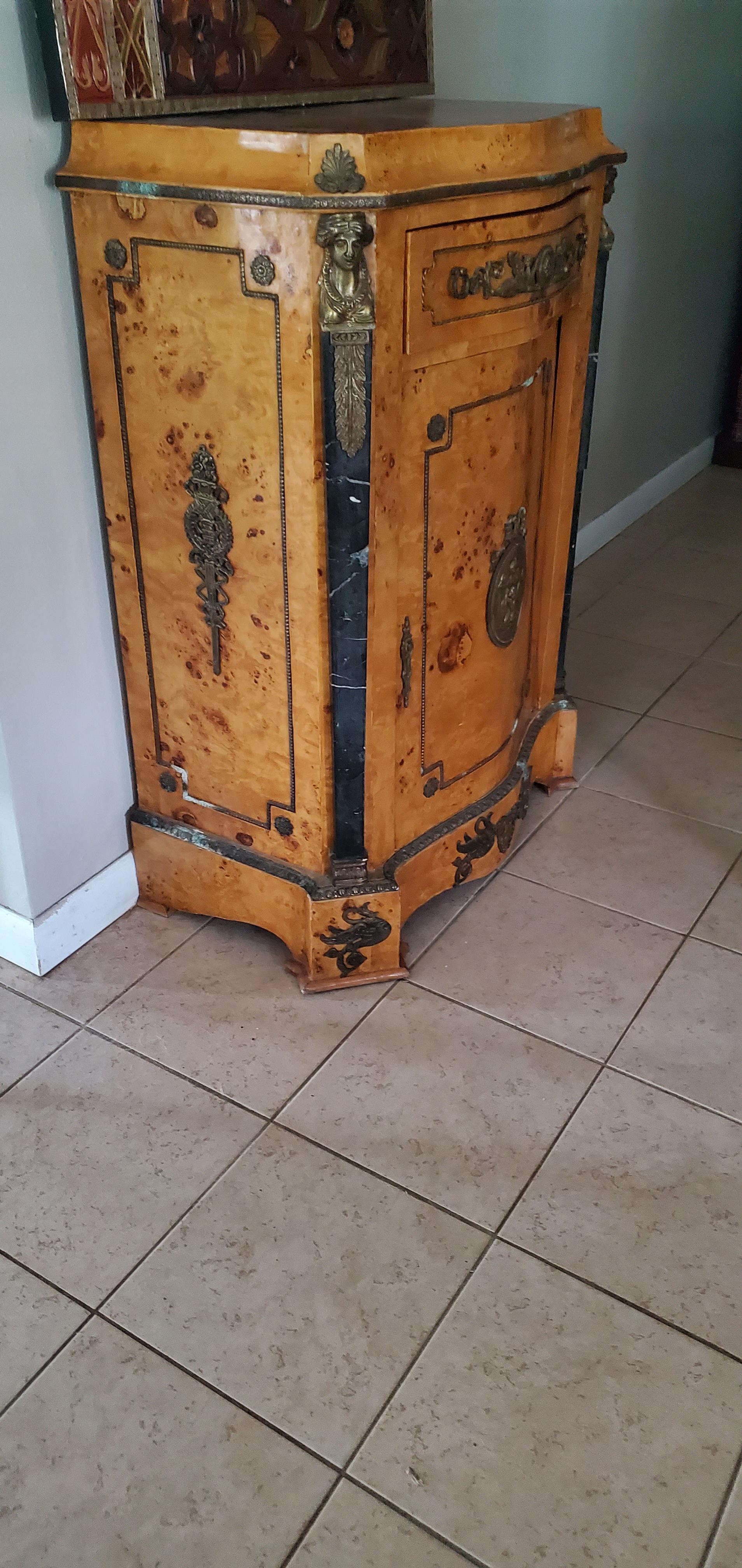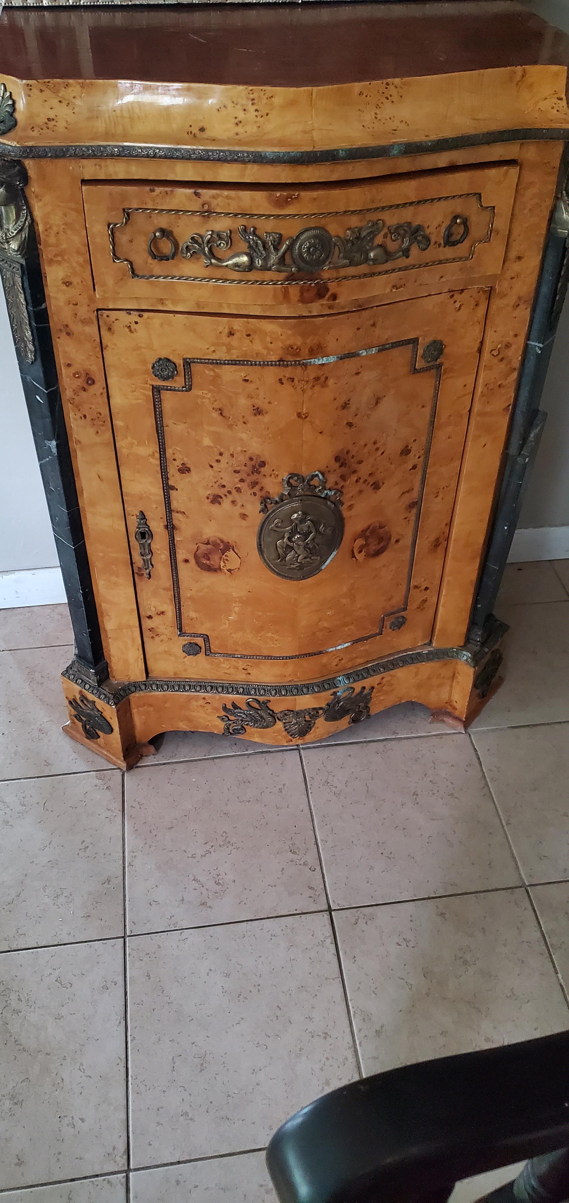 Description French birds eye/Burl Maple with ormalu brass and marble accents. This has one door that opens, 1 shelf inside and 1 drawer that pulls out. 29 × 17 × 42 Dimensions I would love any information on this cabinet!