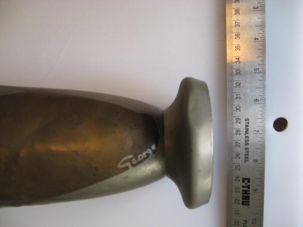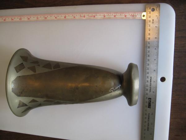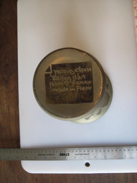 Antique Brass French Vase with graphic confetti pattern, 10' tall by 6' wide, "George" inscribed near base, bottom inscription reads, "Jacques douau, edition d'art, Fabricon Francaise, made in France". Overall condition poor, damaged.