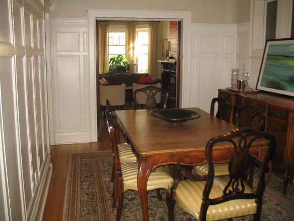 This buffet is part of a set including a table and six chairs (2 with arms; 4 without arms) and a tall cabinet with glass doors. It has a veneer of what I believe is crotch mahogany. The drawers are all dove-tailed. There is a curve in the cabinet. It has a sticker marked "Rockford Furniture Company" on the top/middle drawer. The hardware is all original as is the finish (except for the top which was re-finished about 20 years ago). There are a few minor scratches on the bottom panel of the buffet but other than that it is in good condition. The table and chairs are in pretty good condition aside from some marks on the tabletop and one of the chairs has a piece of veneer chipped off. The chairs have been stained slightly darker than the other pieces to match the darker tw0-tone of the mahogany. The tall cabinet is in very good condition. It also has a curved bottom to it and dove-tailed joints in the drawer. Hardware and finish is original on this piece.