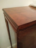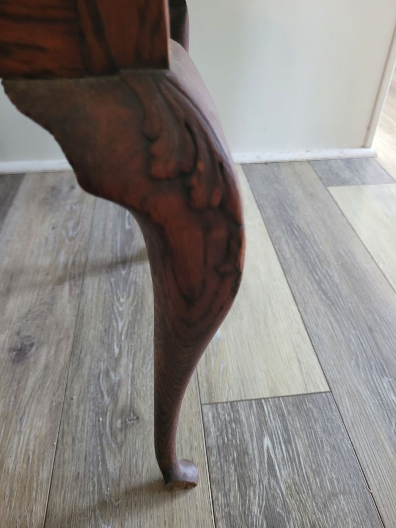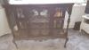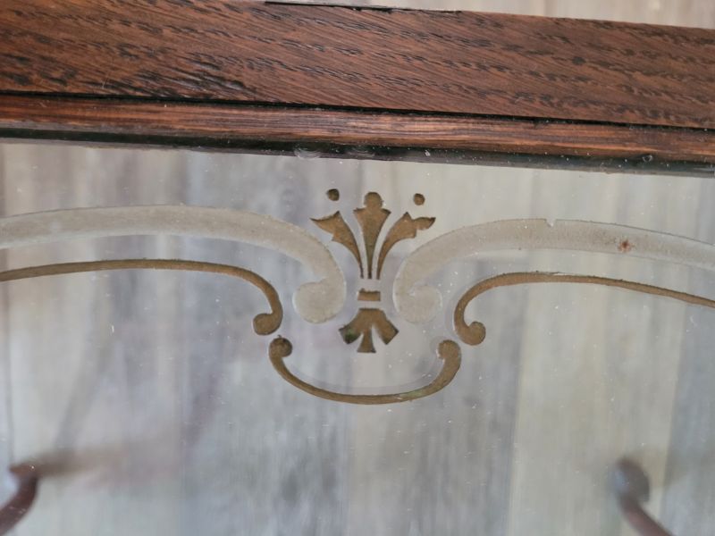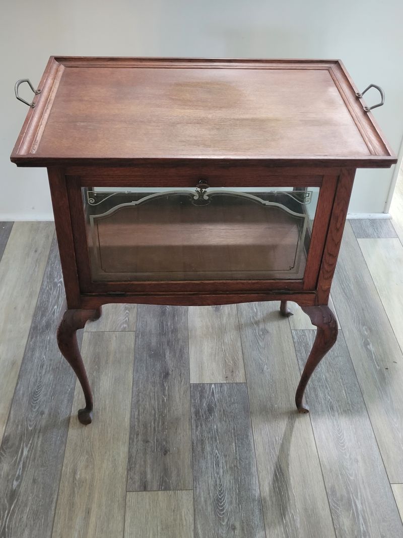 I think this is an Oak French or Dutch Tea service or drink display cabinet. It has etched glass with a painted design. It comes with a removable wooden butler tray that fits on top. It has Queen Anne legs with carving on the upper portion (front right leg has a small portion of the foot broken off) and a hinged front door that opens downward.