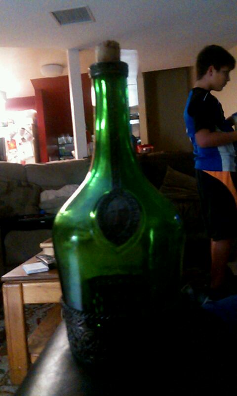Green bottle with silver stamp that says in nomine patriset filii spiritus with a cross on it