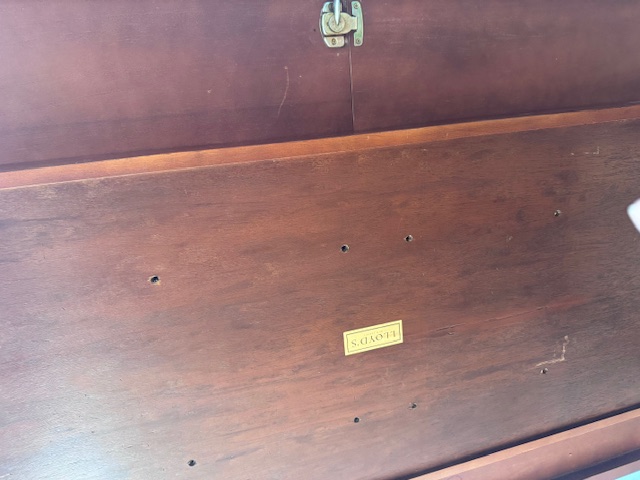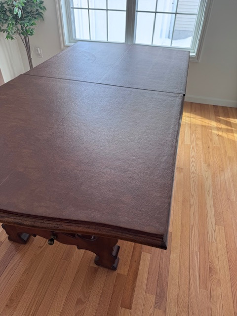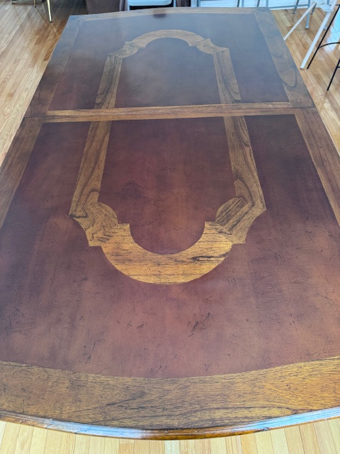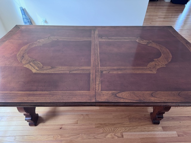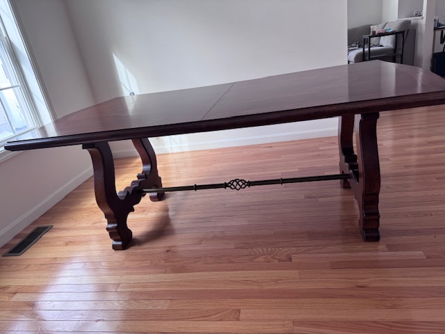 Description made in new jersey, french heritage lyre leg harvest dining table 44xx31x76; comes with table top and extender piece; great condition