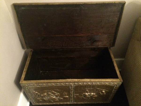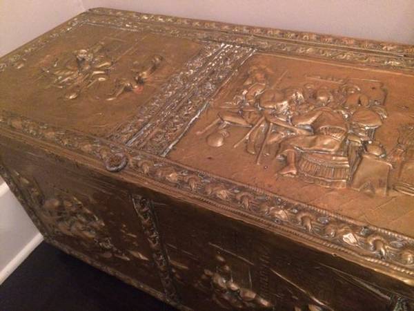 This chest is made of French decorative ceiling panels. Each panel depicts life from 18th Century France. The tiles have been hand-crafted into a storage chest. It's 31"L x 18"H x 18"D.