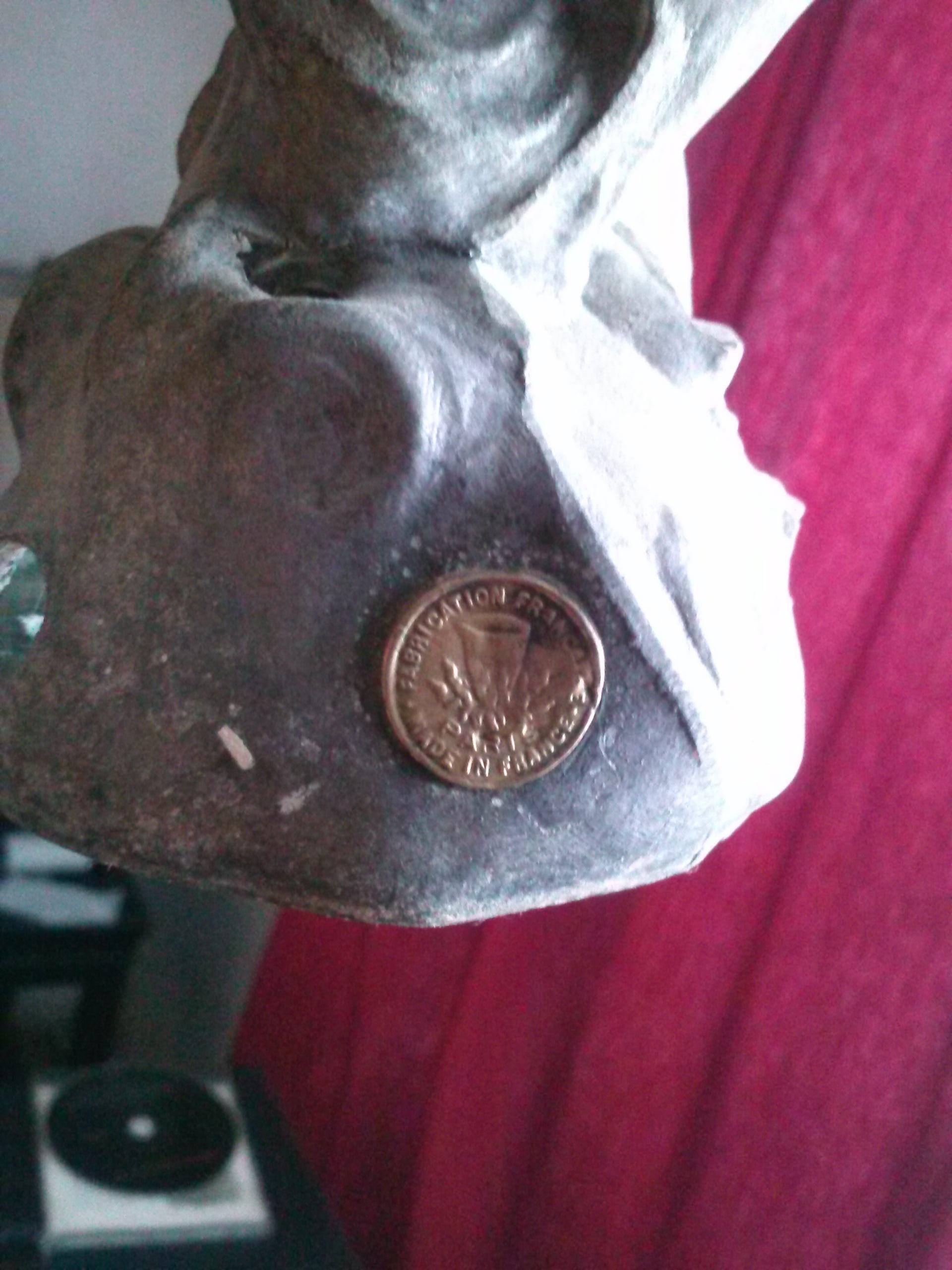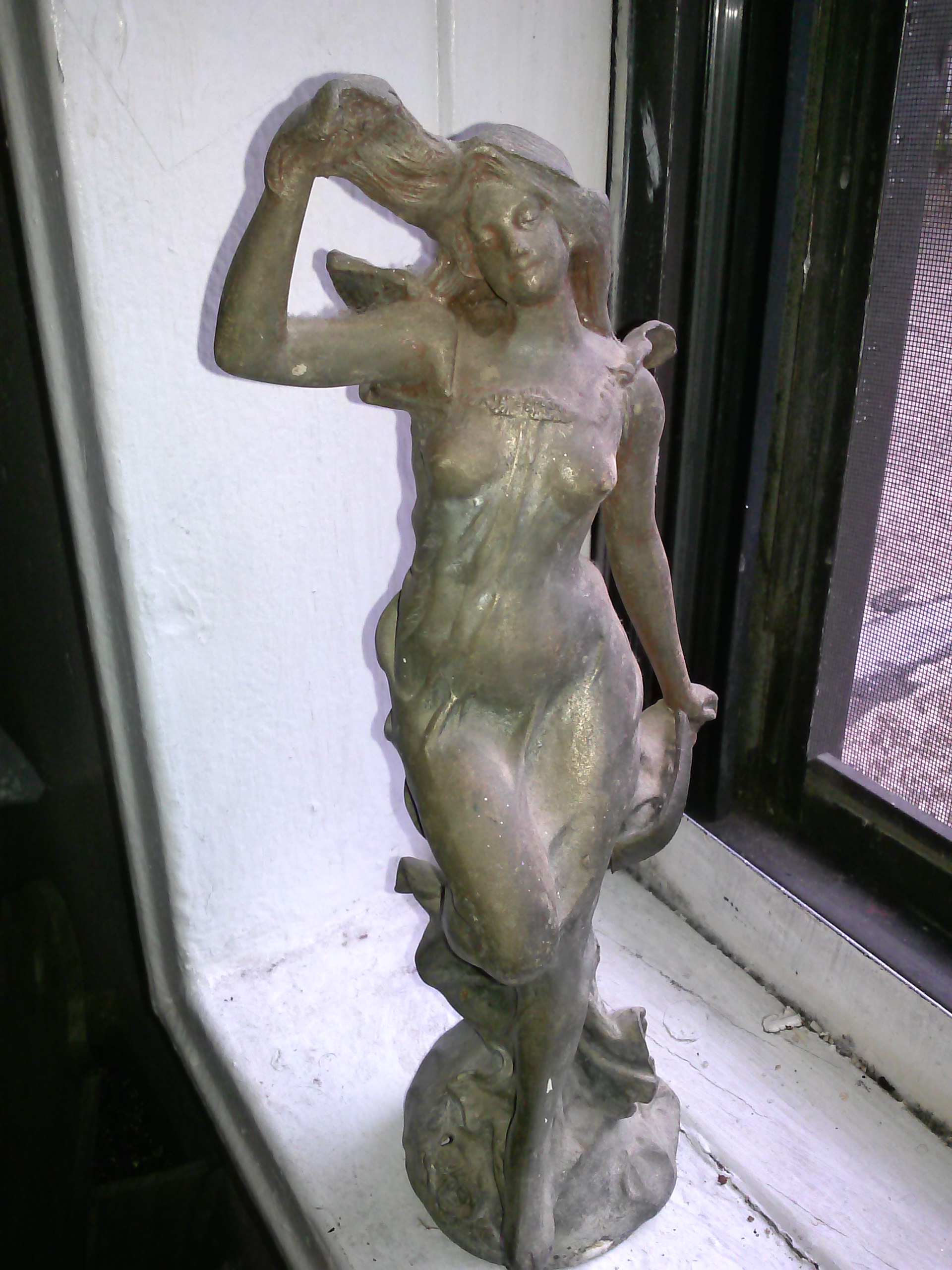 I have had this piece for about 20 years.it was given to me by a friend who found it. It seems to be a lamp base and it has what looks like a penny on the back on the. Very bittomg of the dress and it says made in france. Abs utv quite heavy might be iron.