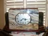 We have a white marble clock with 2 angels or woman on each side. It has a key to wind the clock. I don't think the clock works and it has a glass door that doesn't close all the way. It seems to be accented in some sort of bronze medal. It is is good condition. It must weigh over 50 lbs. It says French Clock on my grandmother's tag and it has a price of $900. on it. I am having trouble downloading pictures. I can email them to you if you are interested.