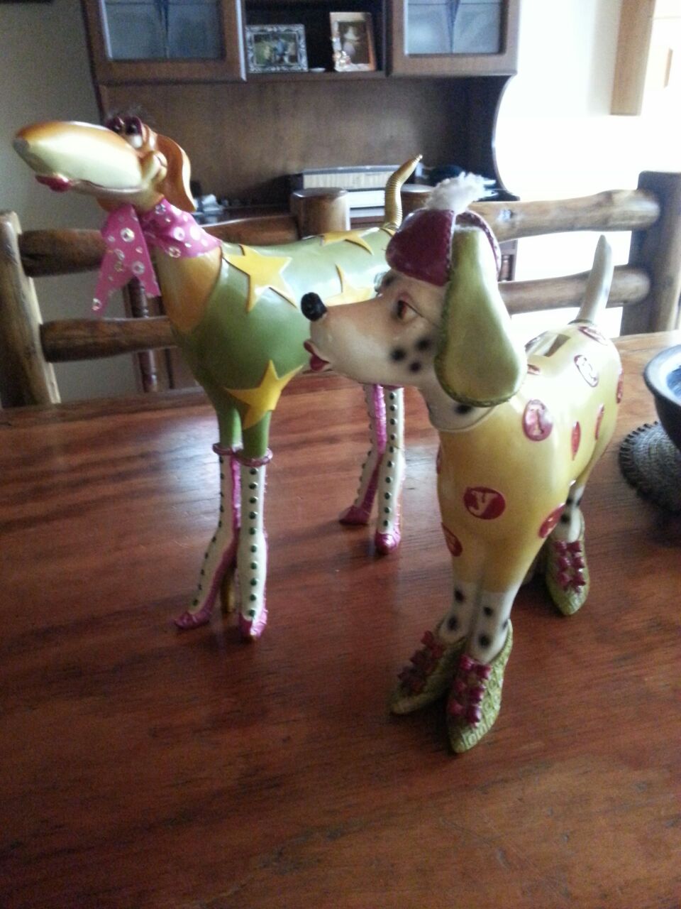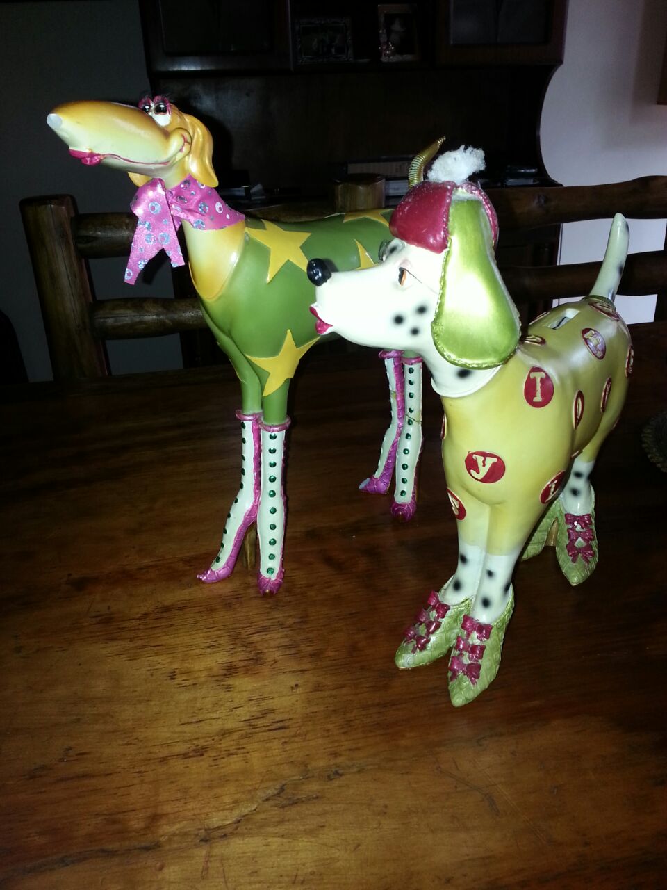 French poodle ceramic ornaments, about 28 inches in hight, 25 in lenght and about 8 in width. Still original paintwork, little damage on one's nose and head, still got there eyelashes , no markings that I can see. It was intended to be saving boxes, still have the plugs underneath to take out the money without breaking the dogs to get the money out.