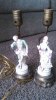 porcelian figurie man and woman lamp. i think they are either french or british. from what i find online i think they are from the early 1900's. the bottom base is brass on both. from what i am told the gold lining on them is real gold. the womans both hands are broke off and the mans one hand is broke off.