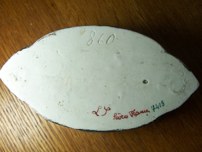 The item is in very decent condition. It appears to be hand-painted. It has the markings "LS Sevres France" in red on the base followed by the number 7413 in blue. I don't know if 7413 is indicative of the date of manufacture or something else. There is a number 860 marked into the top center of the base. I have read that LS was used to identify the La Seinie factory which made hard paste porcelain and operated between 1774-1794. It sent the porcelain to Paris porcelain workers and its pieces were supposedly signed in red. Its work was in Sevres style but bolder. However, I have not seen any identified La Seinie pieces on the Internet with which to compare and confirm the make of this item.