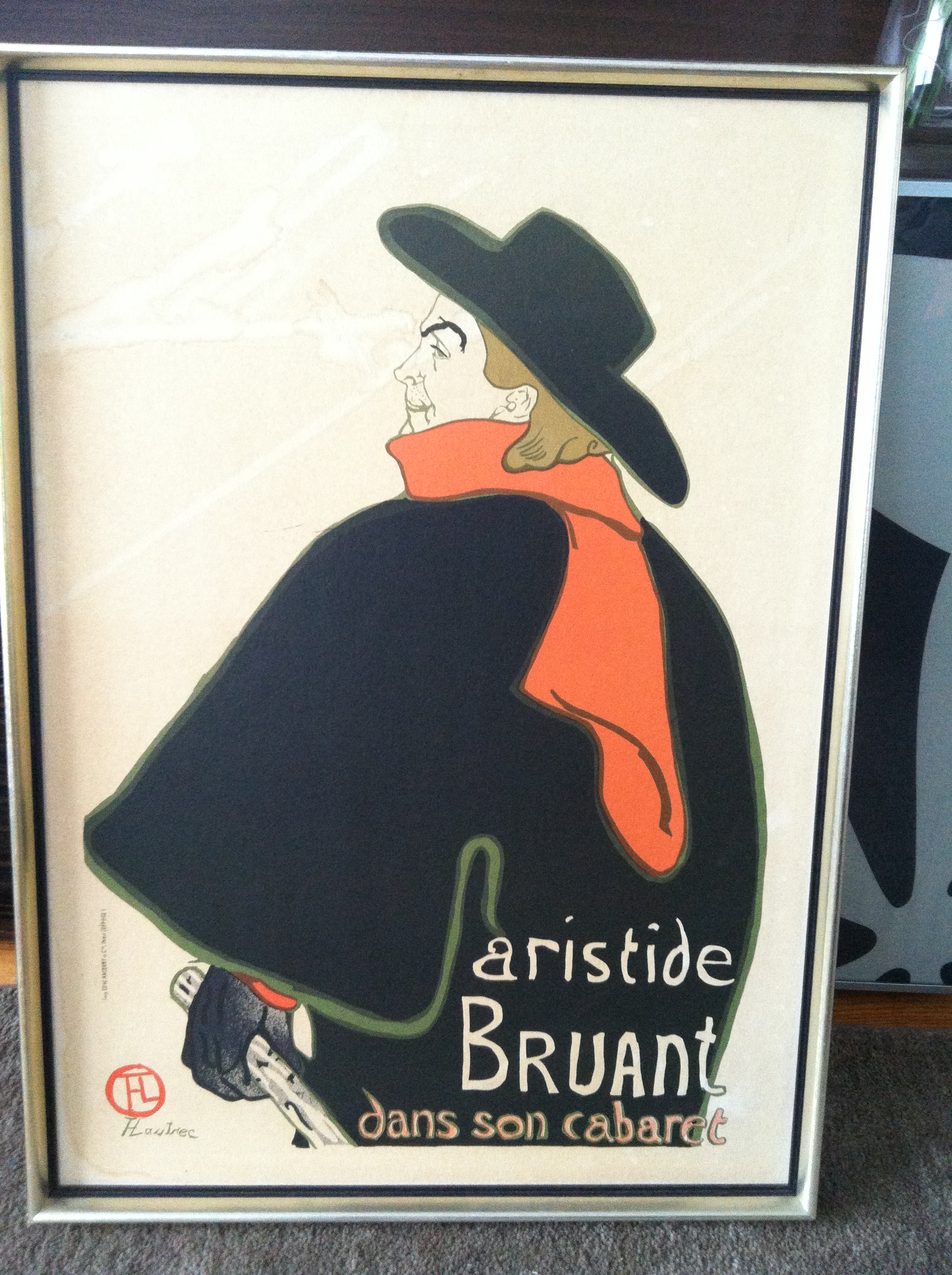 I bought this poster at an Antique sale and was told it was a hand painted poster from France. I don't believe it was actually hand painted because of the consistency of the poster, I have researched the history of it and found it was first created by a french painter named Henri de Toulouse-Lautrec and is a painting of a cabaret singer/comedian named aristide Braunt. A lot of the copies I have seen though do not have the mark on the left hand side that says, "lmp EDW. ANCOURT et Cie Paris (DEPOSE)" that is on this poster but the ones I have seen with the marking are worth a lot more, I even found one that sold in 2003 for $57,300 I believe it said for a full size print but i'm not sure what size the full size is. But all the prints have the artists signature in common.