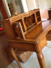 This is a 3 drawer writing desk with fold out top, yellowish in colour. No cracks or chips and minor scratches consistent with proper use only.
