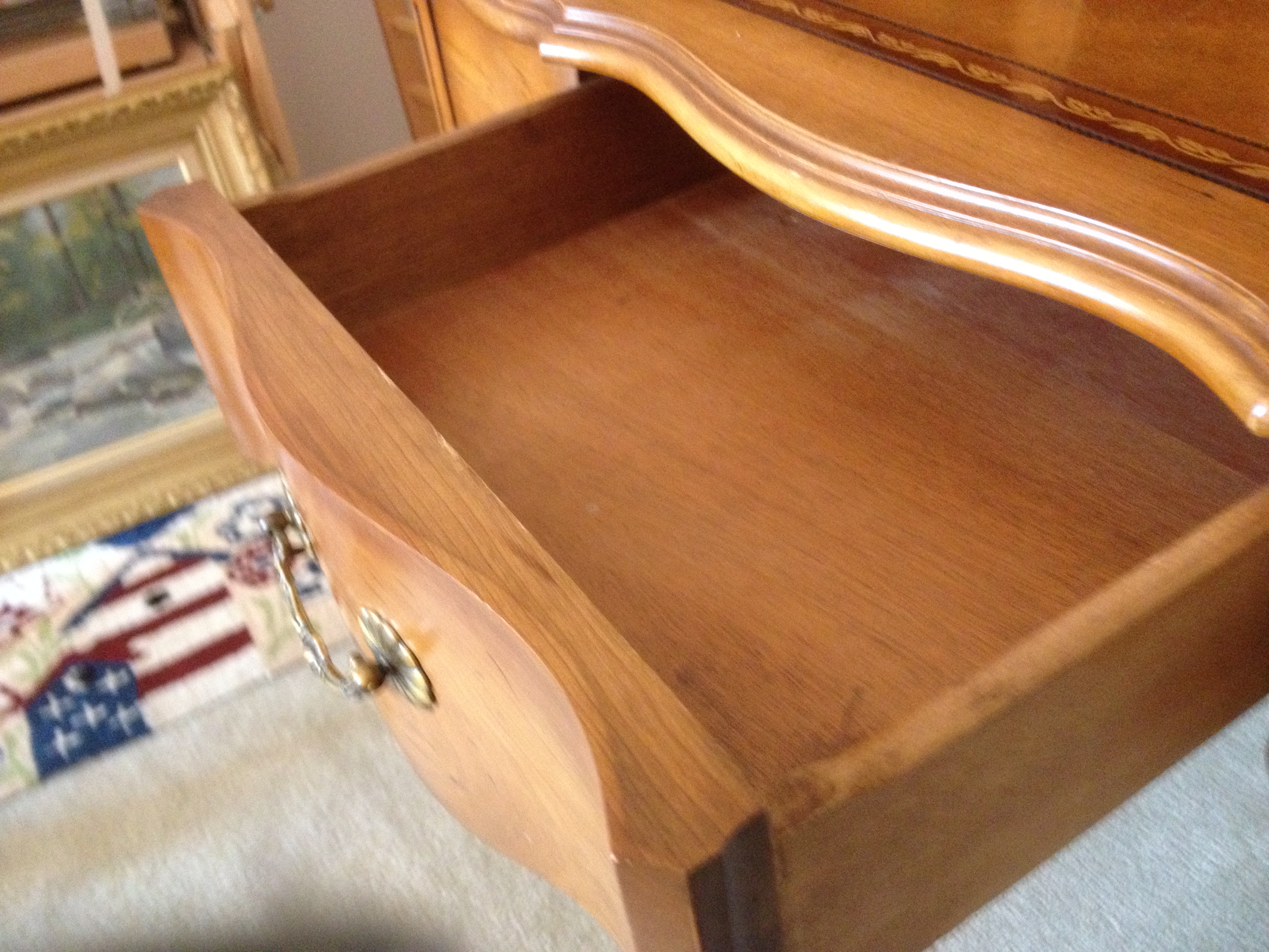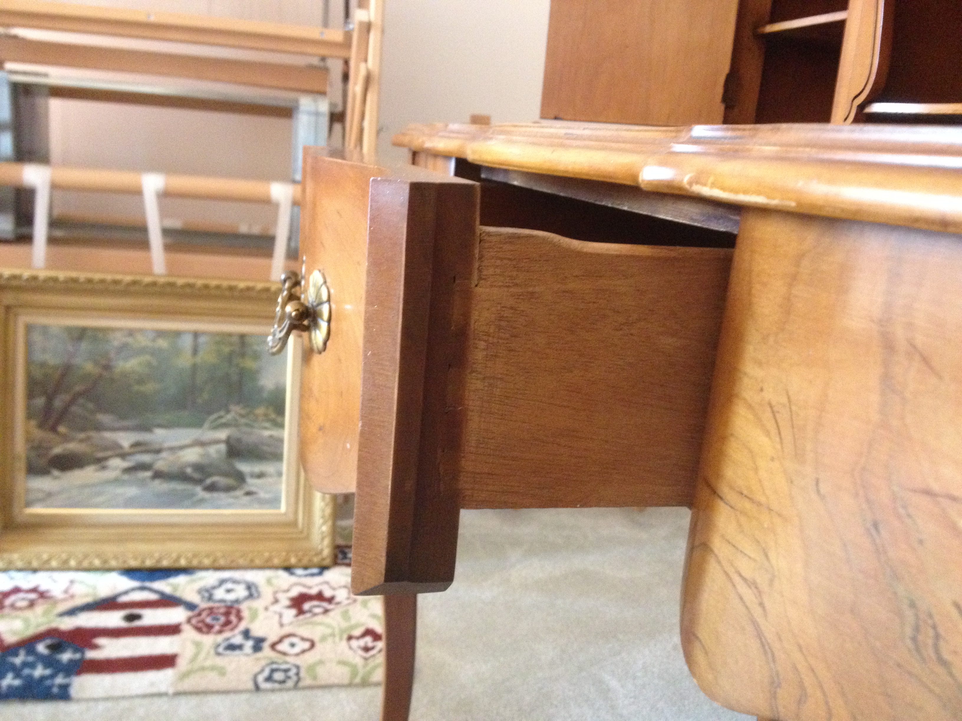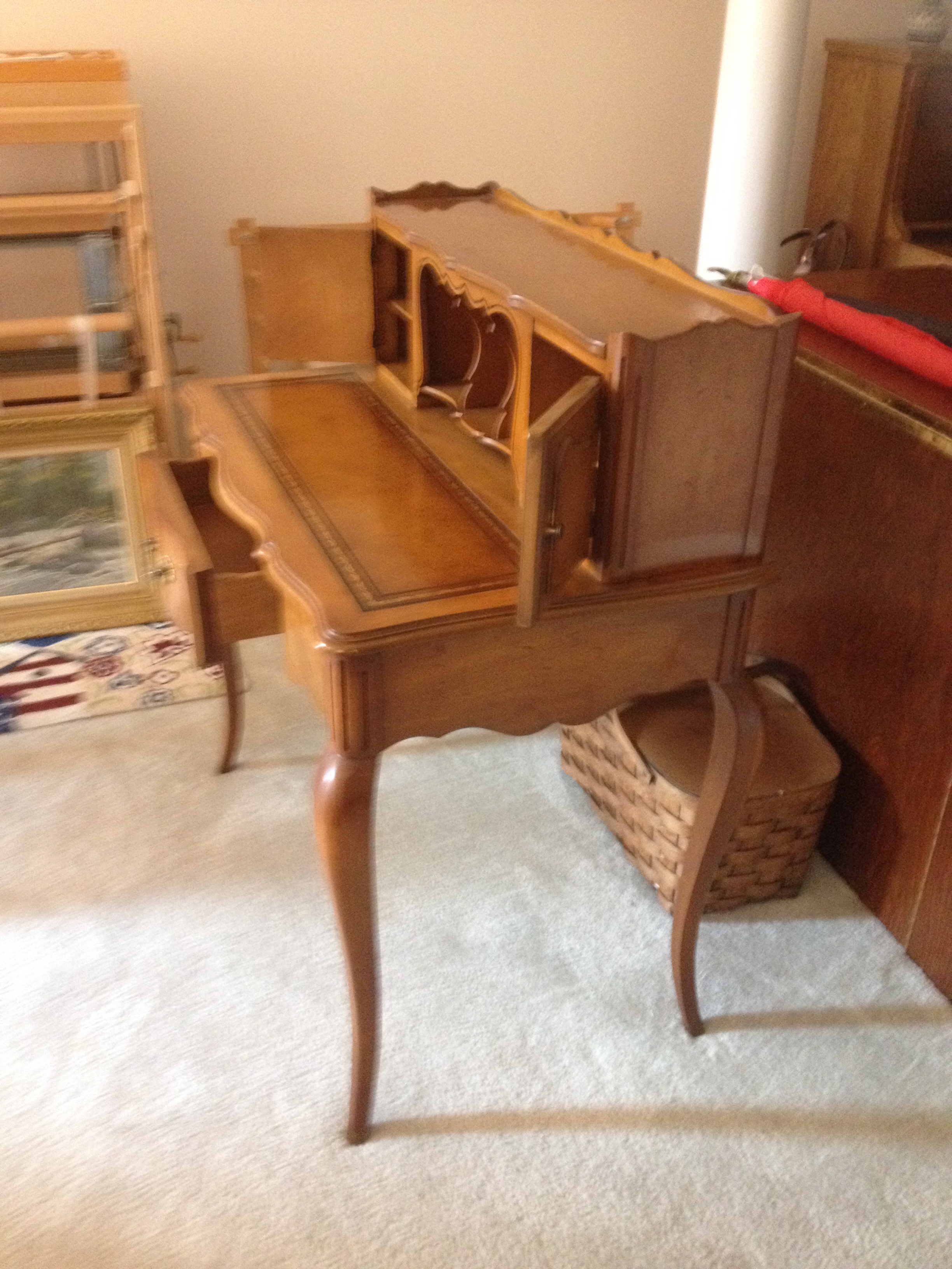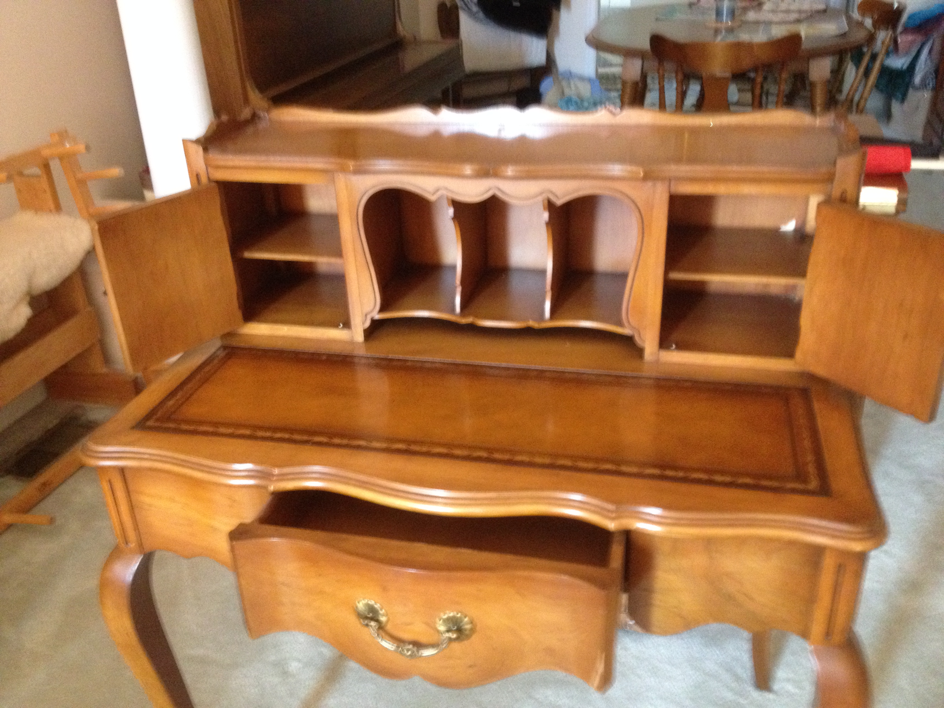 Small French Provincial style writing desk, about 60  years old, solid wood. No "makers marks" of any kind can be found. Originally part of a set that included 2 end tables, since split off.