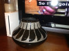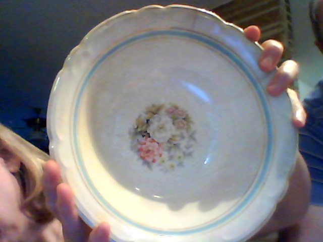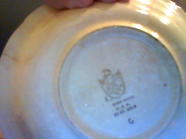 French Saxon China Serving bowl, Union Made U. S. A. 22 KT. GOLD. 8 and a half round bowl, 3 inches deep. Floral rose pattern in bottom of bowl. Aqua blue ring about 1 in from rim of bowl. 2 gold rings around blue and gold ring on rim. On back beside French Saxon China symbol is the number 5.