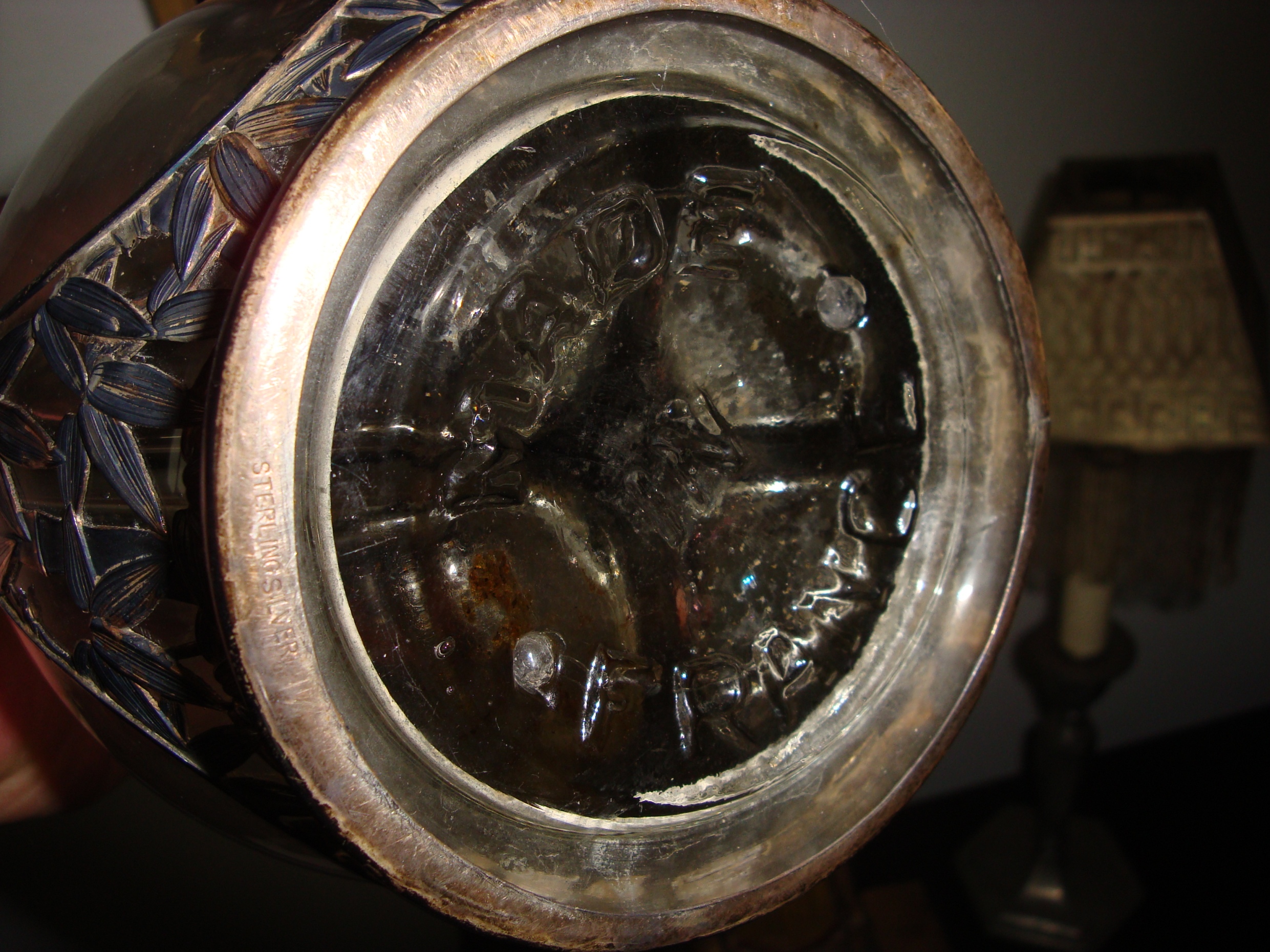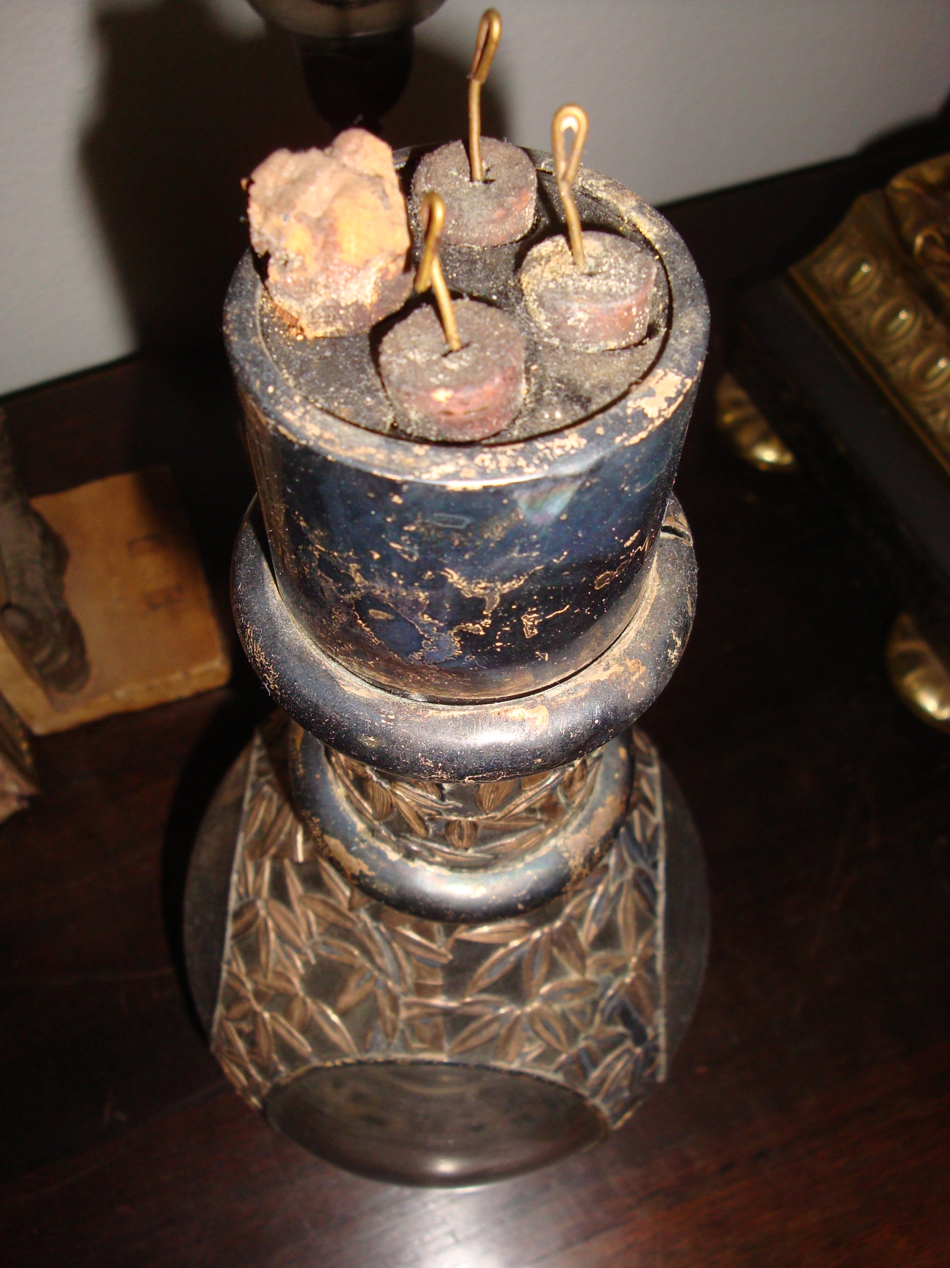 glass with silver bamboo-pattern applique, vial divided into 4 windowed compartments with a cork at the top of each