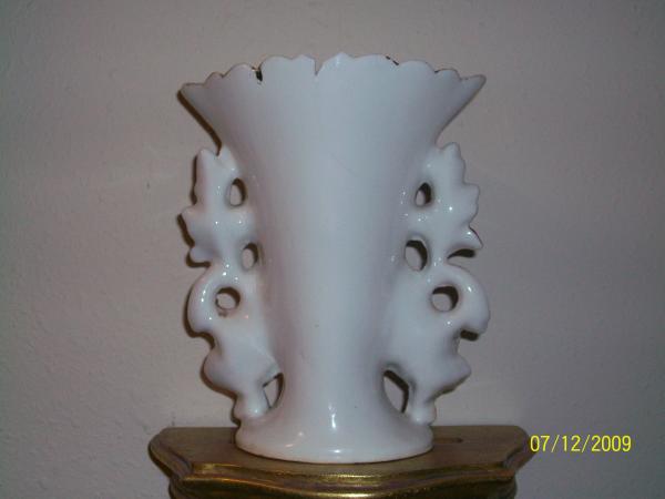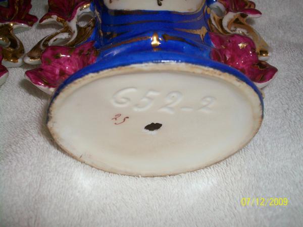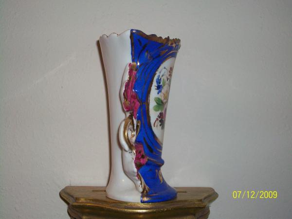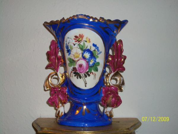 Beautiful floral vases in blue, burgandy and golds. One vase has more wear, the gold has faded somewhat. These vases have holes in the center bottom and appear to have been used as lamps.