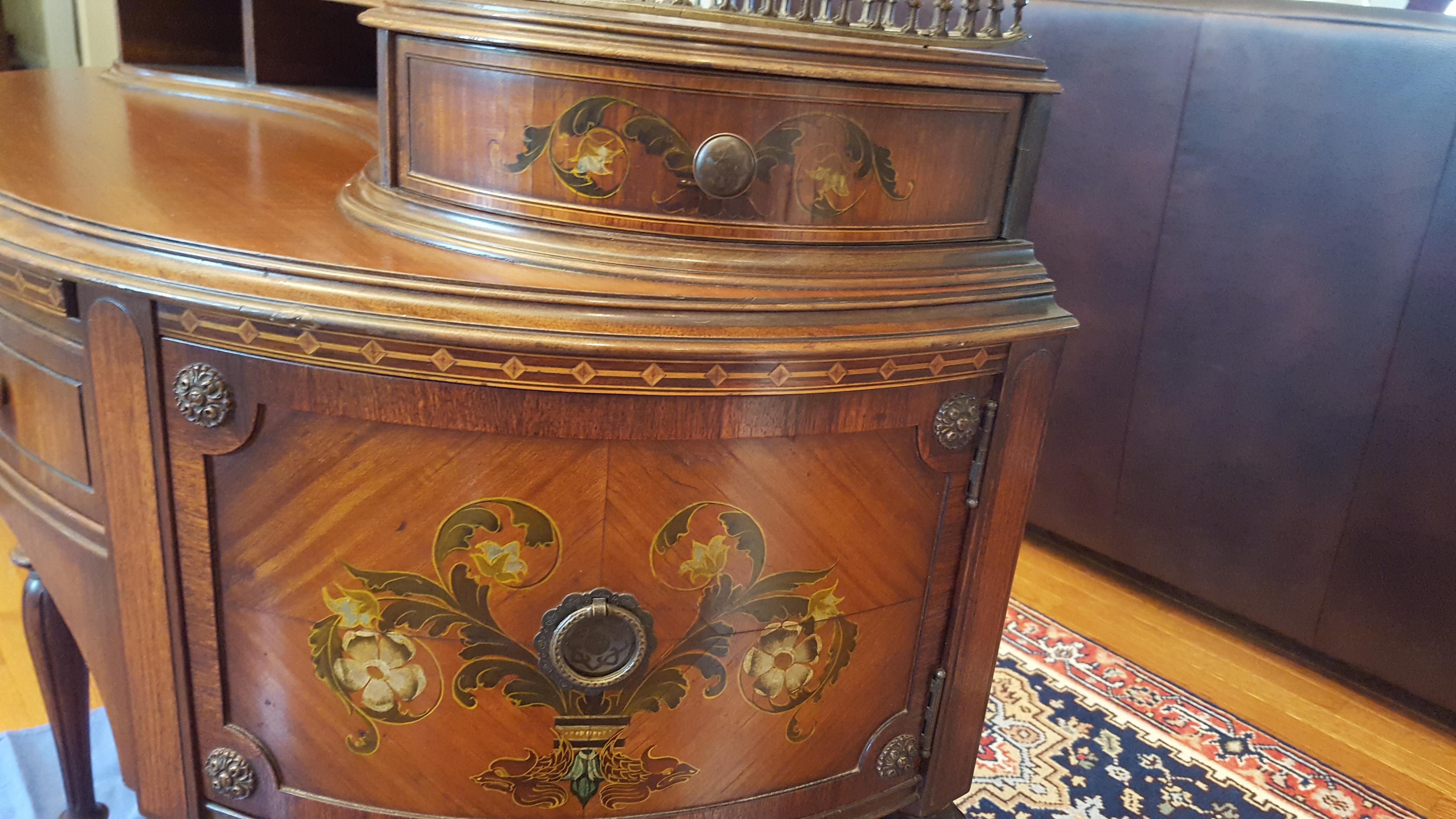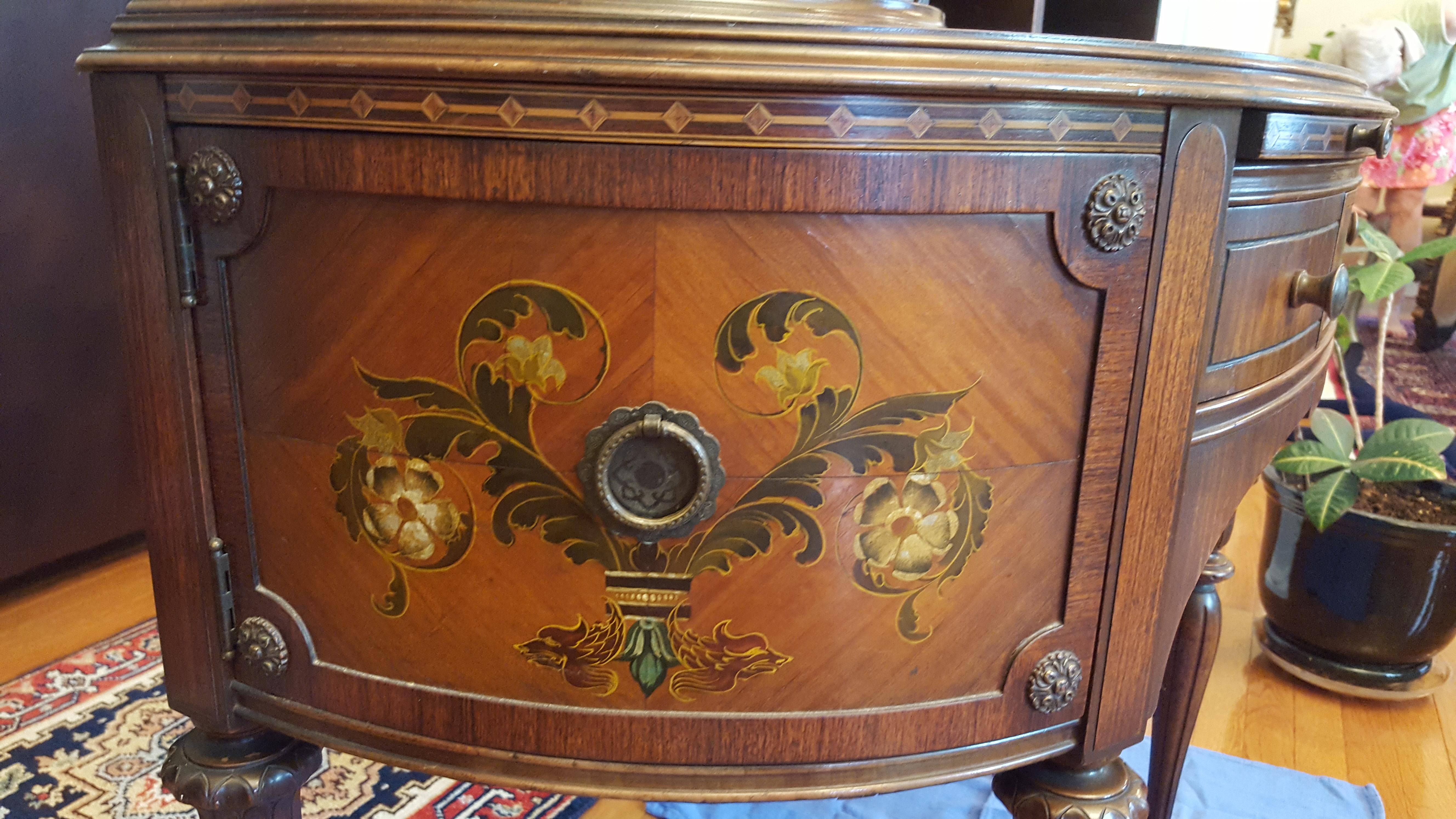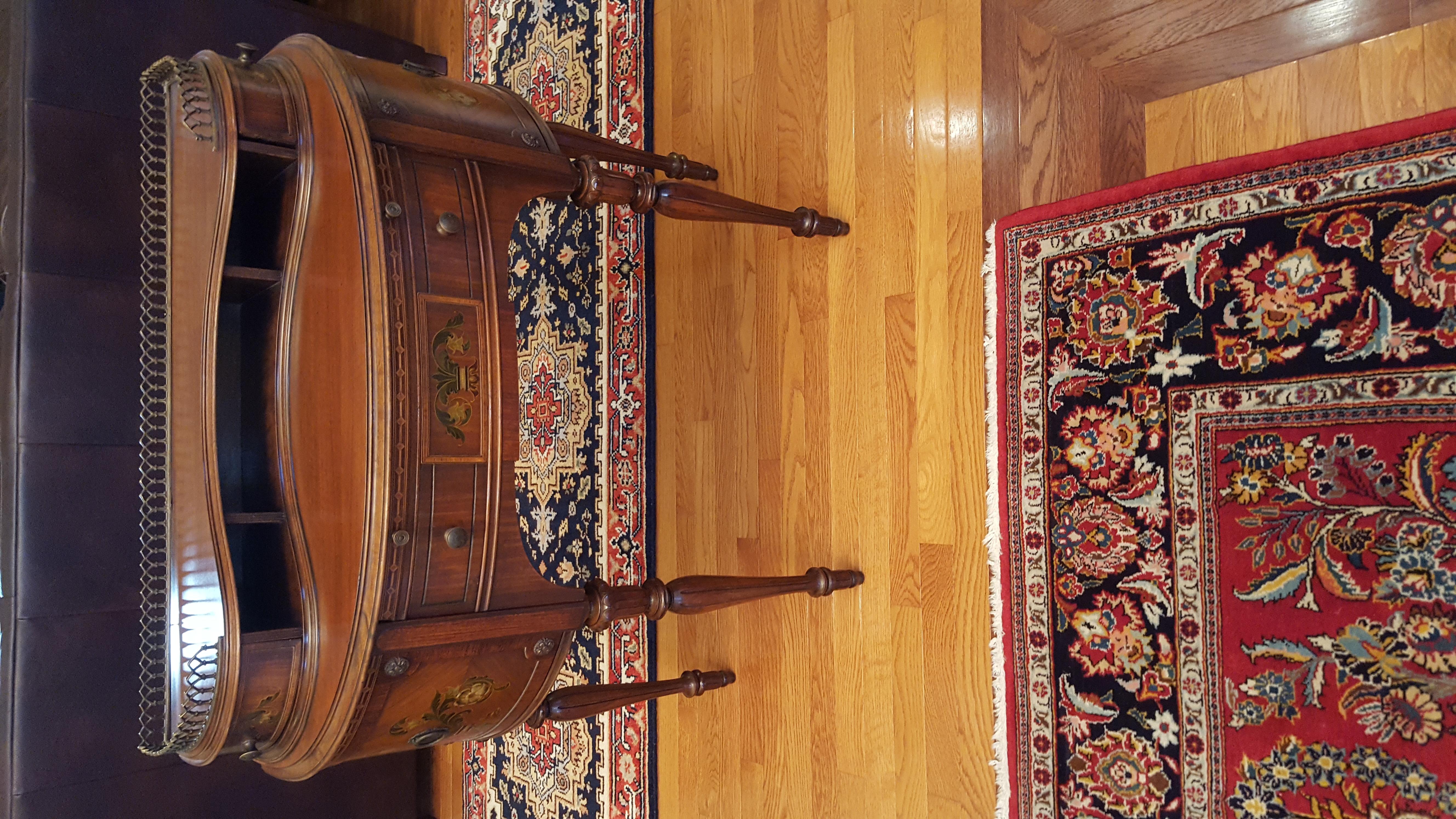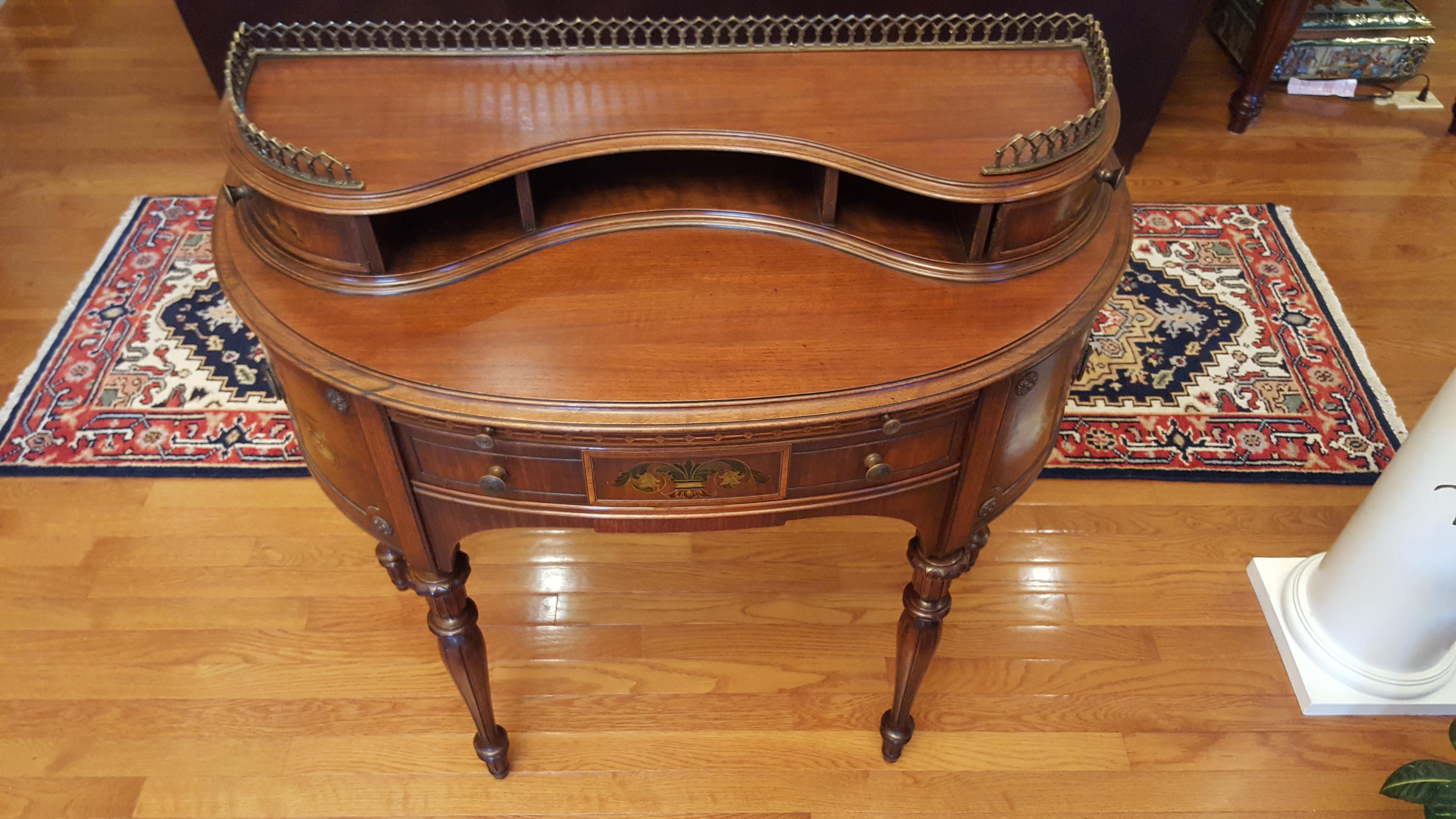 French Victorian demi-lune desk. Mahogany wood. 38 in wide by 33 in tall. Desk appears to be in great shape. There are no markings on the bottom or the back to indicate a manufacturer. Seeking information about the desk. Also it's approximate value.