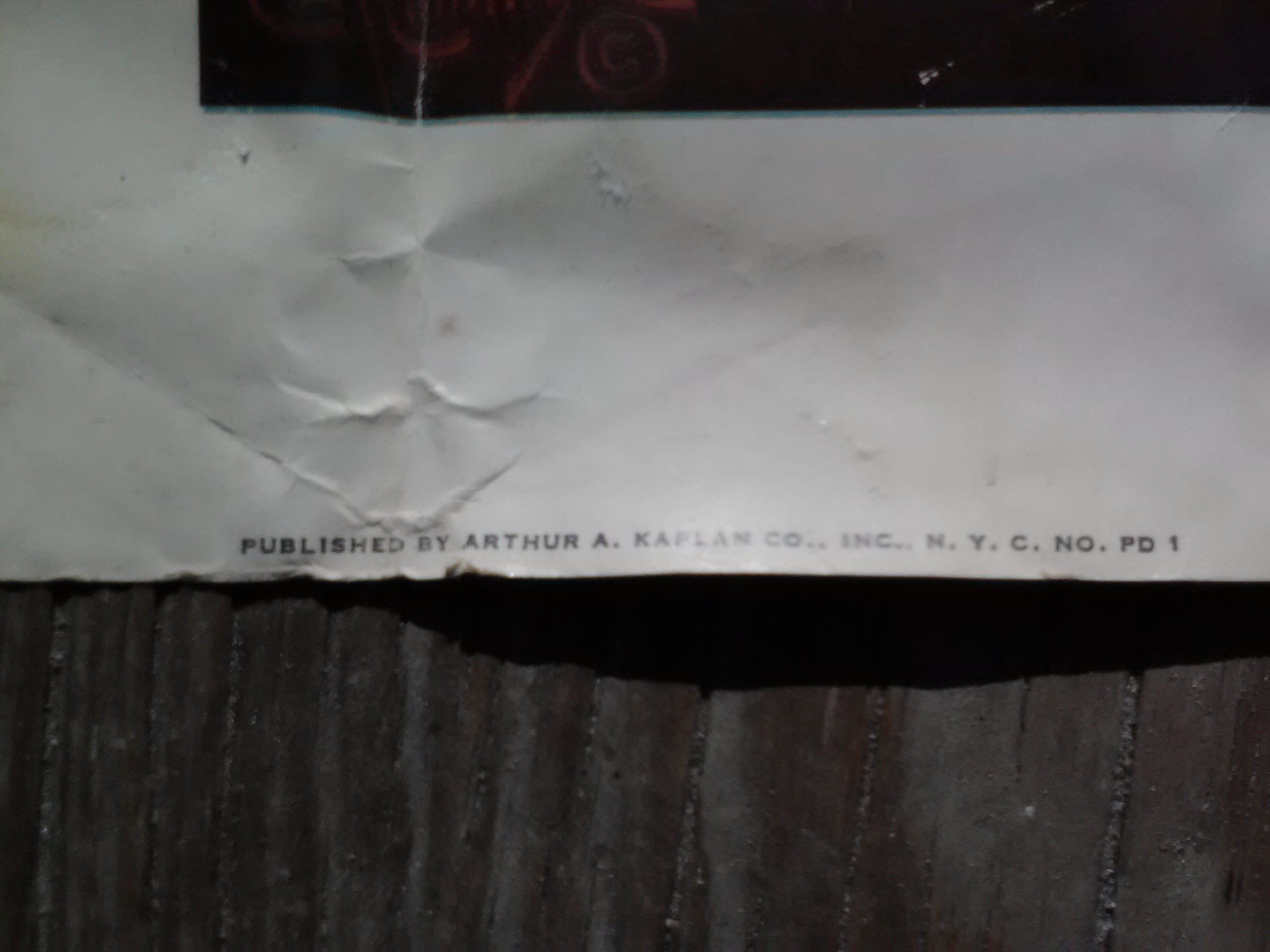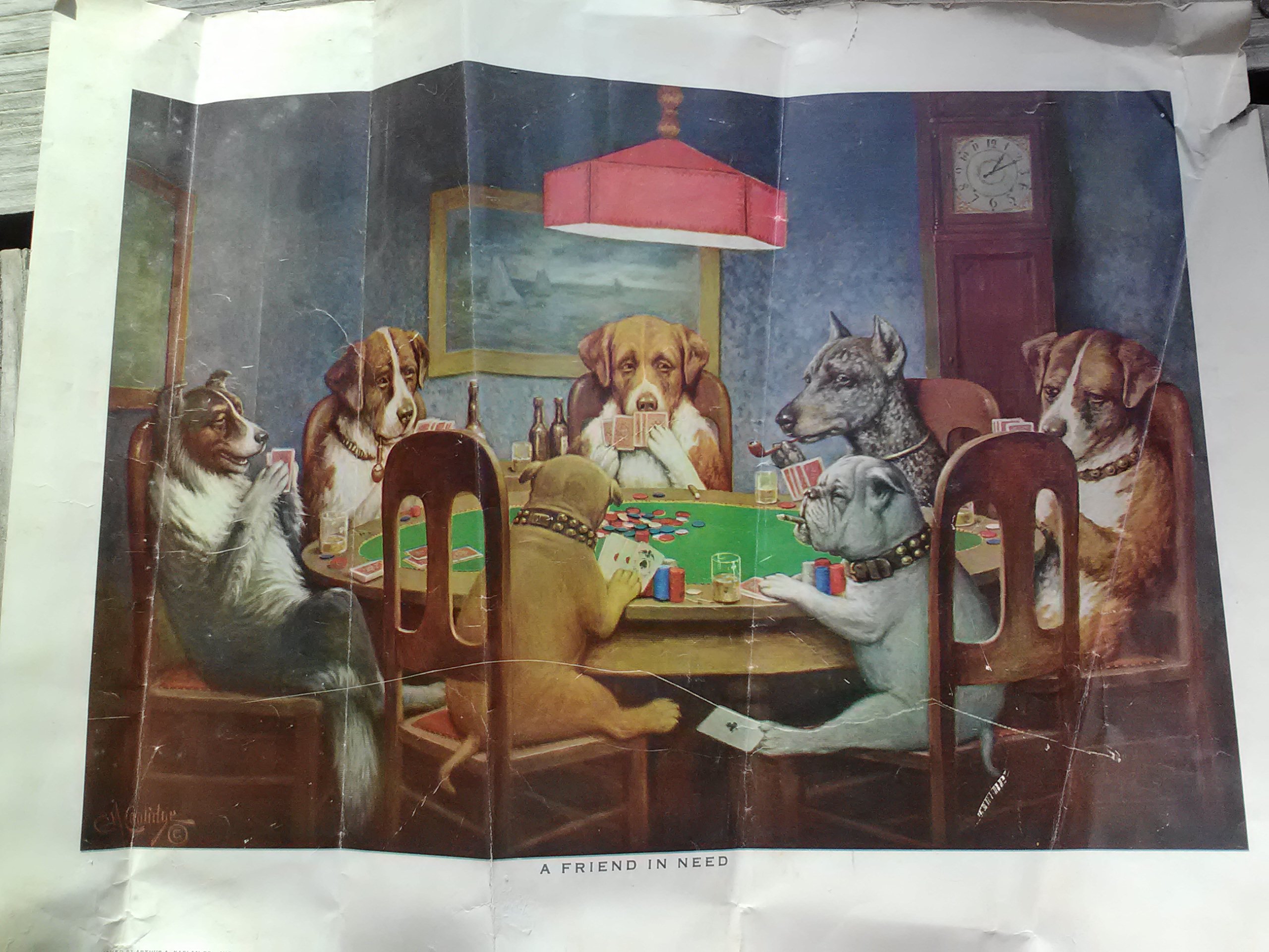 This dogs playing poker print was found in my grandparents house. It is titled A Friend in Need. It has published by Arthur A. Kaplan Co.,INC.,N.Y.C. No.PD 1 in the lower left corner and printed by Brown & Novella Div. of Standard Packaging Corp.,U.S.A. in the bottom right corner.