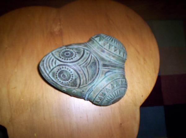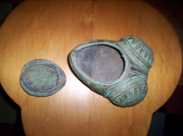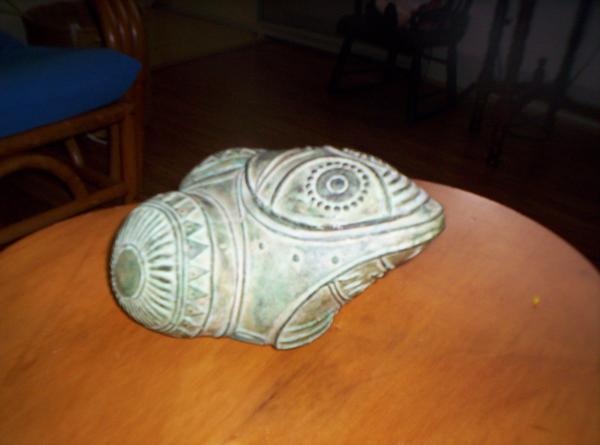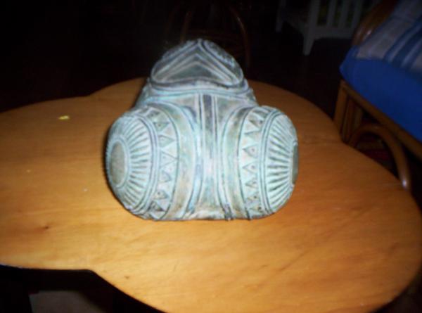 green patina or painted with raised areas of design. The frog head top is removable . The inside is very coarse. Inside the round leg parts are rusty looking filling, but still rounded outside. There are some pin prick holes in it and the bottom where worn appears brass. The inside is hollow.