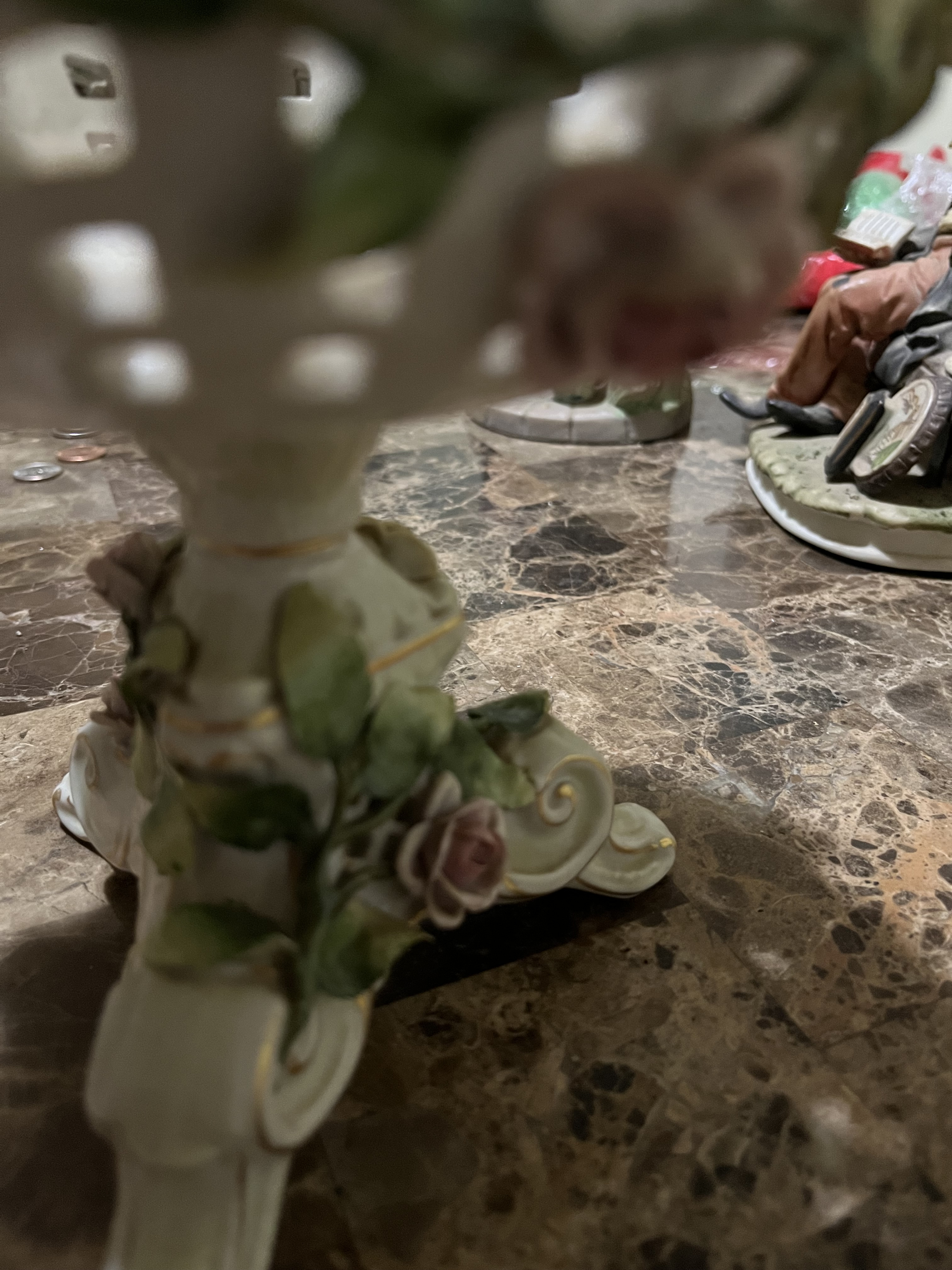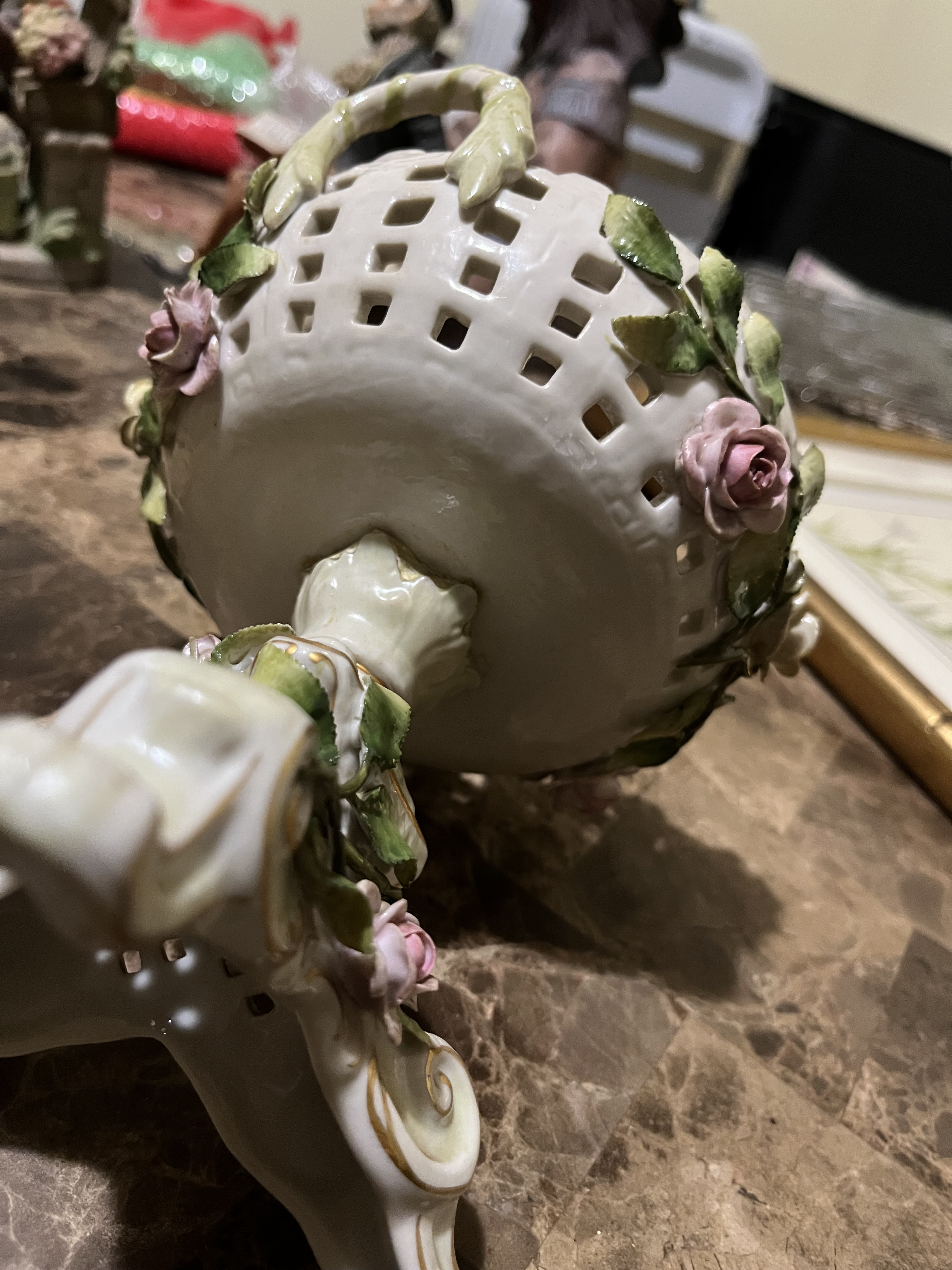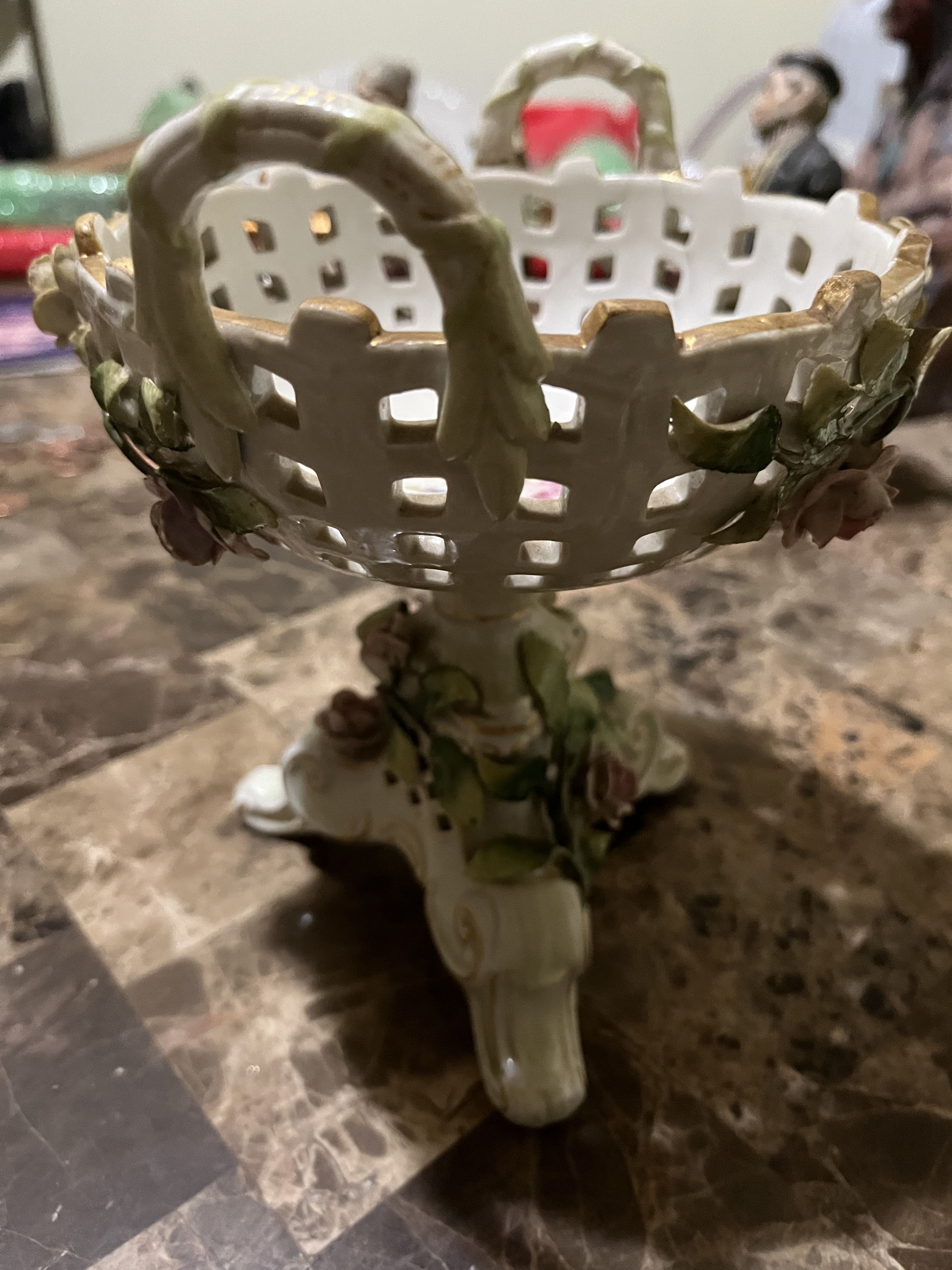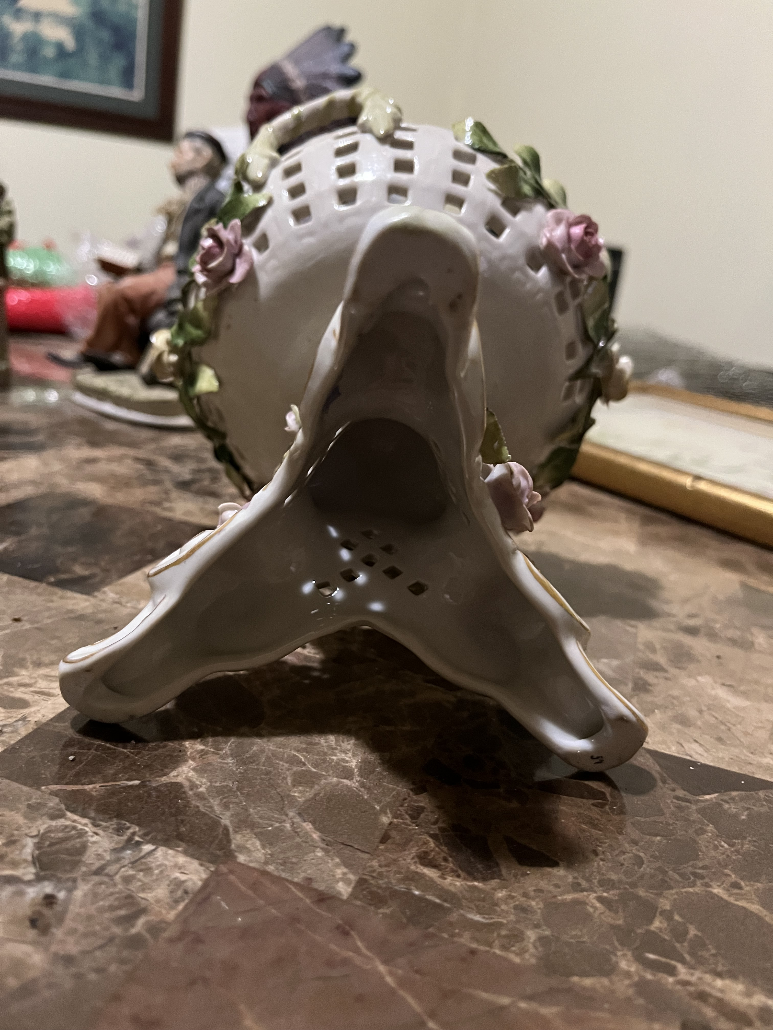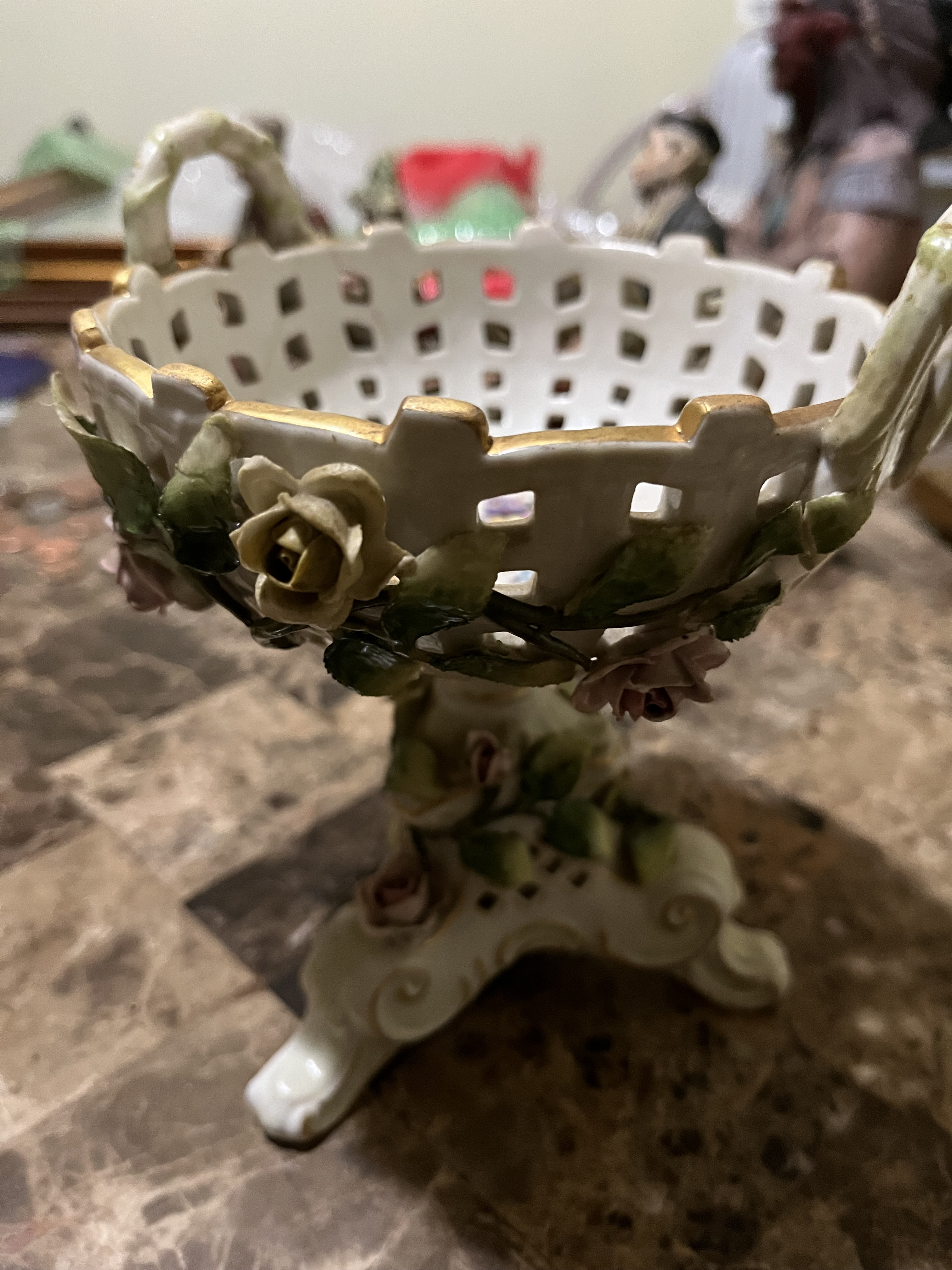 Description My mother recently gave me a few pieces that my grandmother owned for a long time before she passed away (about 15 years ago) so I don’t have any information about the pieces. This appears to be porcelain (maybe just looks like it to me) it’s not very heavy but heavier than it looks, it looks kinda like a basket on a pedestal with roses decorated around it and in it.