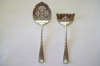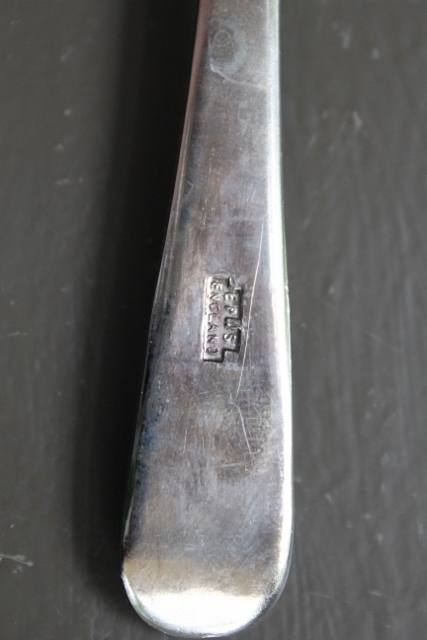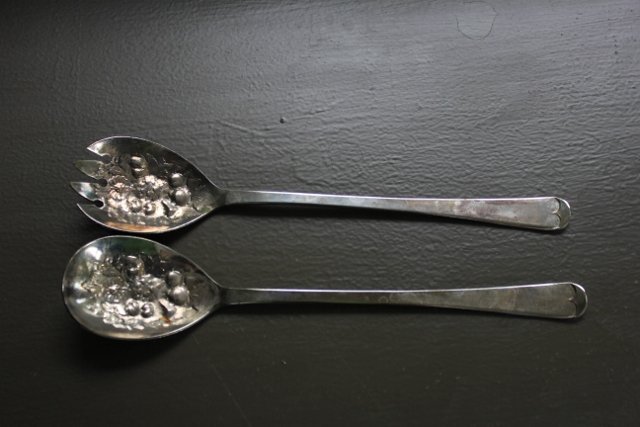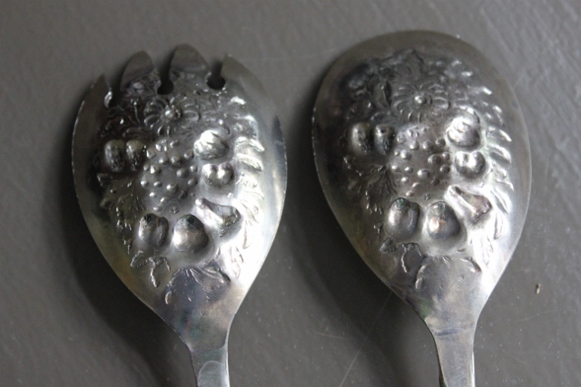 Made in England with markings EP S and the word ENGLAND beneath the letters.  Spoon and Fork are pounded with a fruit pattern.  Length 9 1/4 inches. Weight of pair 3 3/4 ounces approx.
