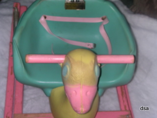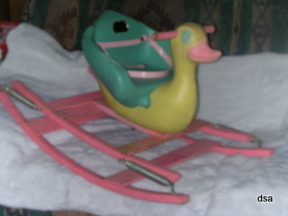 This is a Full Molded Shoofly Duck Teetertot, circa 1964. Teetertot Shooflys were manufactured by the Juvenile Playtime Products division of the Delphos Bending Company from 1945 to 1979. There was very little change made to them during their production years and no date was stamped on the products to indicate the year they were manufactured. We believe this Teetertot was manufactured in 1964 because the front of their 1964 catalog shows similar Ducks announcing "two new delphos ducks, full molded, beautiful plastic shooflys..." Generally a shoofly had flat sides shaped like animals with a bench type seat in between. The only difference between this duck and the one on the front of the catalog is the small duck on the catalog did not have the springs and rockers, just the rockers.