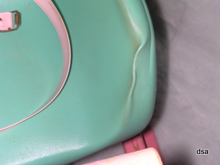 It appears this duck got hot at one point and melted two small indentions in the tip of the wings. This can be seen in the pictures. It also pebbled the forehead of the duck. However there is no discoloration of the paint. The seat belt is still intact which is amazing, to us, since these are usually the first things to go. There are two small cracks under the seat of the duck as shown in the pictures. The label is still on the duck. It is in great condition. Especially for a plastic toy that is 46 years old. Must bave been kept indoors all the time. We have been unable to find another shoofly duck like it.