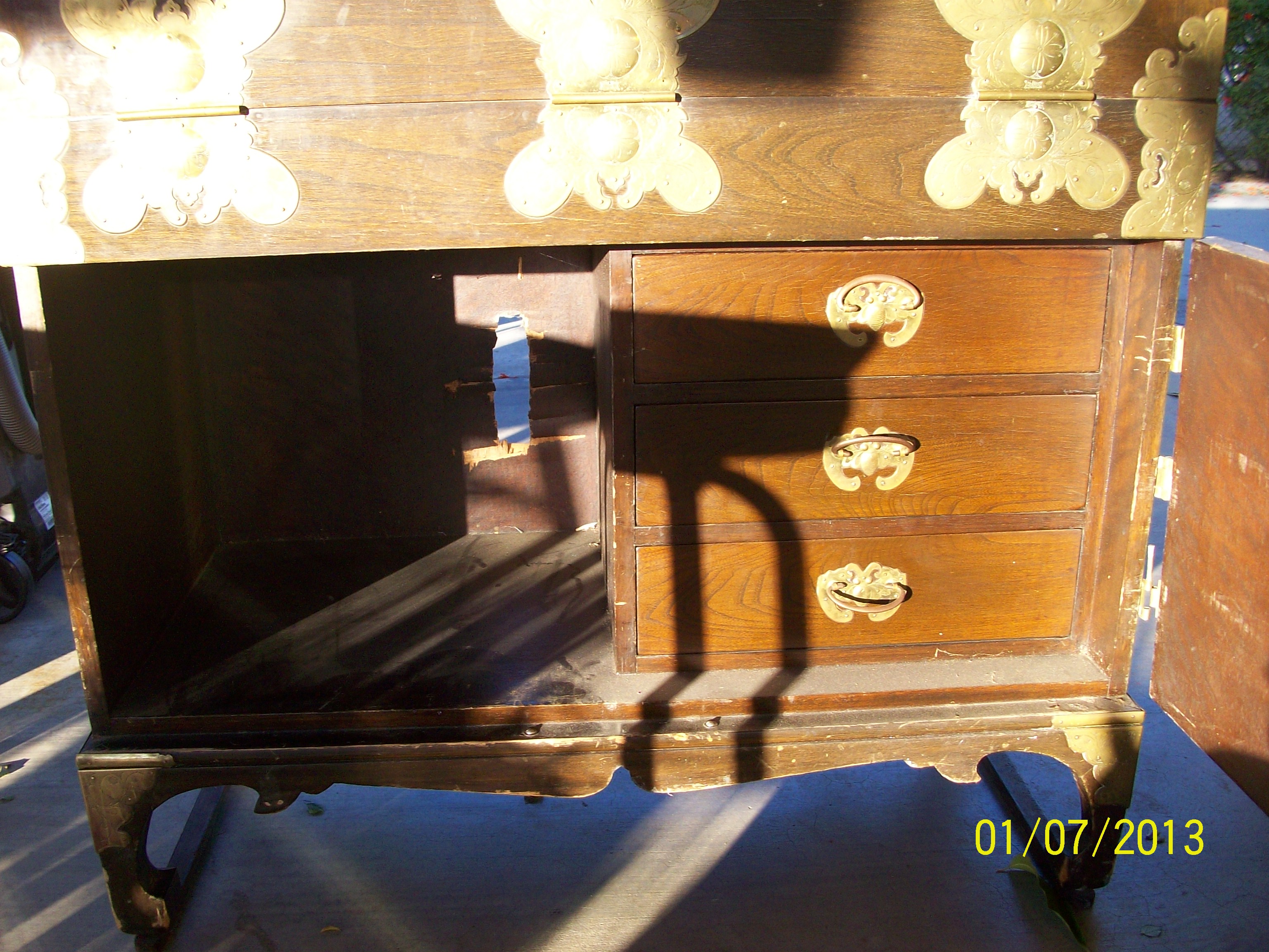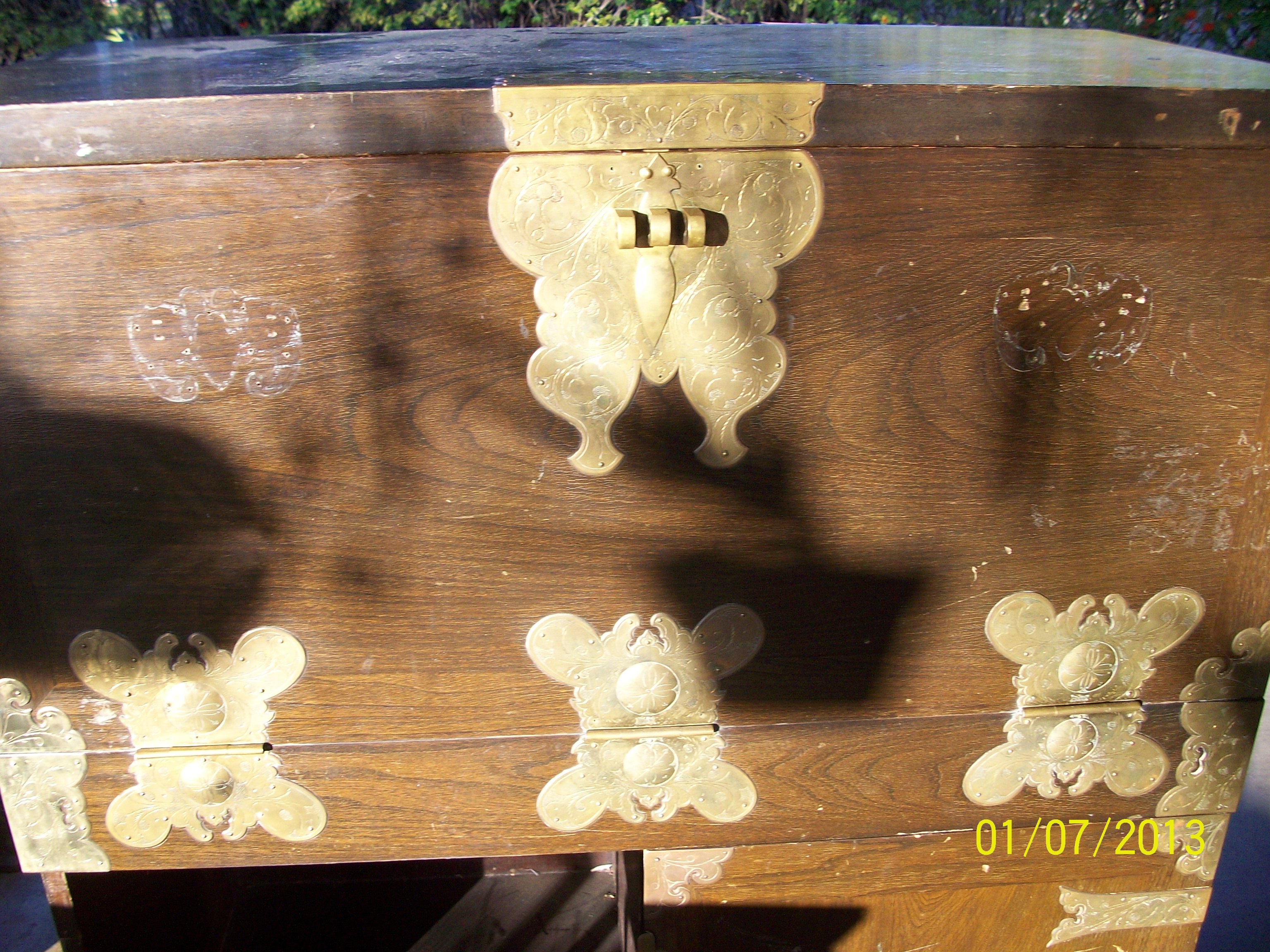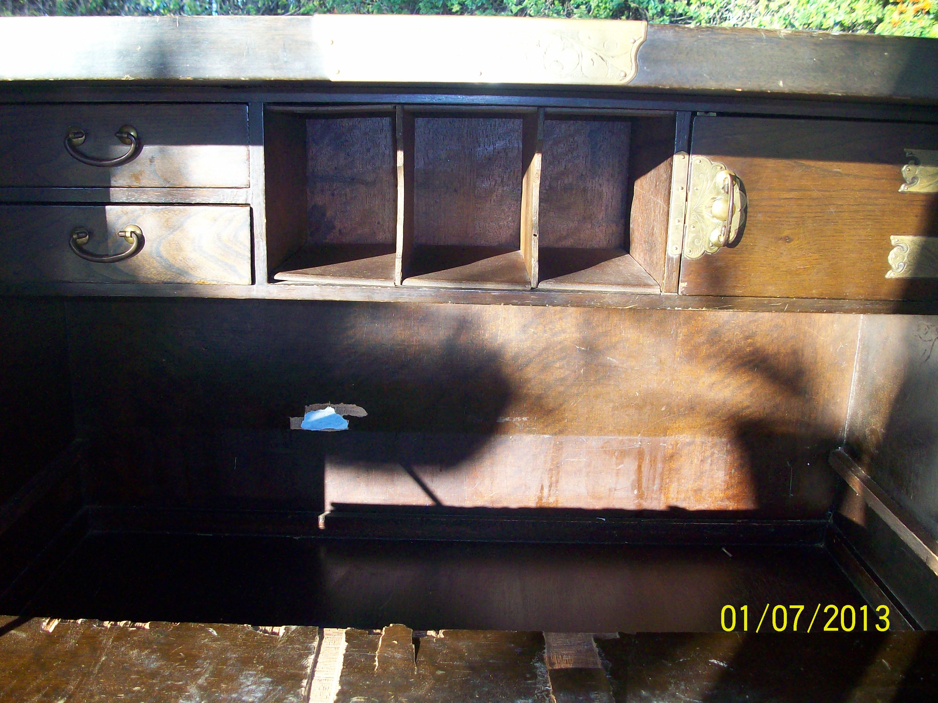 i have come across what to me looks llike an antique "secretary desk". i am not quite sure. The piece of furniture has a lot of brass on the front for hinges and handles but the ones that stick out are thin brass bumble bees on the very front piece that folds down.