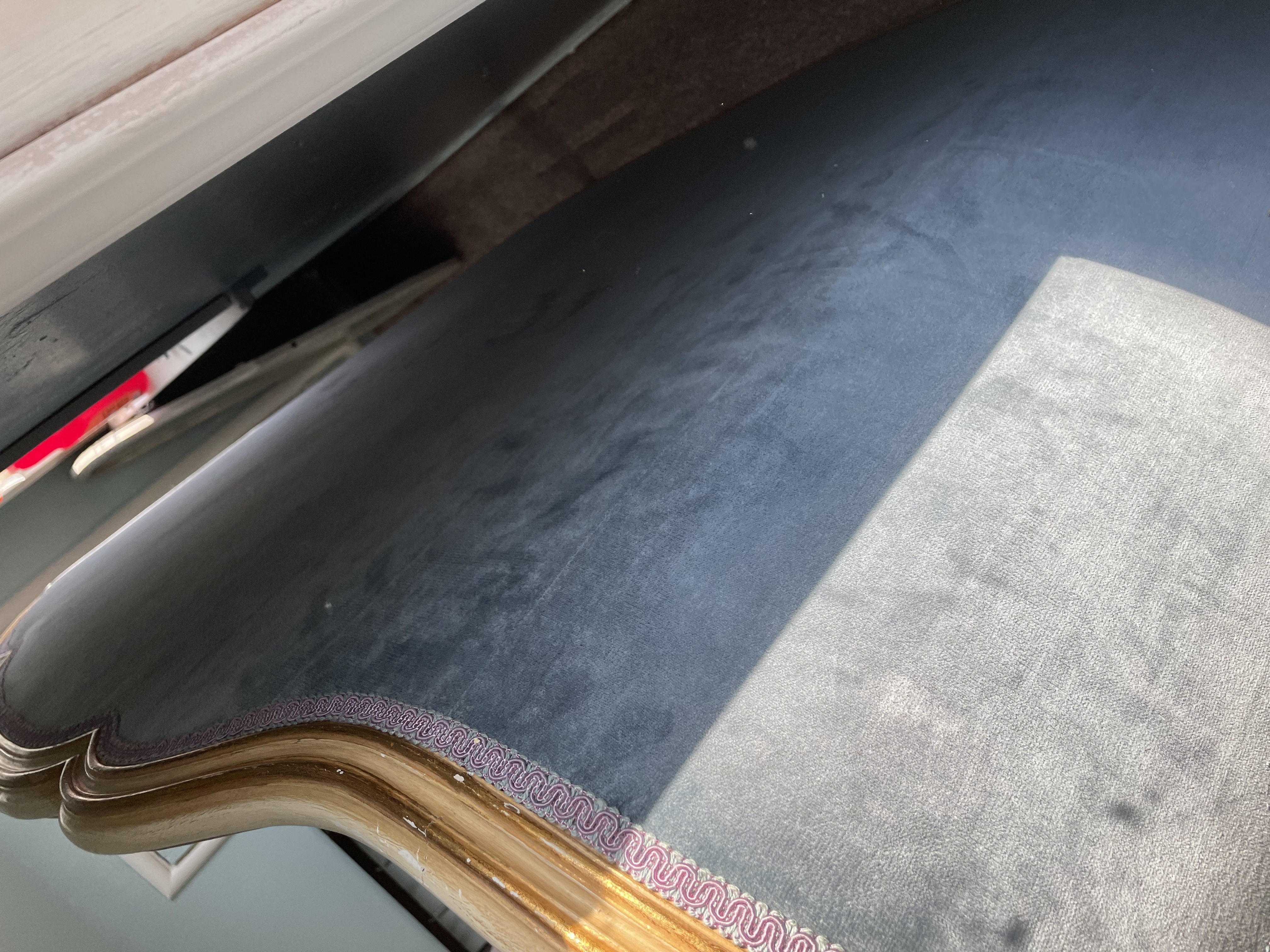 It is velvet and plush cover, has Purple lace type around the head frame. The frame looks gold in color And gold flower on top of frame