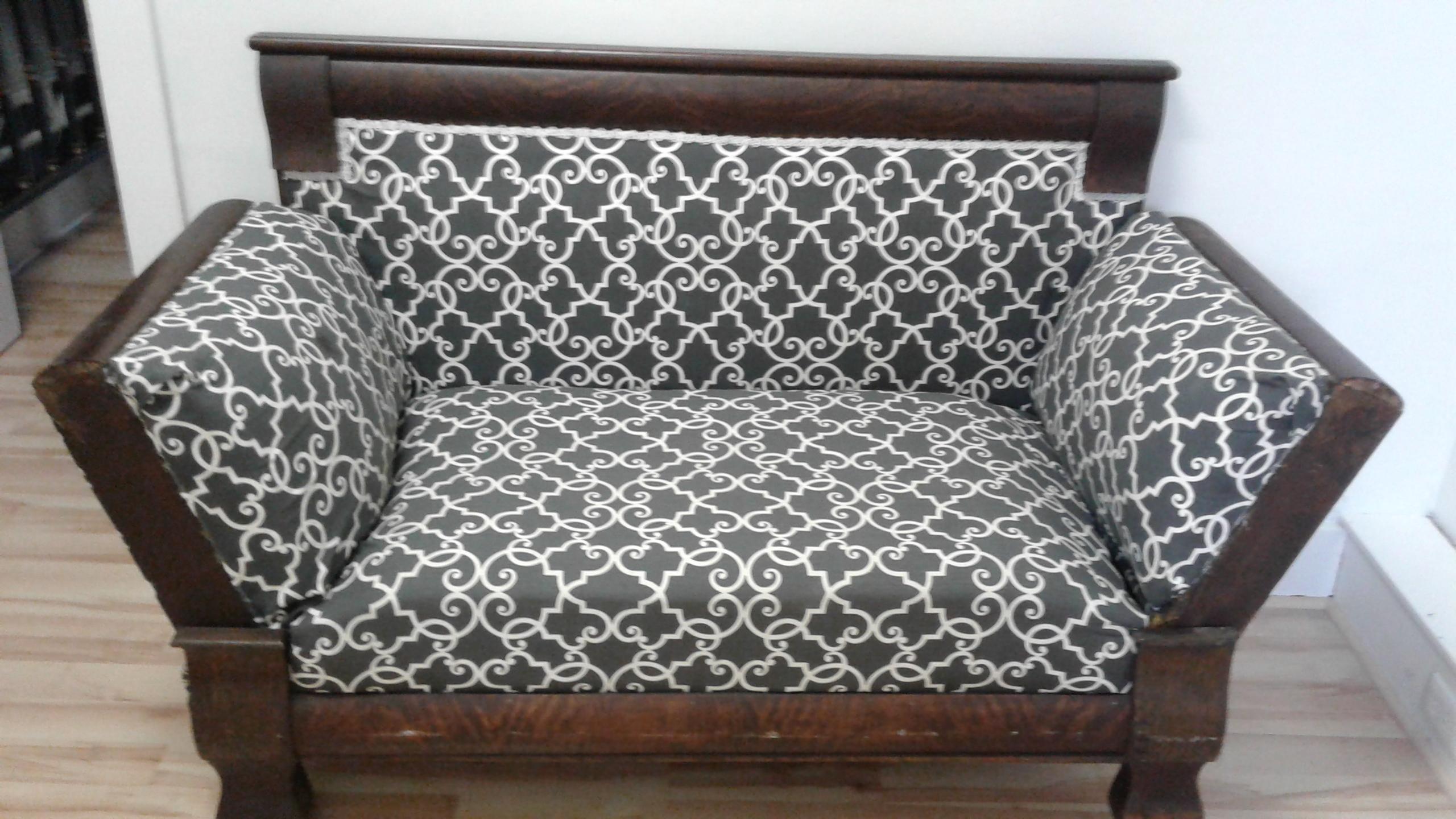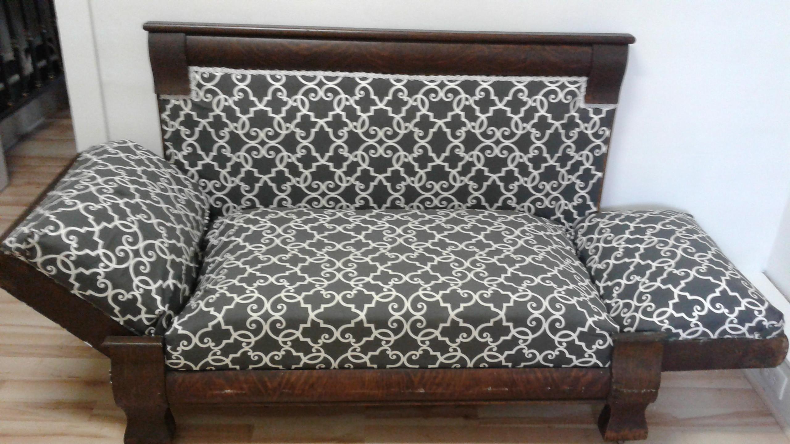 I purchased this from a store in Indiana that is no longer in business. It originally was covered with leather, but the owners wife reupholstered it. The armrests are 100% adjustable and the back can be removed. I'm guessing it was made in the 1920s and was considered a futon (???). I tried doing research on it and got pretty much nowhere fast. Any help on the style, worth, proper name, would be greatly appreciated.