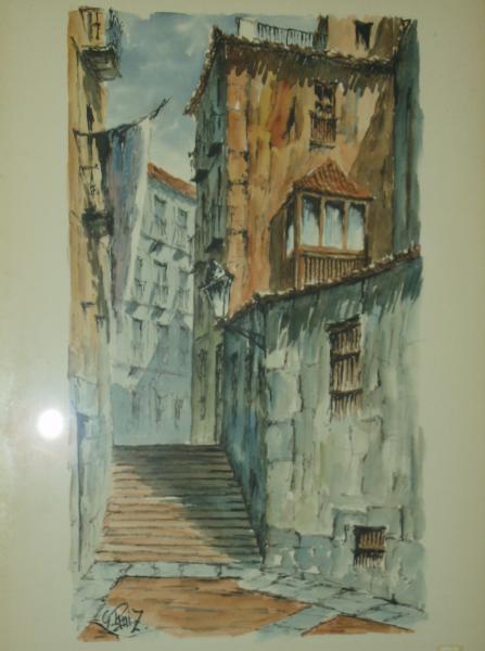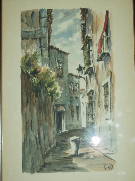 A pair of watercolors, it appears to be a painting of Italy or Spain, old city view, cobblestone streets, balcony and back alley walkways.