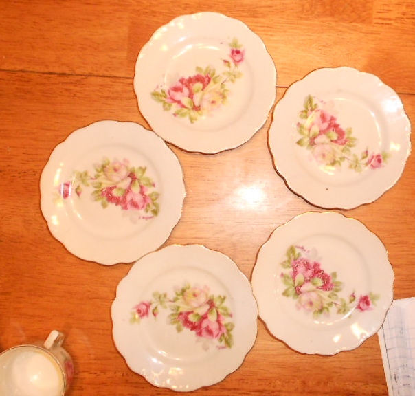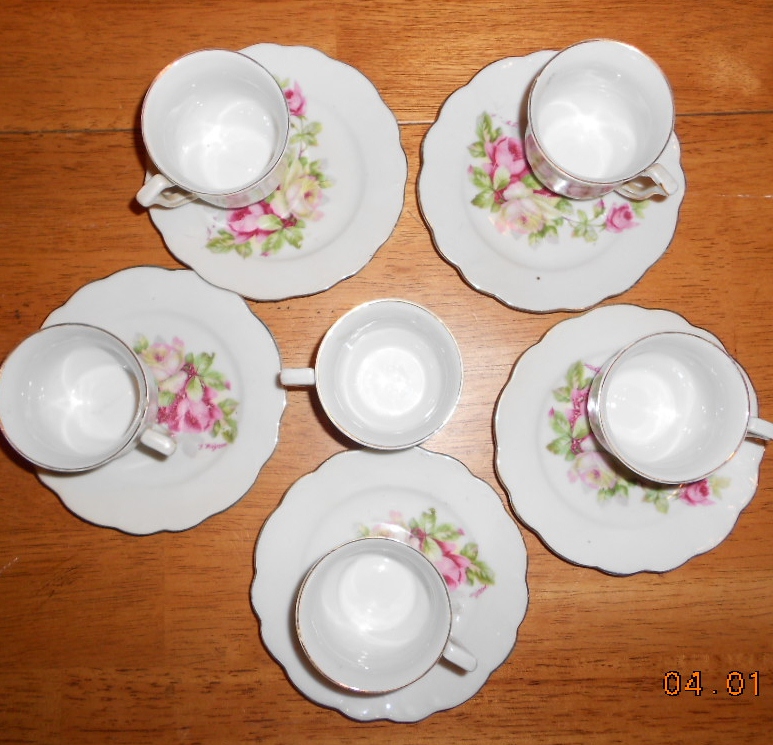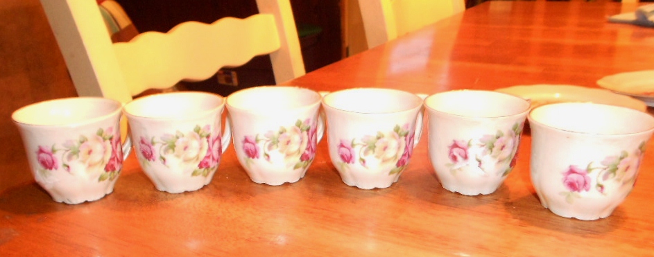 each piece has hand painted roses on them. no 2 are alike (the roses are different on each piece). the saucers are a little over 5" across, cups are a little over 2" high & they all have gold trim on them.