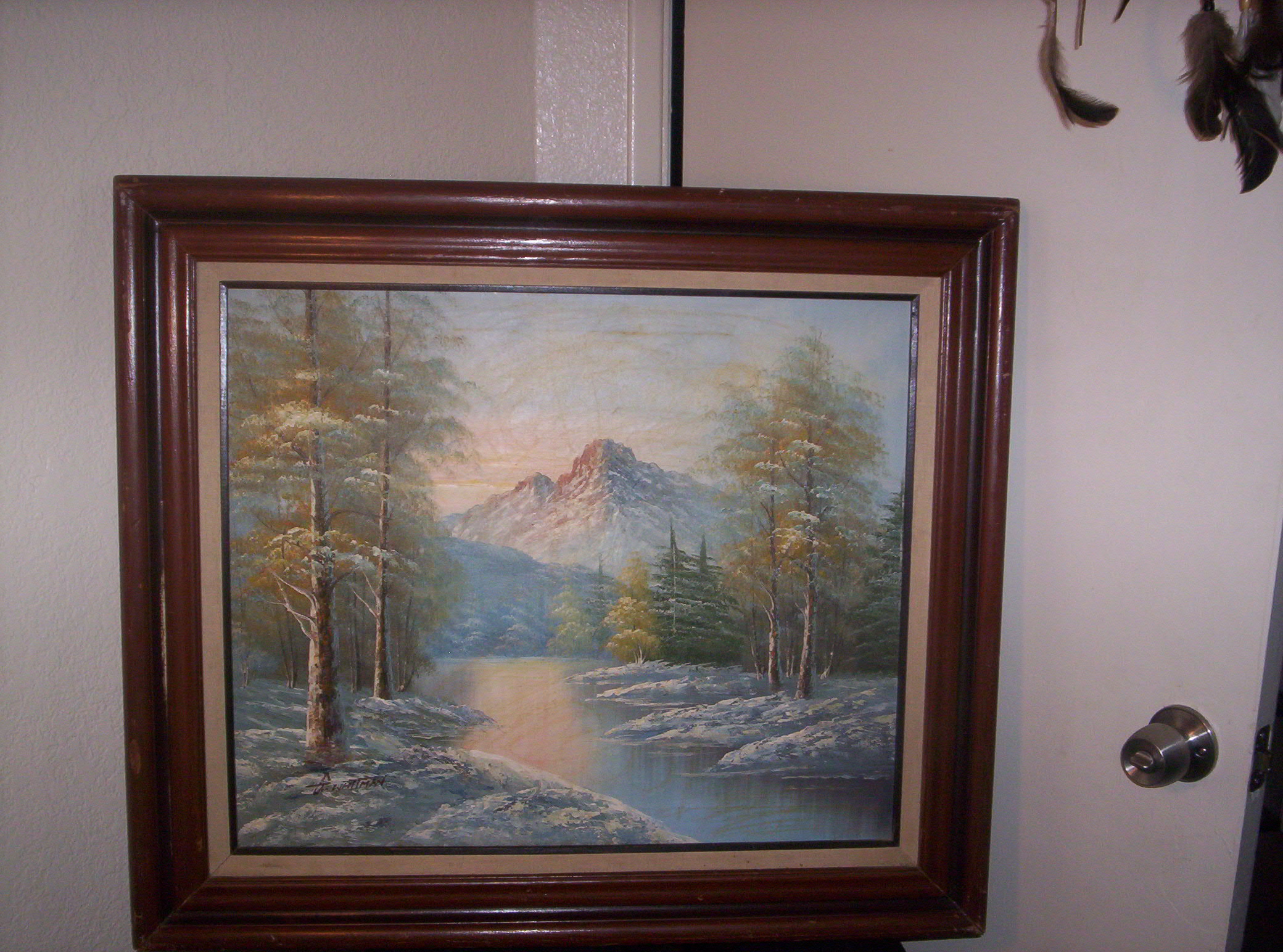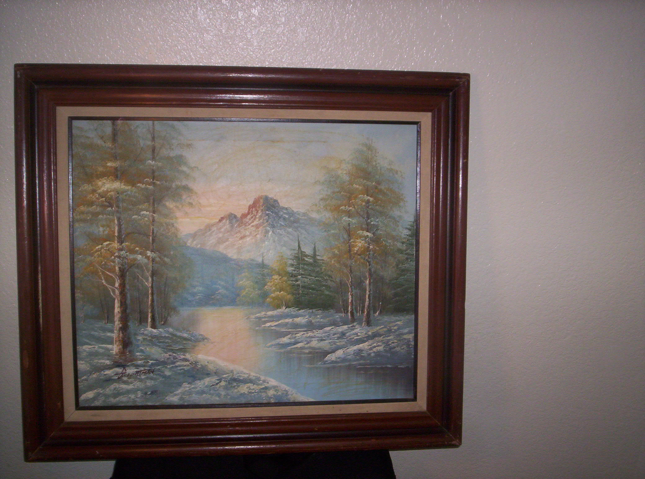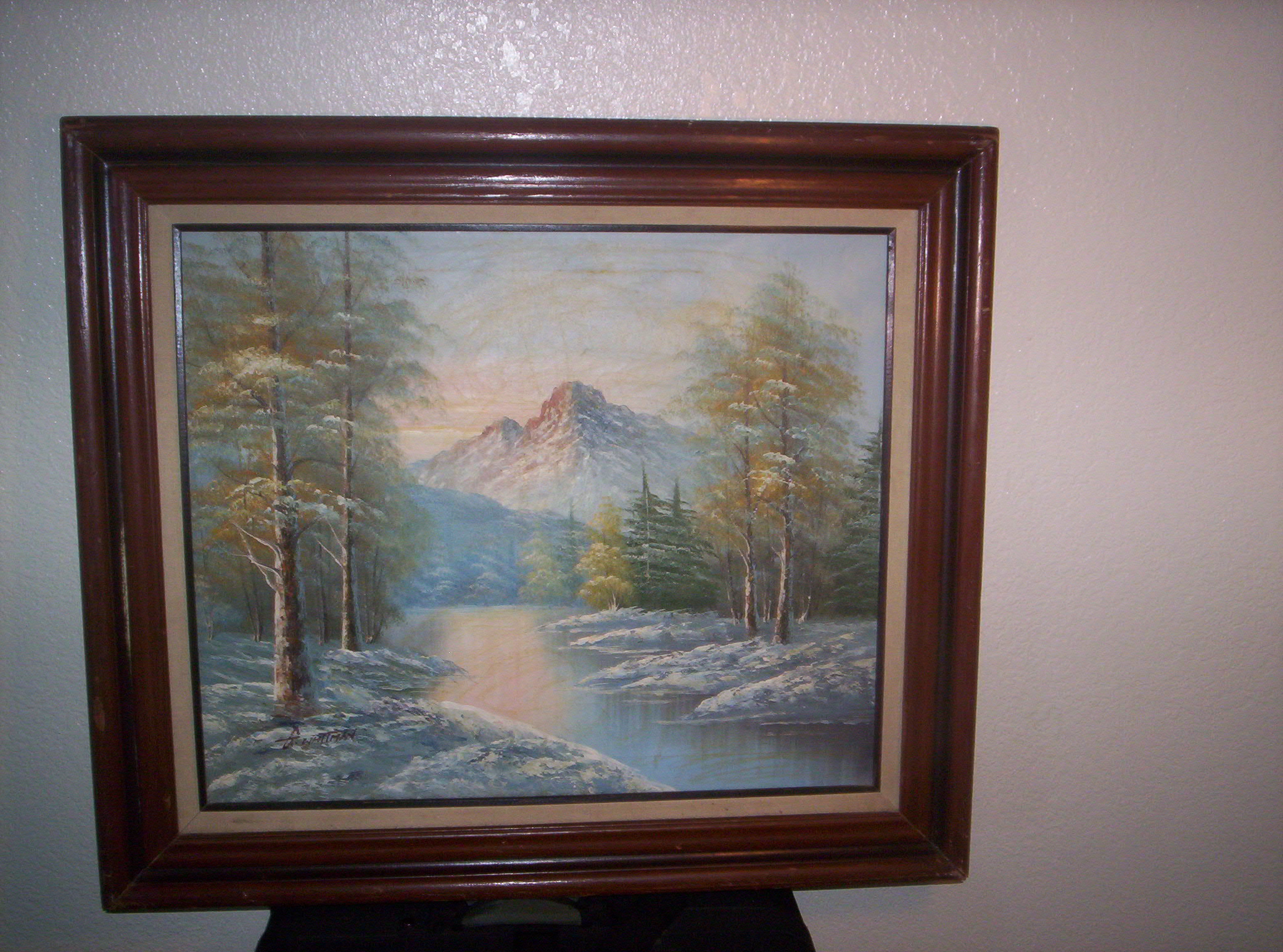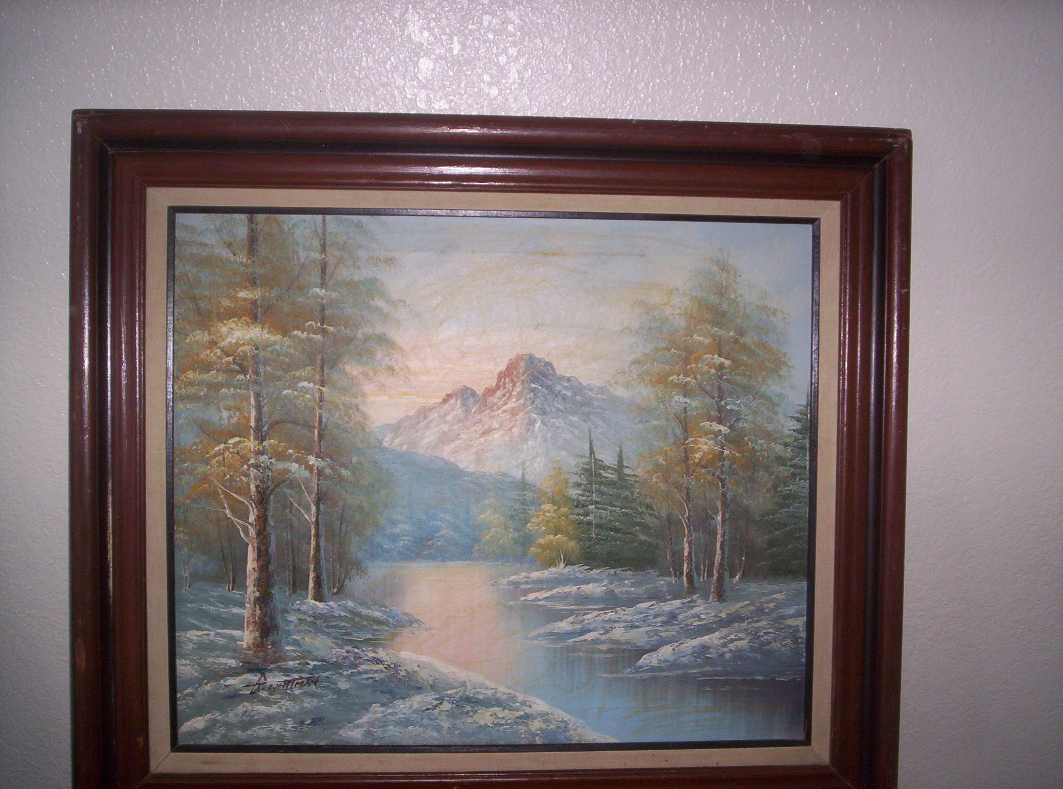 Artist signature in bottom left corner-signed G. WhiTman, the T is capitalized, scene is of Mt. Carmel snow covered landscape with trees on both sides and river in middle and Mt. Carmel in distance.