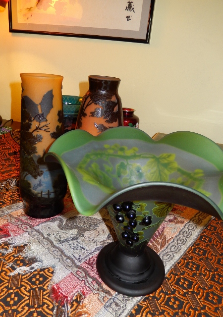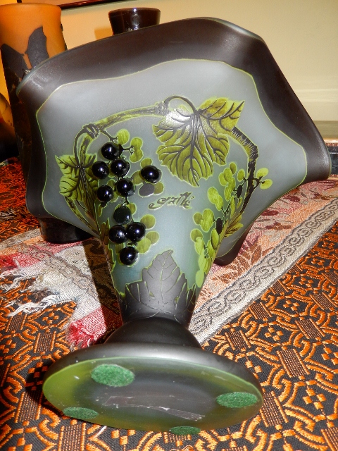 Cameo acid etched glass with signed Galle acid etched no underline. Very dark green maybe black to light green color. Black grapes apper to be hot work applied but some of the grapes have been glued on very poorly with excess glue smeared on the glass. I have some concern as to the authenticity, any comments appreciated.