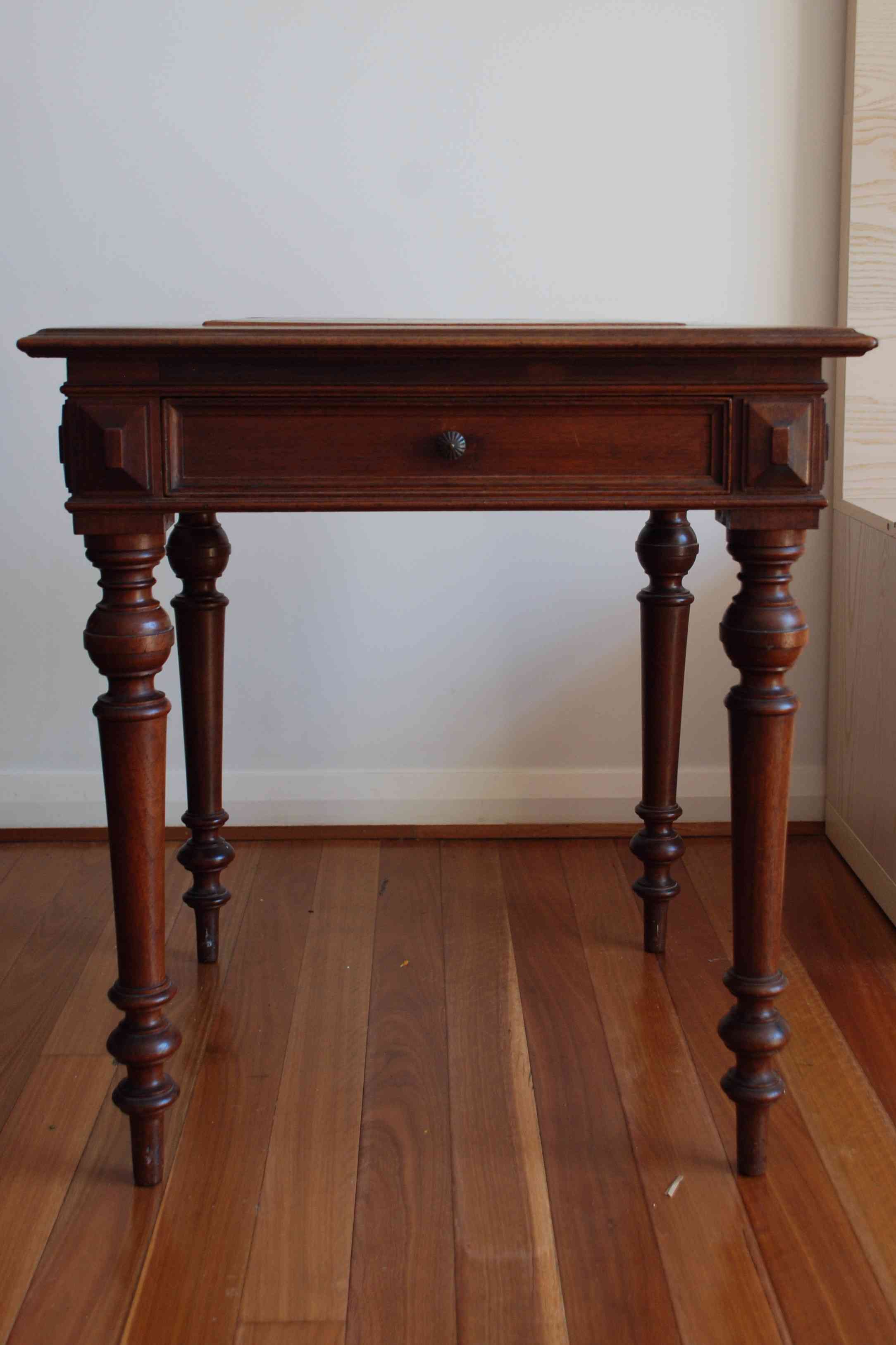 Games table with square tiles that are "levered" out from a square inset on the top of the table. The squares are double sided. One draw for games pieces etc. After lifting out the two wooden "squares" the last is a green felt back gammon board.