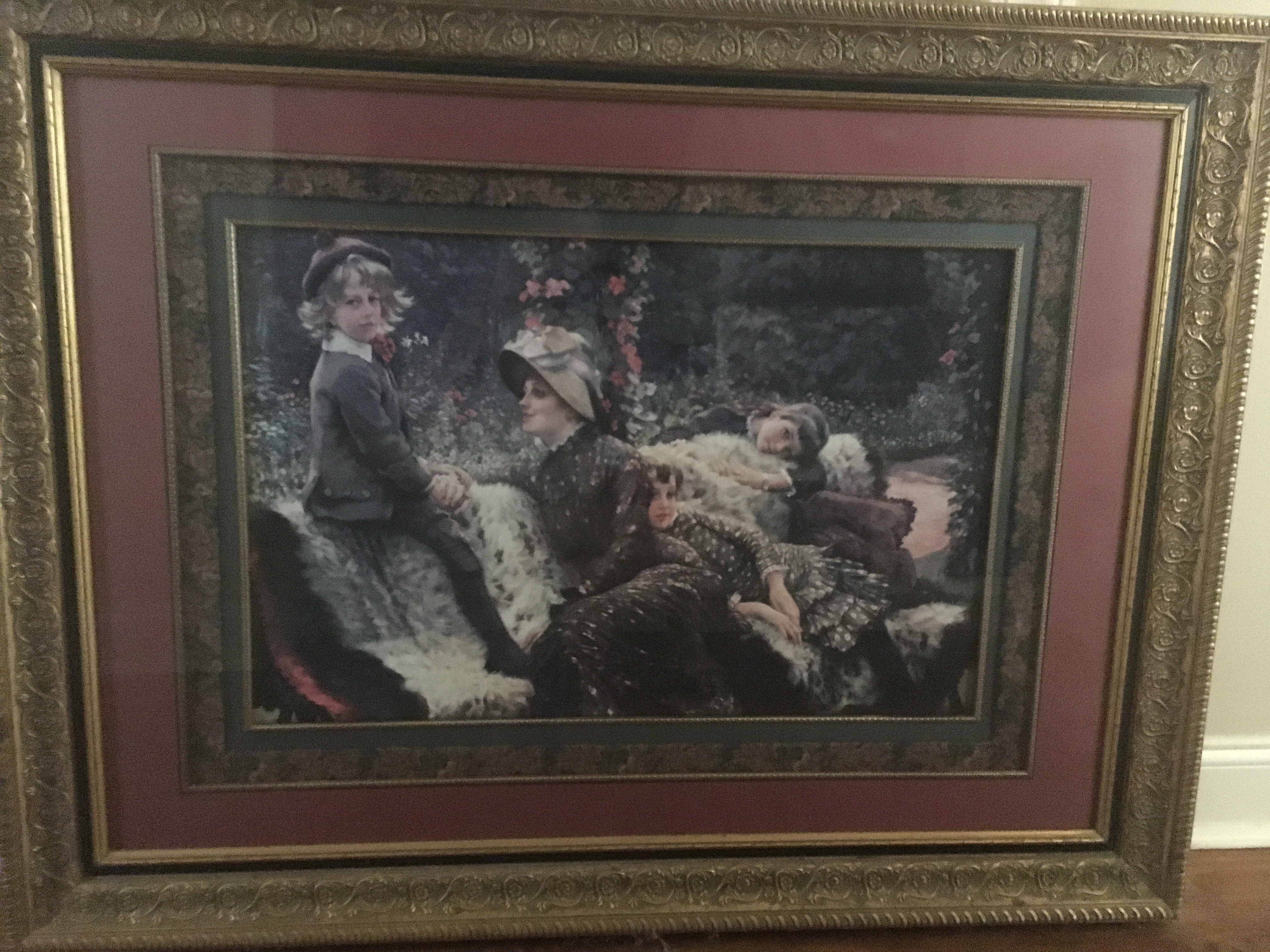 Framed piece by James Tissot. Purchased several years ago.  19”x28” (inside of mat’s).  36”x47” frame. Solid wood painted antique gold. Triple matted with antique gold trim on two mats. Purchased from retail store.  Curious as to whether or not it has any value and if anyone has information that would be useful in selling.