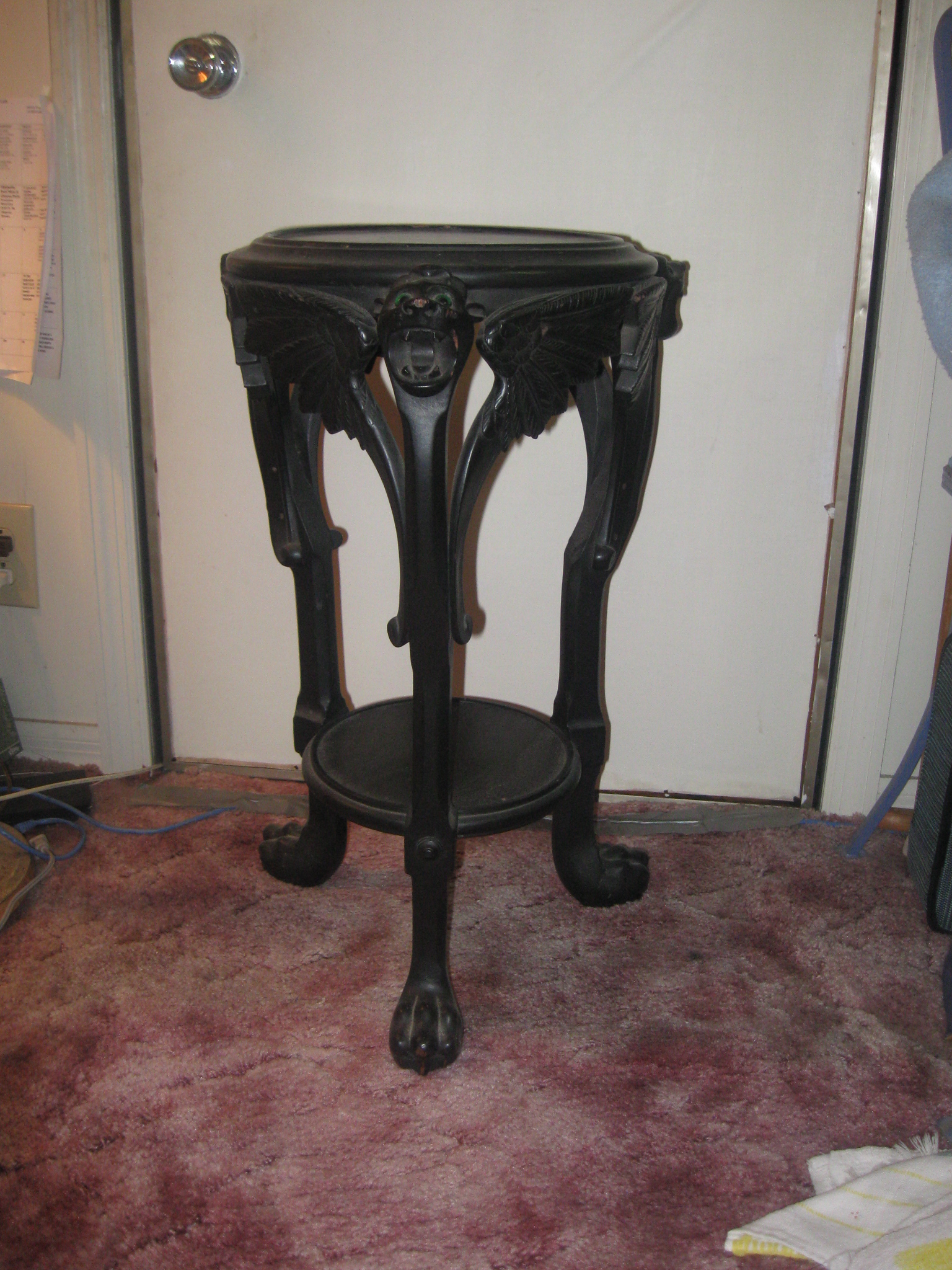 I would seek the advice of a local furniture expert if another member here doesn't know what exactly you have. It appears to be carved ebony, with an asian motif but a european (Italian/German) design. A very odd and interesting piece. I have seen tripod pedestals go anywhere from a few hunded dollars into the thousands and quite frankly am unsure where in the spectrum this piece lies. Again it would benefit from an in person inspection or a lookover by someone more familiar with fine furniture.